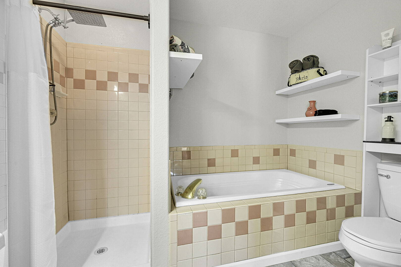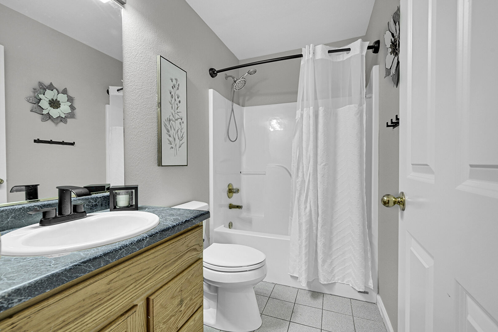 Full Bathroom, Textured Wall, Tile Floor, Vanity, Combined Bath Shower