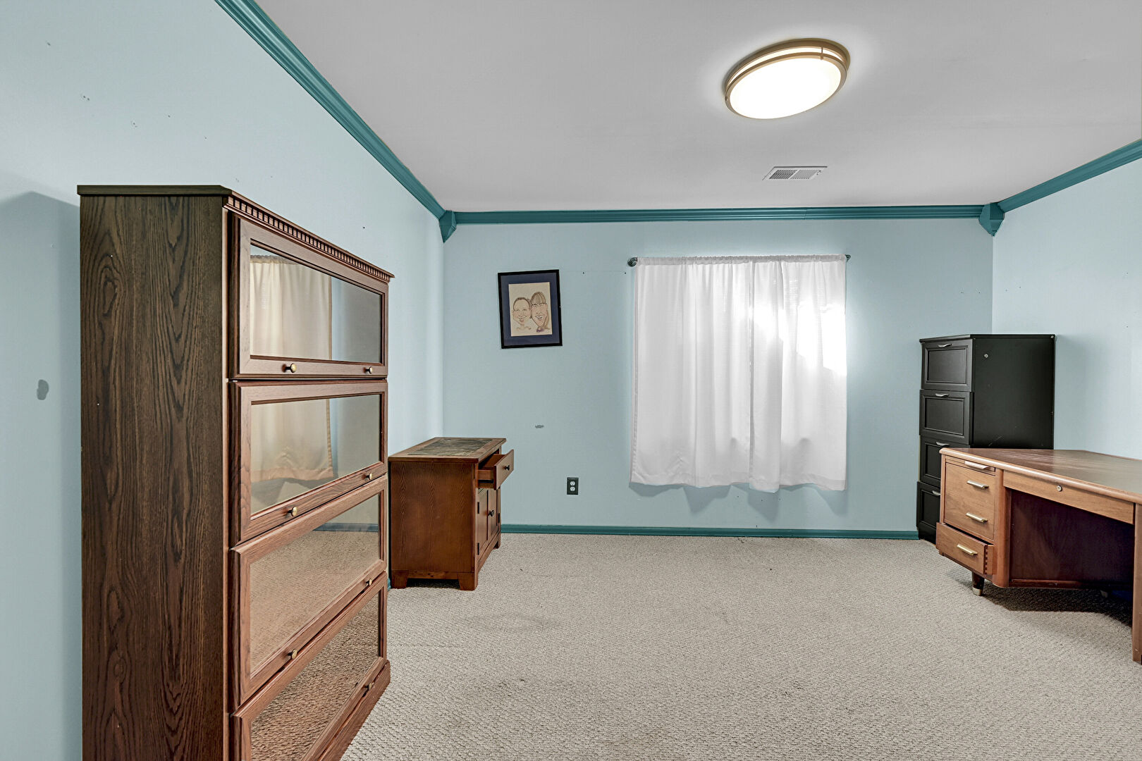 Baseboards Wall, Carpet, Crown Molding, Drywall, Office Area, Vent, Drywall, Natural Light