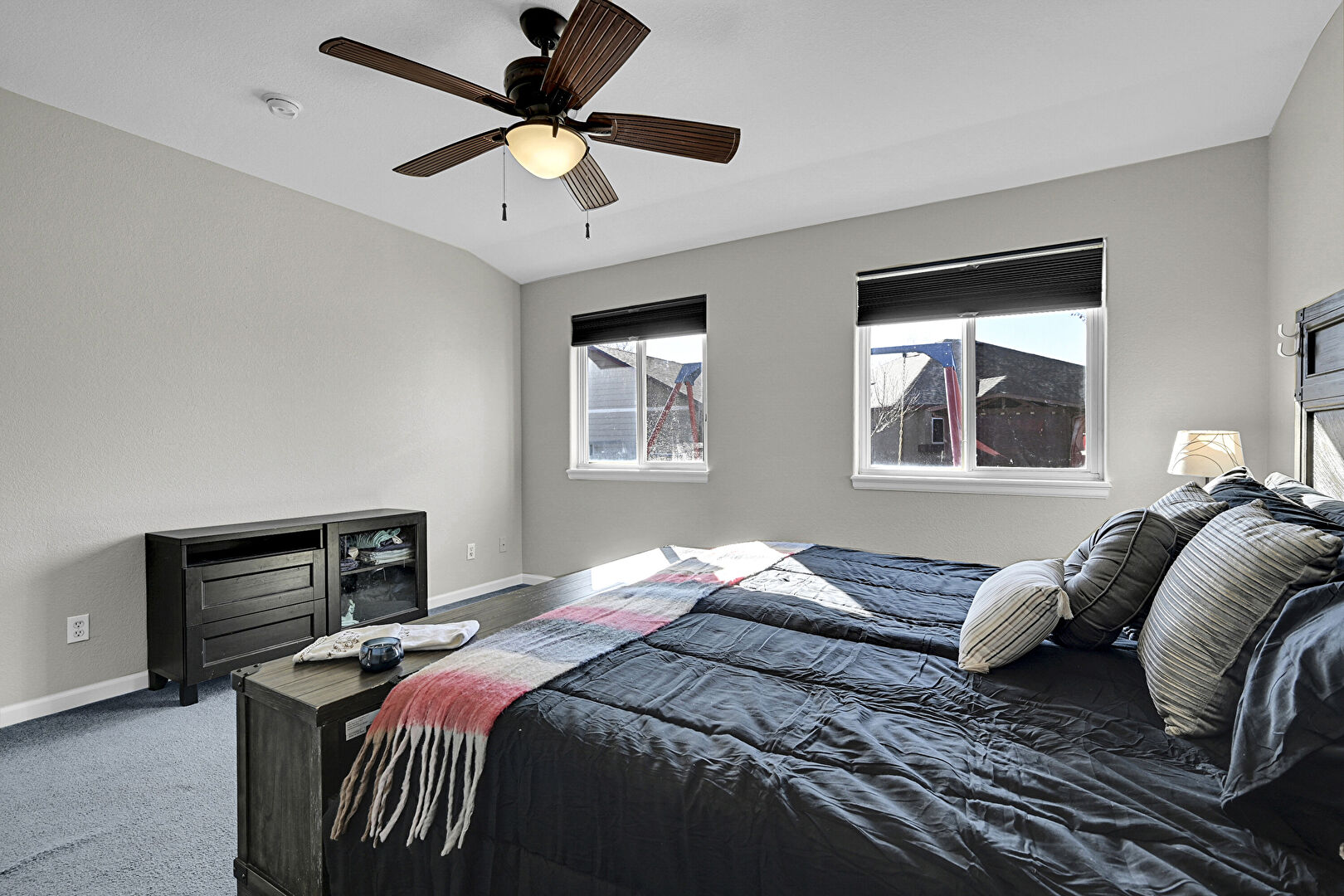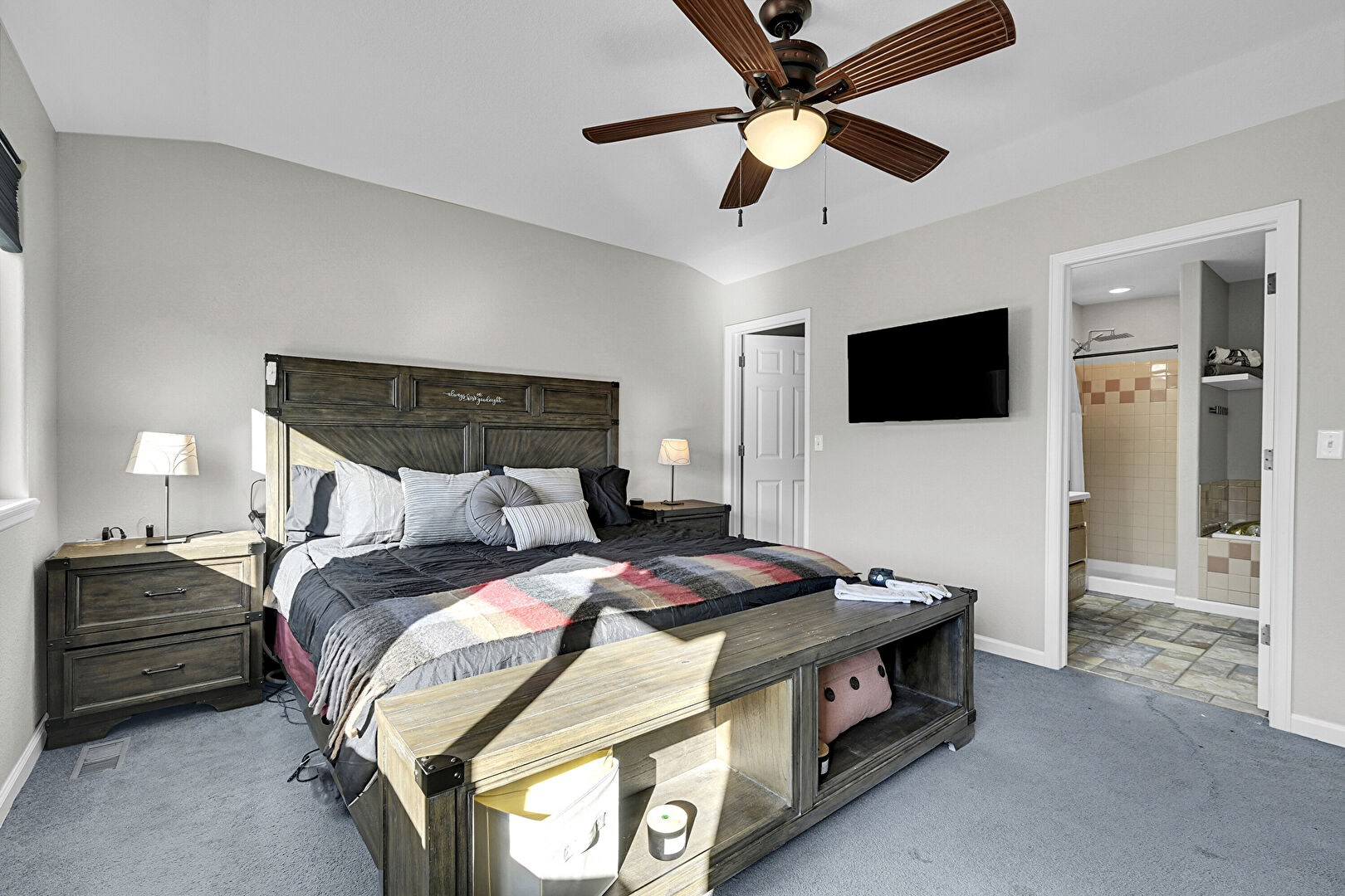 Baseboards Wall, Carpet, Ceiling Fan, Drywall, Ensuite Bathroom, Natural Light, Smoke Carbon Monoxide Detector, Vaulted Ceiling, Vent, Ceiling Fan, Natural Light, Vaulted Ceiling, Wood Finish Floor
