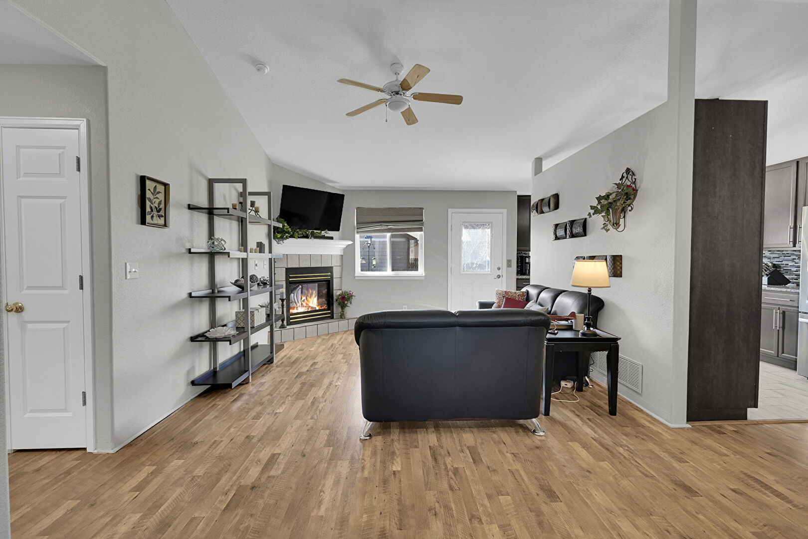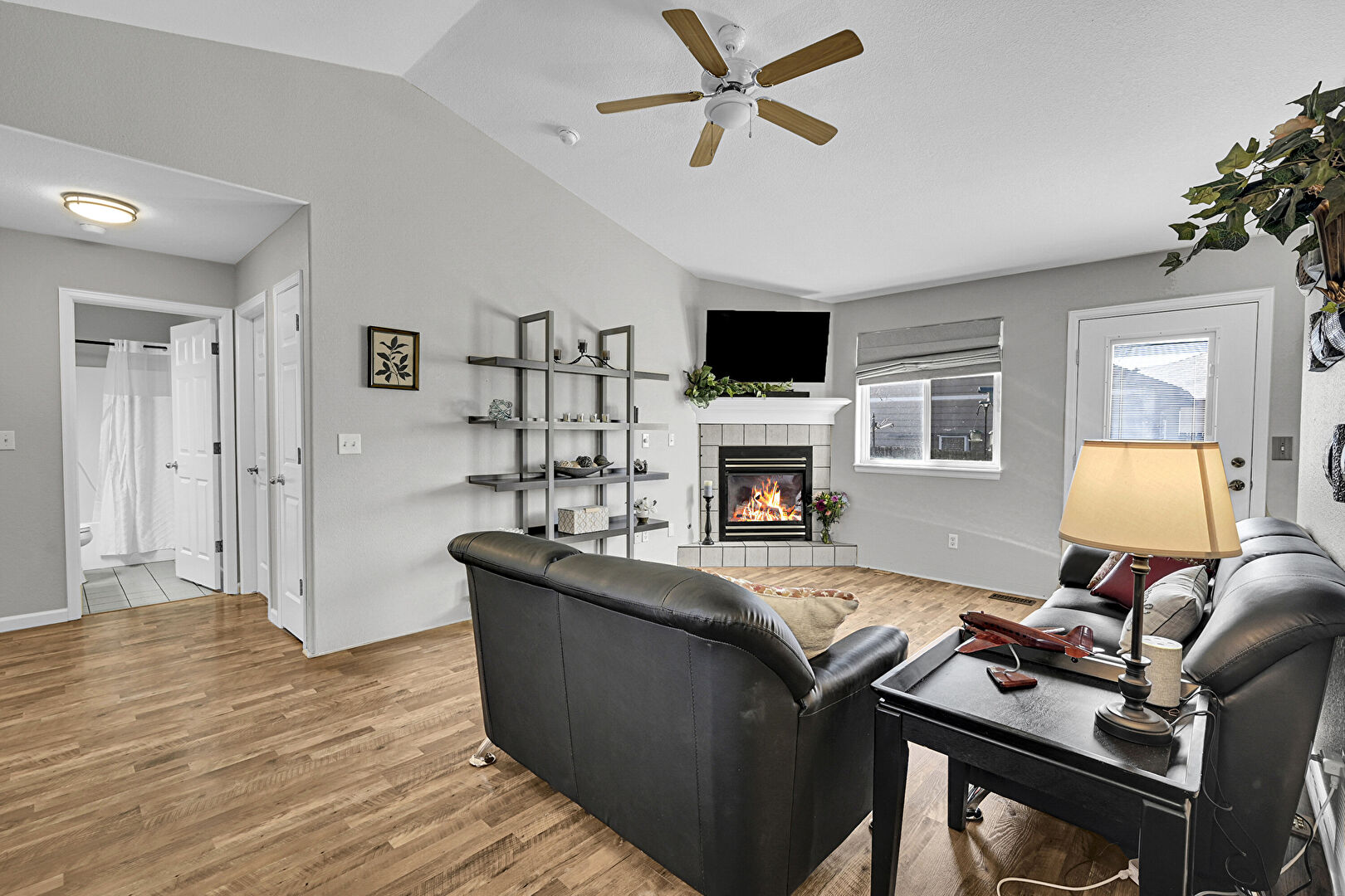 Baseboards Wall, Cathedral Ceiling, Ceiling Fan, Drywall, Fireplace, Natural Light, Vaulted Ceiling, Vent, Wood Finish Floor, Cathedral Ceiling, Ceiling Fan, Fireplace