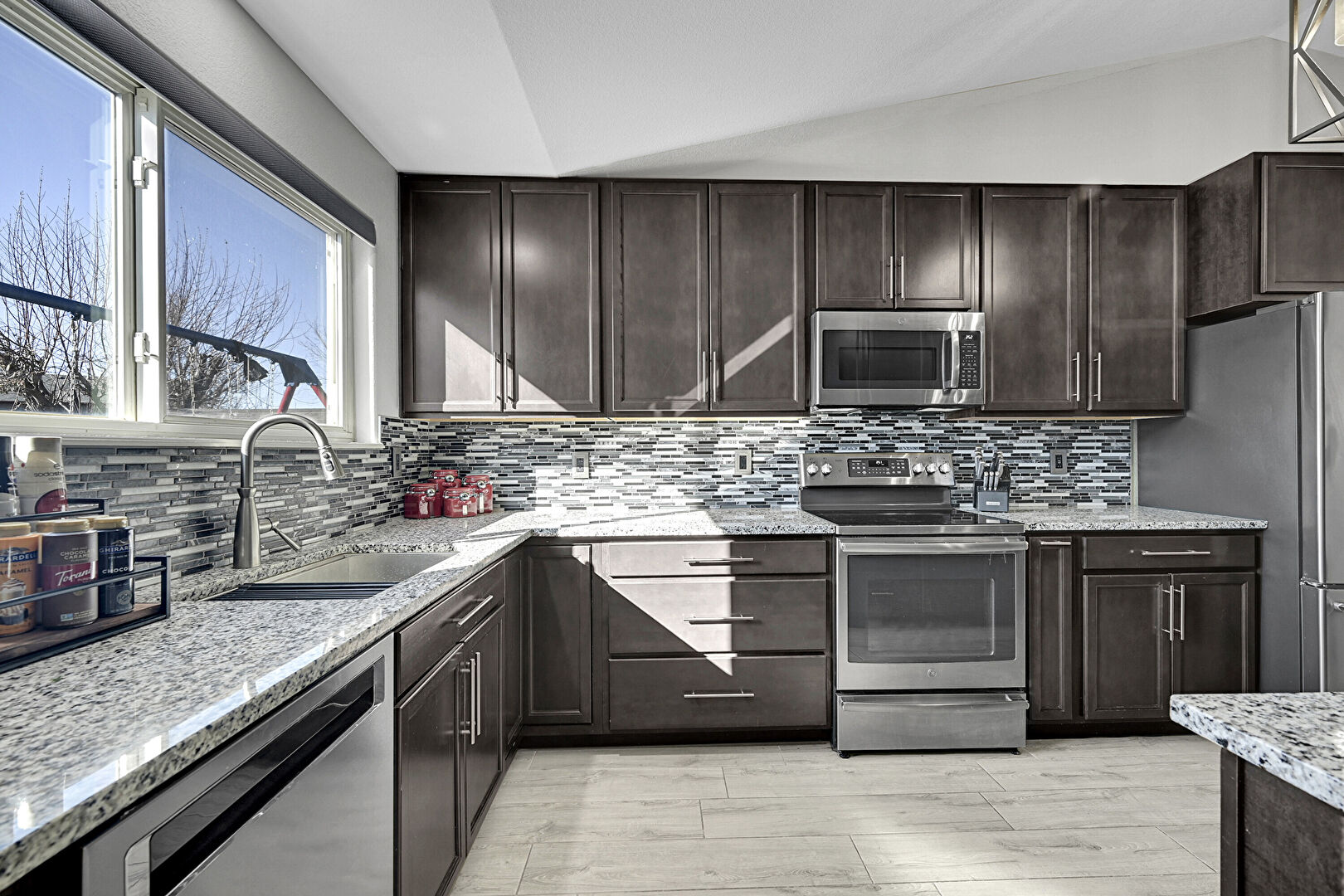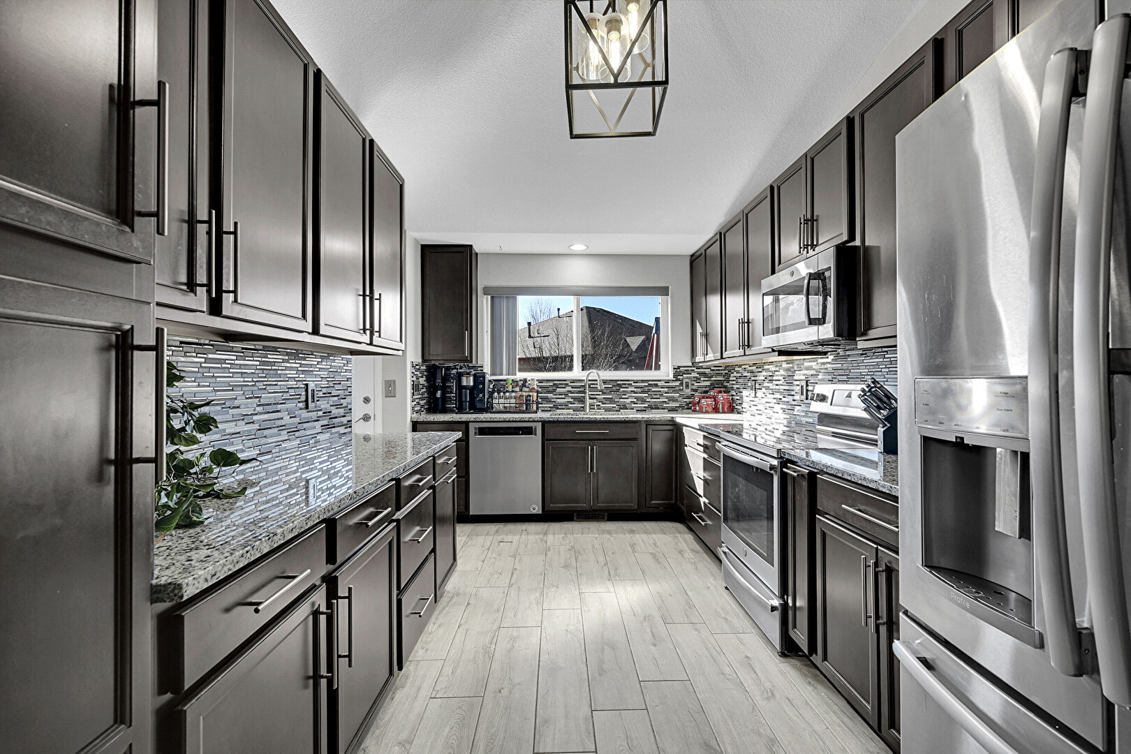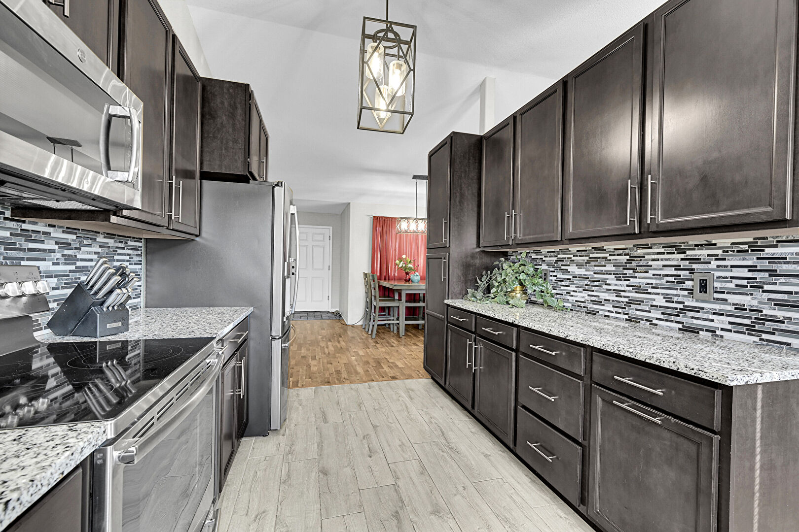 Black Cabinets, Dark Brown Cabinets, Drywall, Natural Light, Pendant Lighting, Recessed Lighting, Shaker Cabinets, Stone Countertops, Wood Finish Floor, Notable Chandelier, Stone Countertops, Vaulted Ceiling