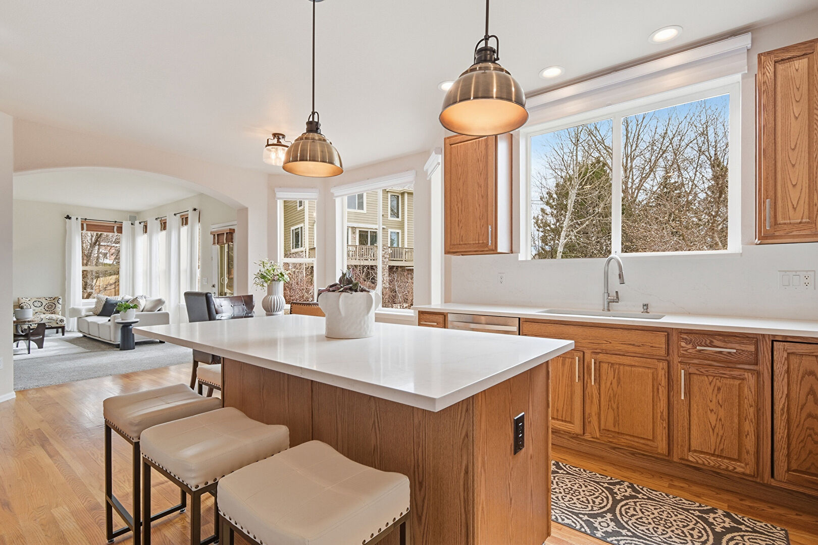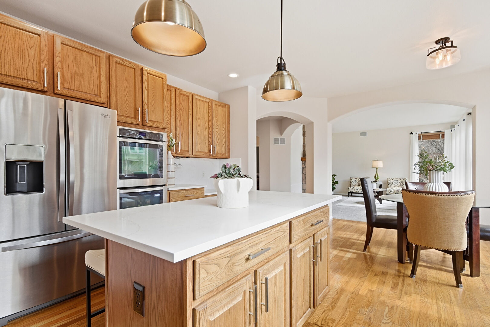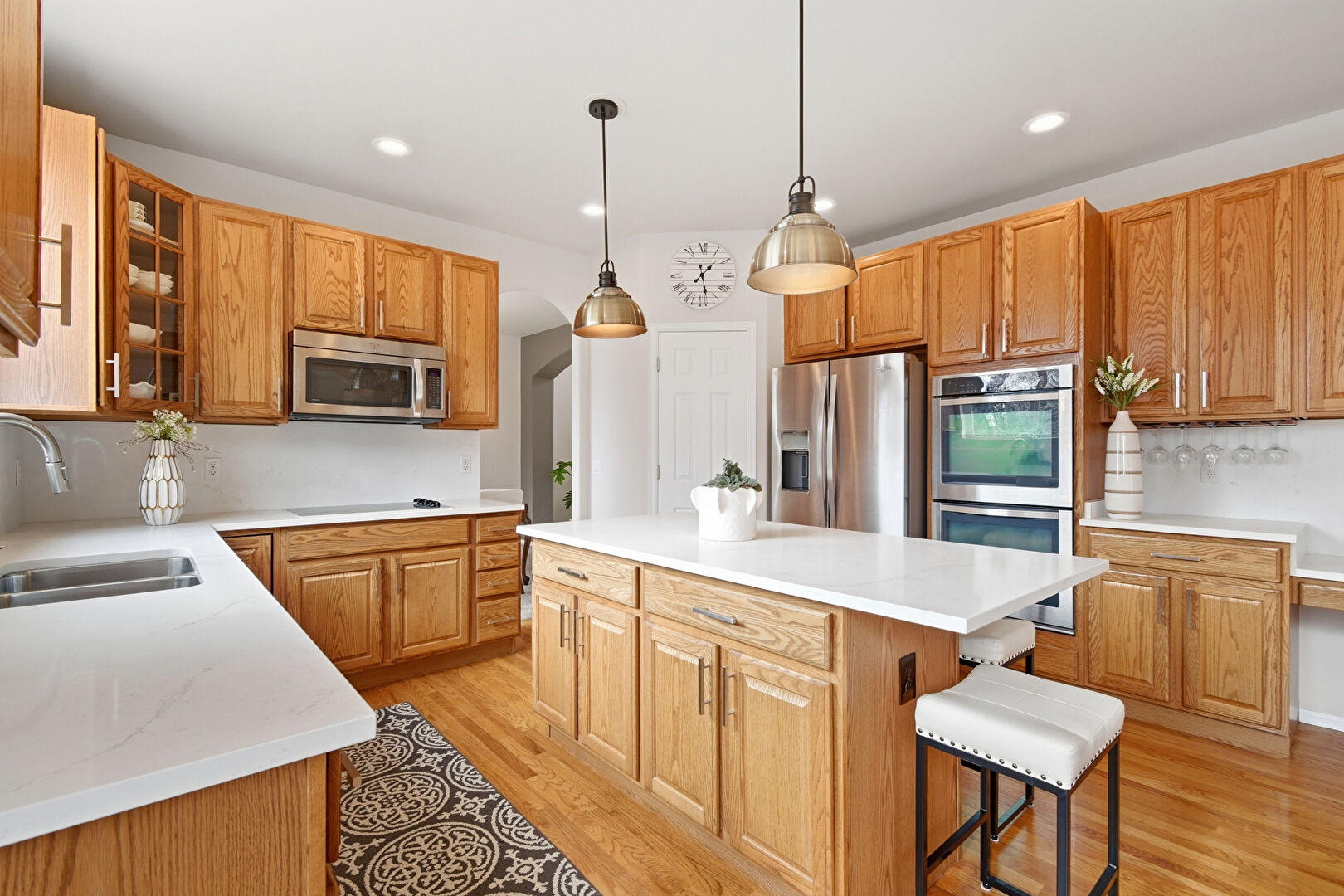 Arched Walkways, Baseboards Wall, Double Oven, Drywall, Glass Insert Cabinets, Kitchen Bar, Kitchen Island, Medium Brown Cabinets, Natural Light, Opens To Living Area, Pendant Lighting, Raised Cabinets, Recessed Lighting, Stone Countertops, Textured Wall, Vent, Wood Finish Floor, Kitchen Bar, Medium Brown Cabinets, Natural Light, Raised Cabinets, Textured Wall, U Shaped Kitchen