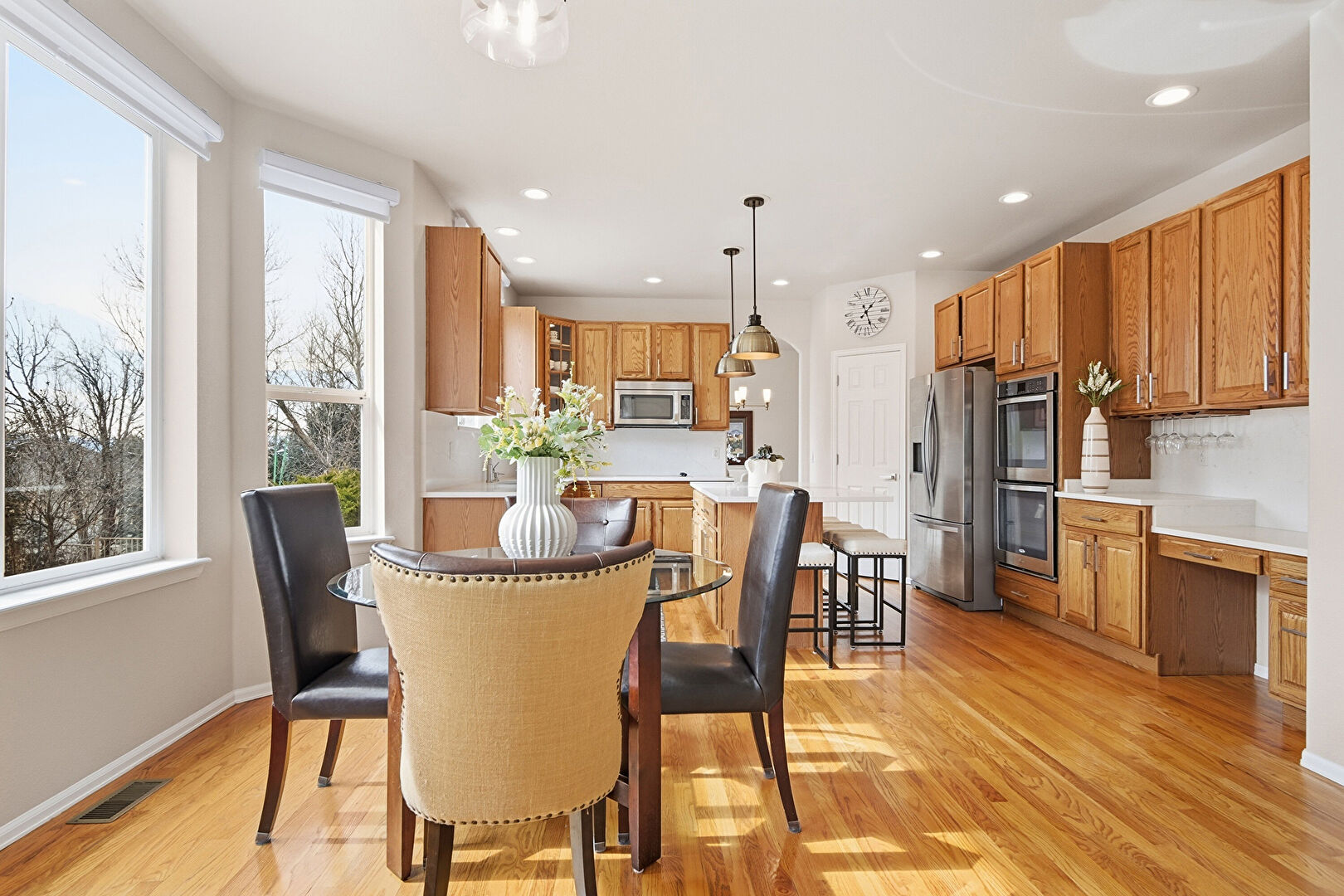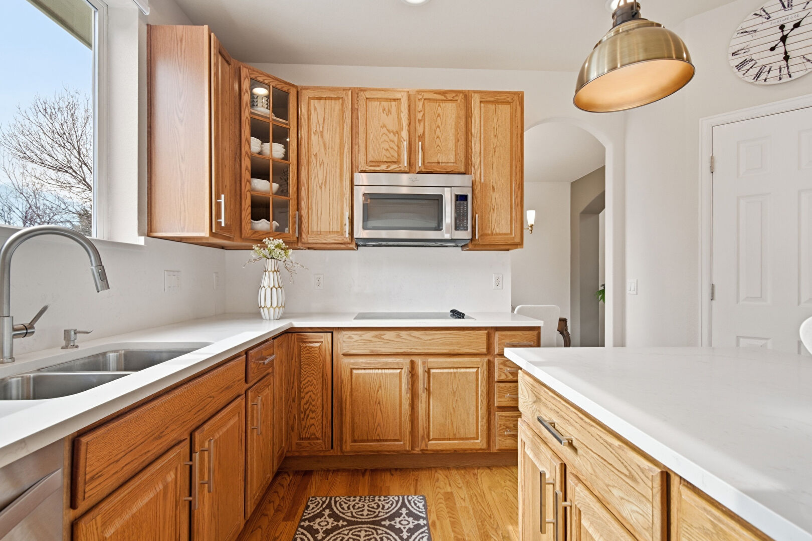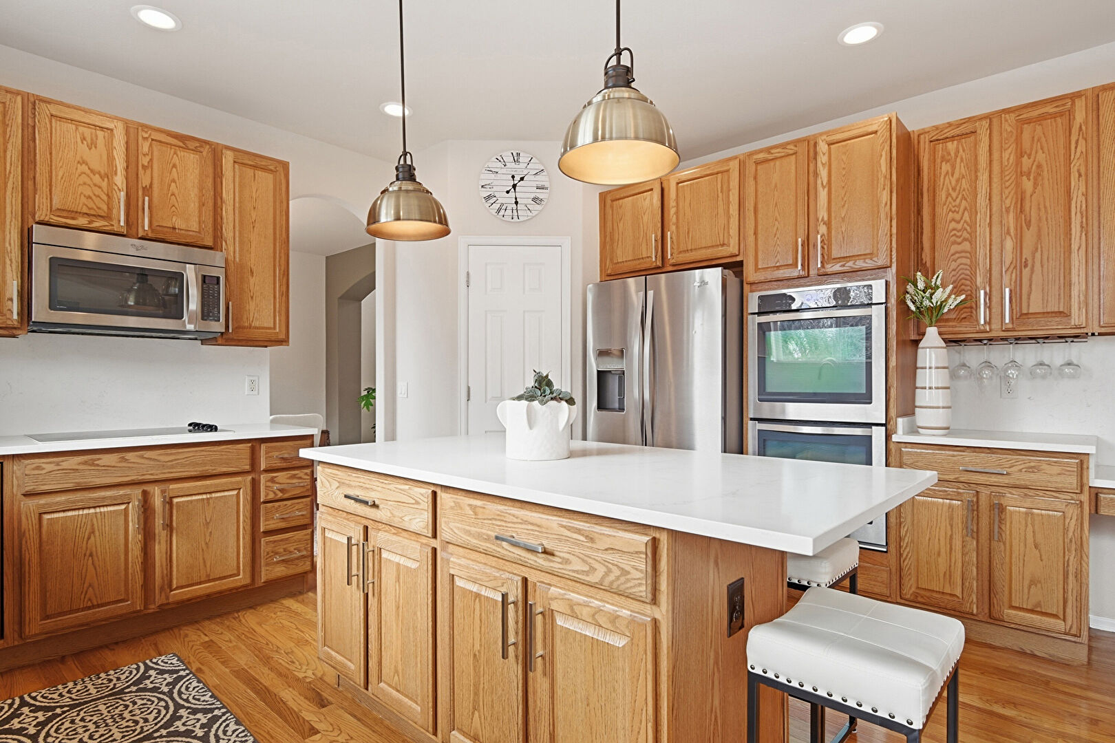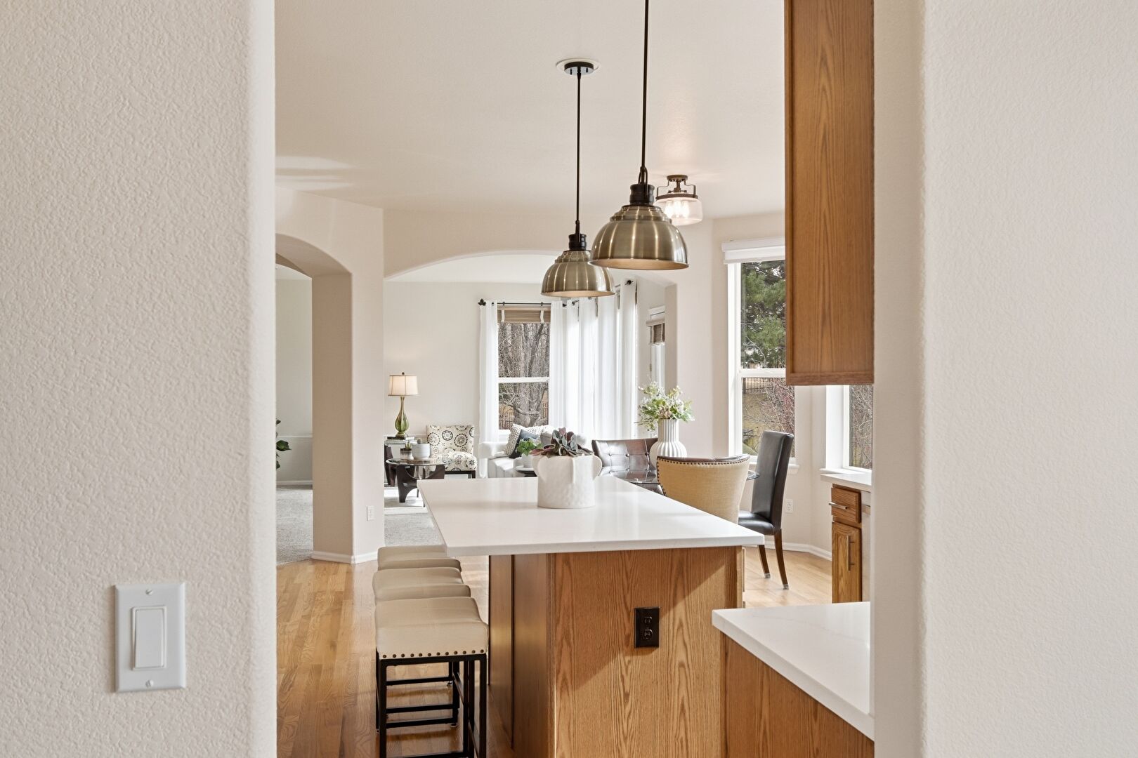 Arched Walkways, Baseboards Wall, Double Oven, Drywall, Glass Insert Cabinets, Kitchen Bar, Kitchen Island, Medium Brown Cabinets, Natural Light, Opens To Living Area, Pendant Lighting, Raised Cabinets, Recessed Lighting, Stone Countertops, Textured Wall, Vent, Wood Finish Floor, Kitchen Bar, Medium Brown Cabinets, Natural Light, Raised Cabinets, Textured Wall, U Shaped Kitchen