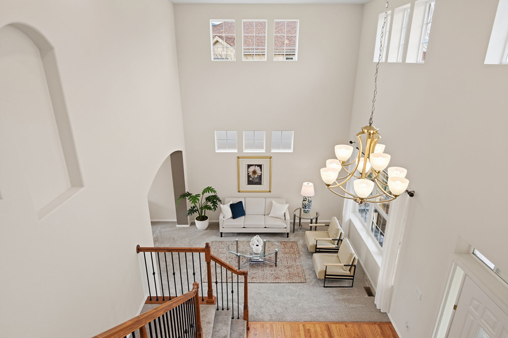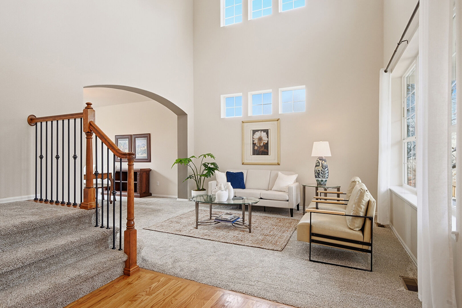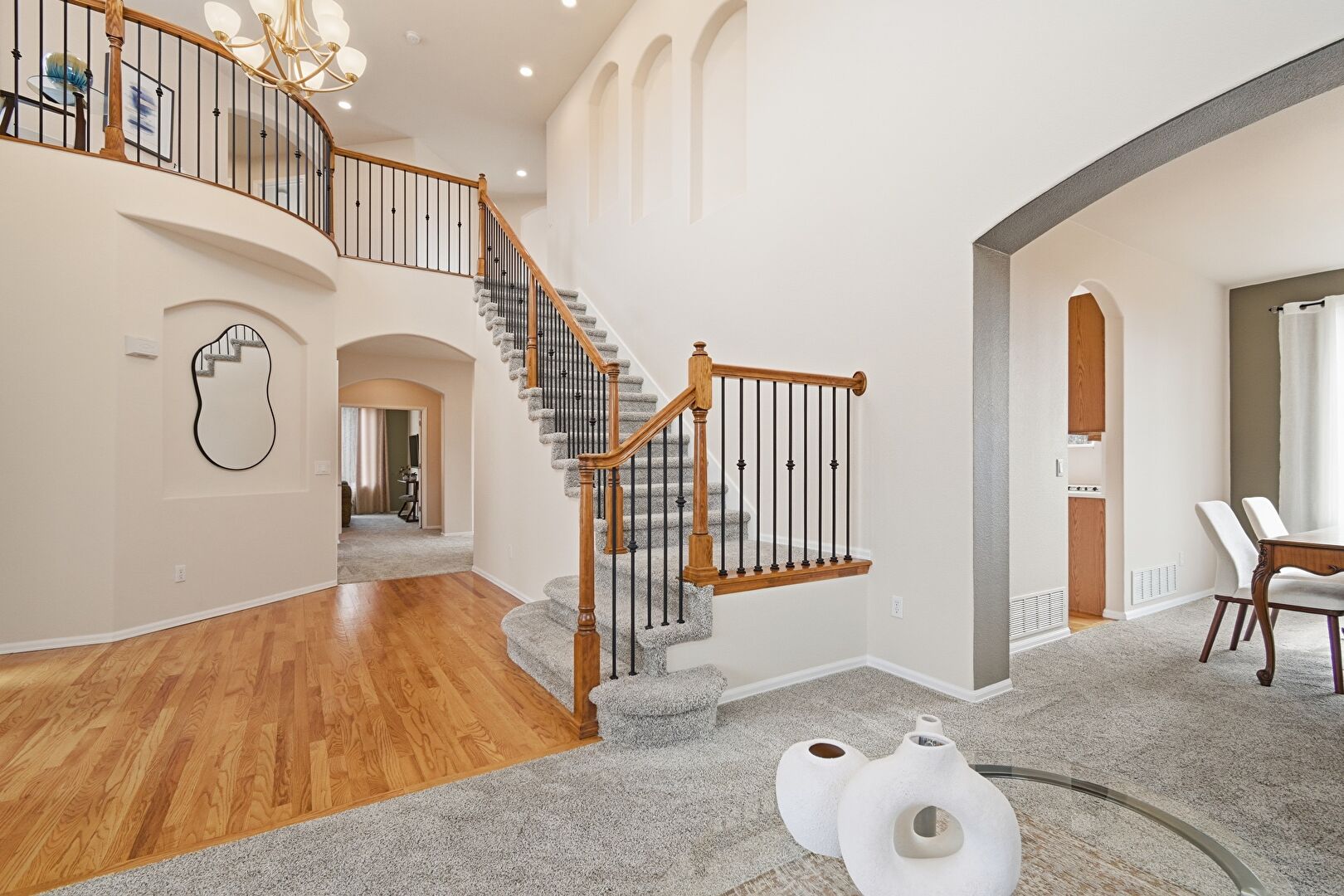 Arched Walkways, Baseboards Wall, Carpet, Drywall, Fireplace, High Ceiling, Natural Light, Notable Chandelier, Recessed Lighting, Stairs, Vent, Wood Finish Floor, Arched Walkways, Baseboards Wall, Drywall, Fireplace, High Ceiling, Natural Light, Vent, Wood Finish Floor