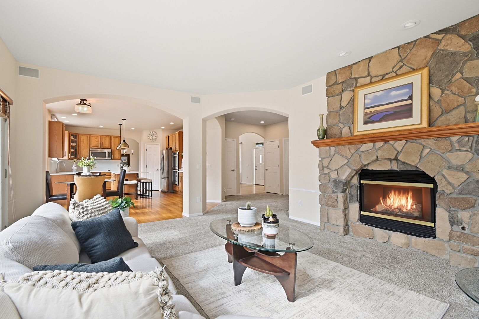 Arched Walkways, Baseboards Wall, Carpet, Double Oven, Drywall, Fireplace, High Ceiling, Natural Light, Notable Chandelier, Recessed Lighting, Vent, Wood Finish Floor, Baseboards Wall, Natural Light, Notable Chandelier