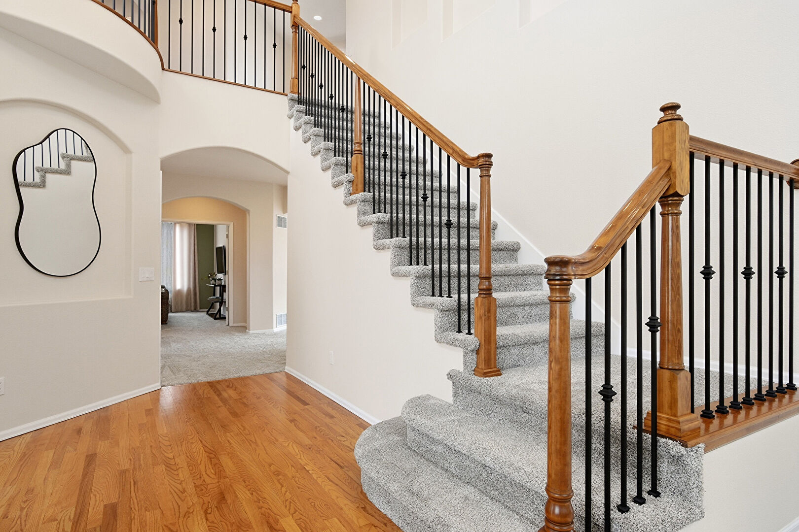 Arched Walkways, Baseboards Wall, Drywall, High Ceiling, Wood Finish Floor, Stairs