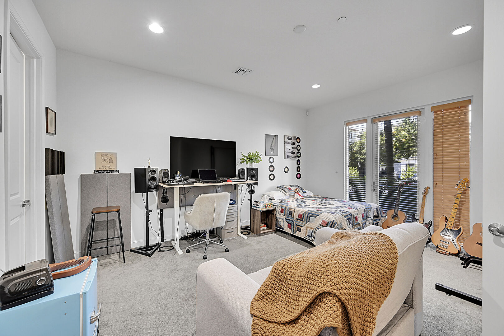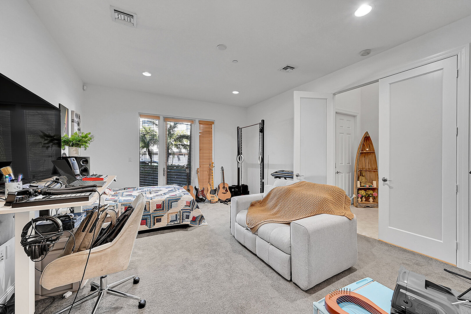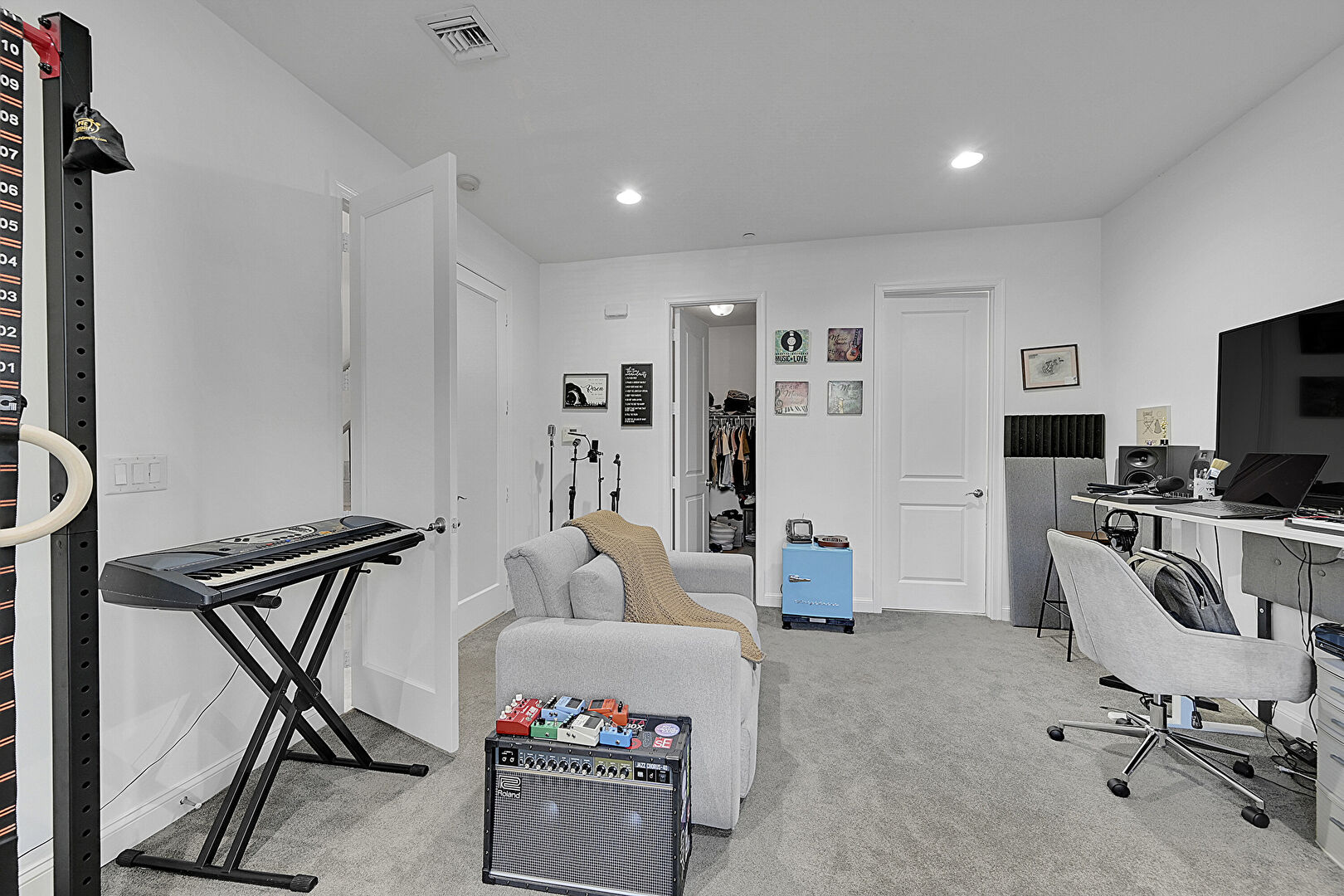 Access To Exterior, Baseboards Wall, Carpet, Ceiling Fan, Closet, Drywall, Natural Light, Office Area, Recessed Lighting, Textured Ceiling, Vent, Wood Finish Floor, Carpet, Drywall, Textured Ceiling, Wood Finish Floor