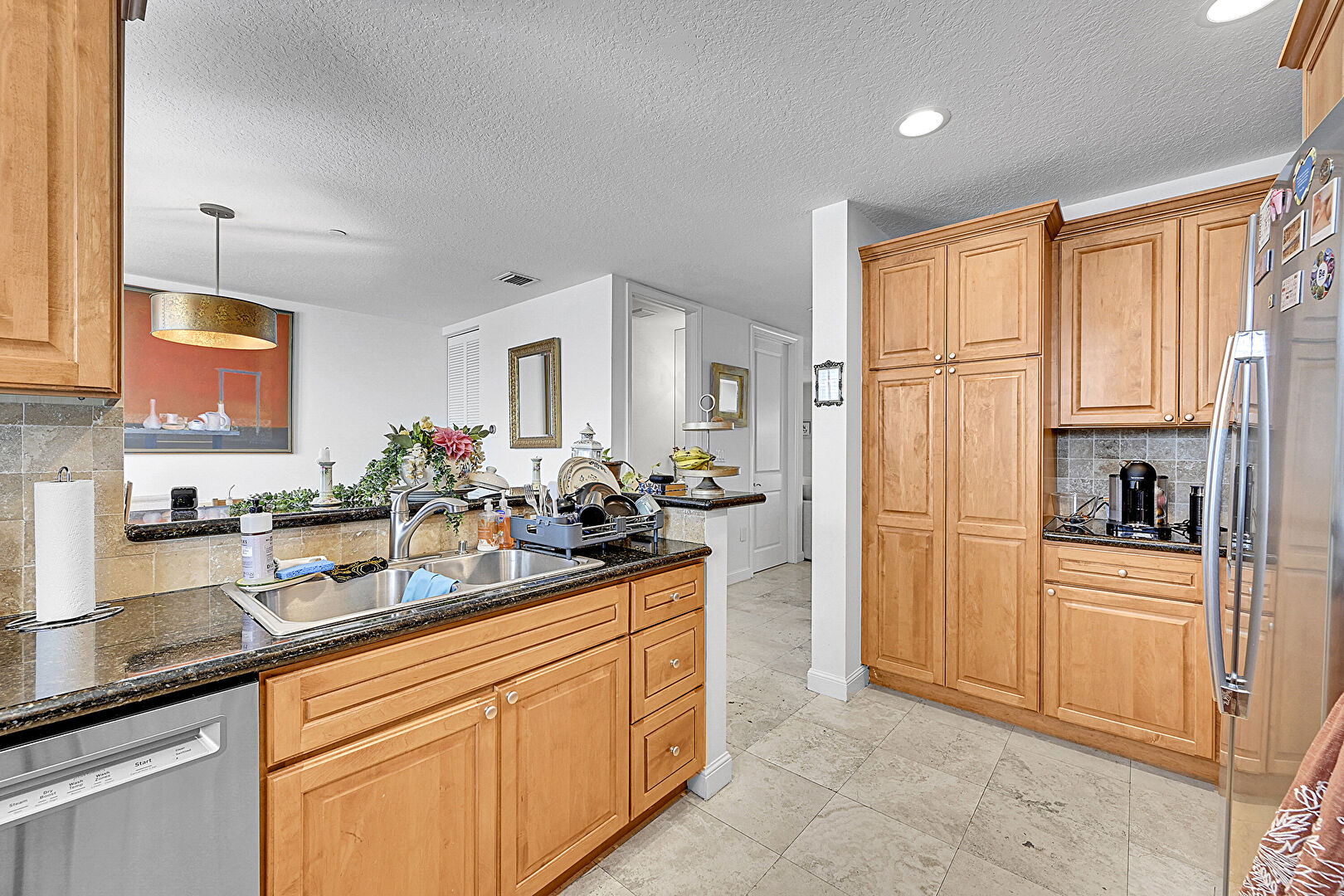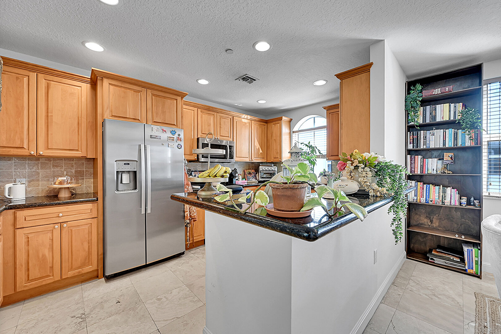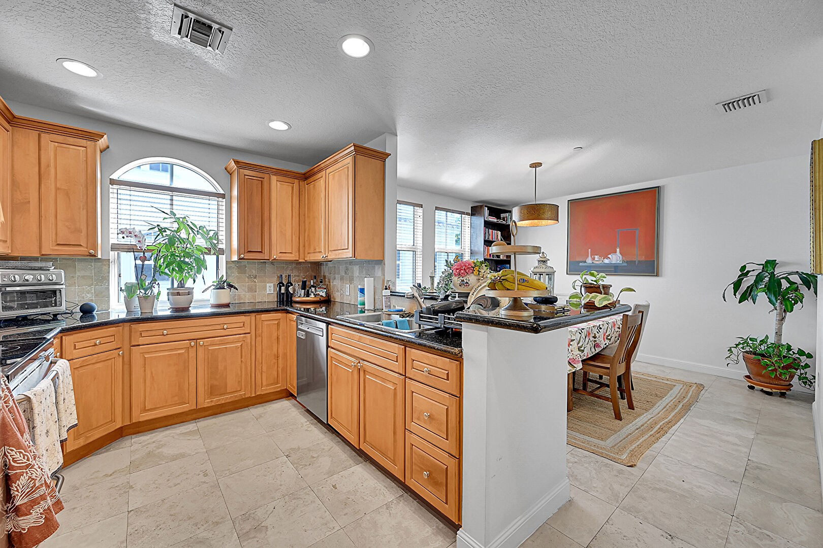 Baseboards Wall, Crown Molding Cabinets, Drywall, Kitchen Bar, Kitchen Peninsula, Medium Brown Cabinets, Natural Light, Pendant Lighting, Raised Cabinets, Recessed Lighting, Stone Countertops, Textured Ceiling, Tile Floor, Toaster, Vent, Medium Brown Cabinets, Raised Cabinets, Tile Floor