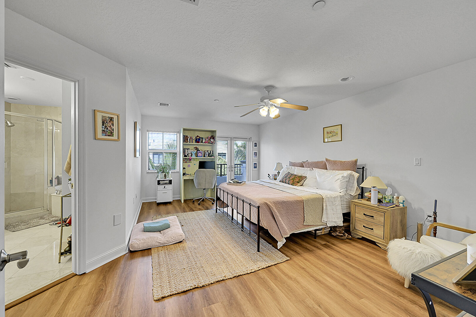 Access To Exterior, Baseboards Wall, Ceiling Fan, Closet, Drywall, Ensuite Bathroom, French Doors, Natural Light, Office Area, Recessed Lighting, Textured Ceiling, Vent, Walk In Closet, Wood Finish Floor, Drywall, Wood Finish Floor