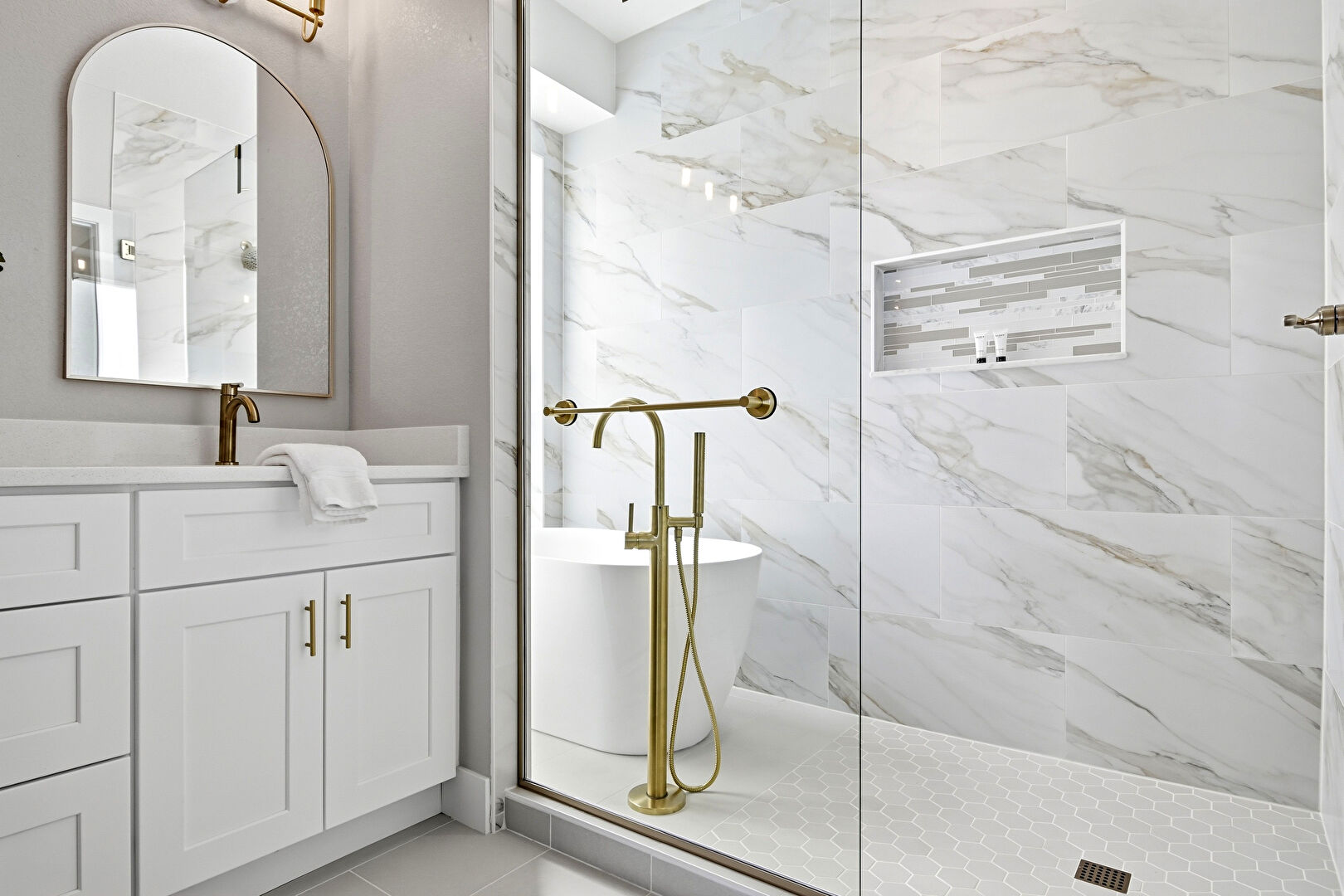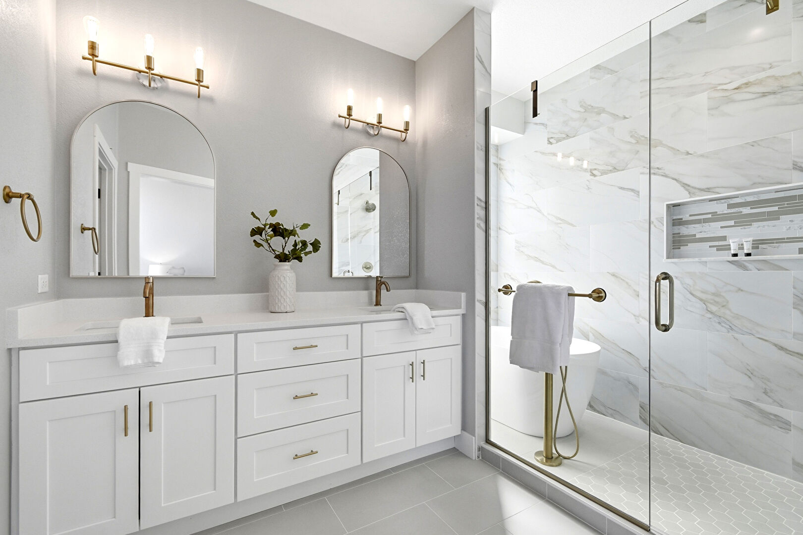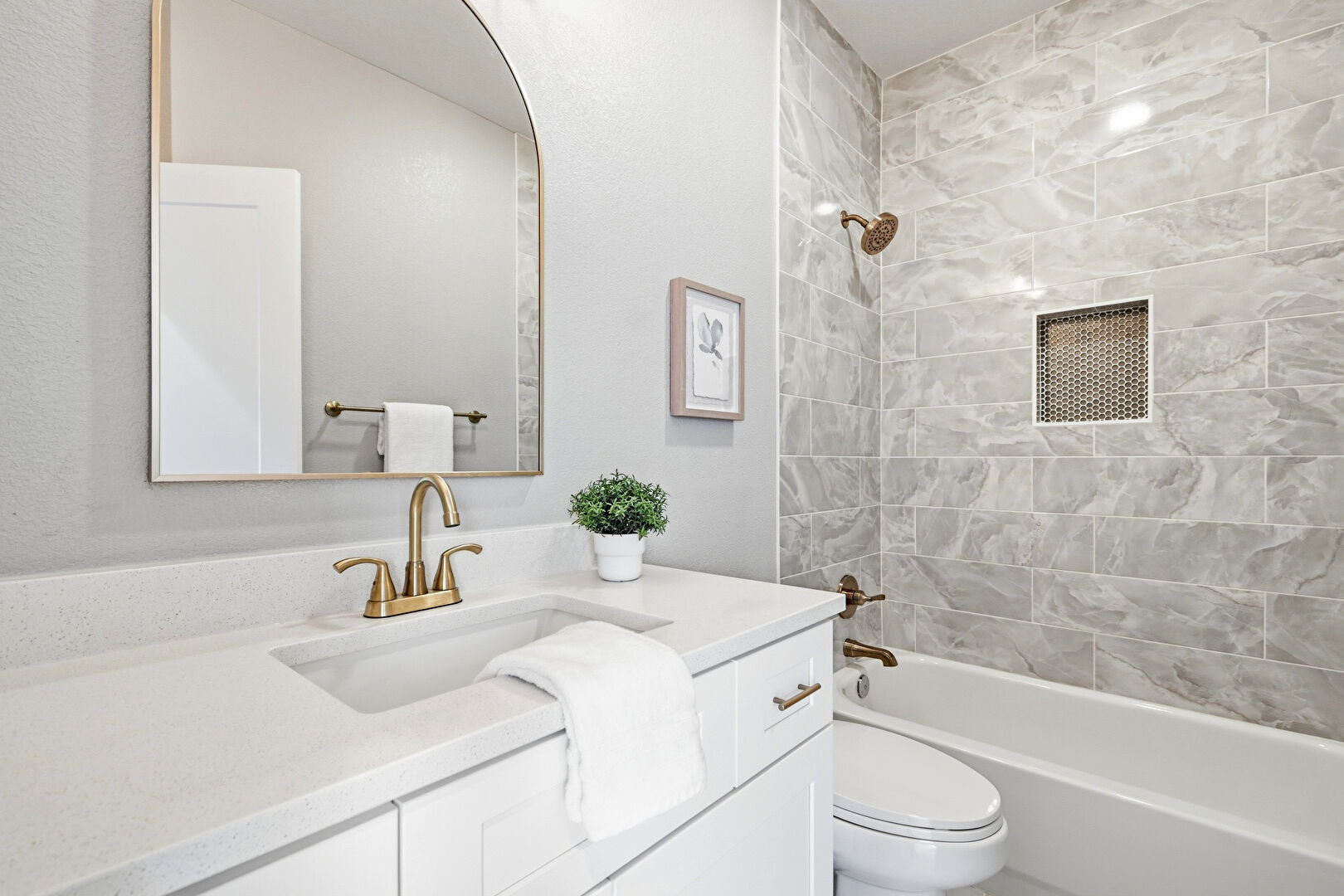 Baseboards Wall, Combined Bath Shower, Drywall, Full Bathroom, Textured Wall, Tile Floor, Vanity, Vent, Double Vanity, Full Bathroom, Half Bathroom, Vanity