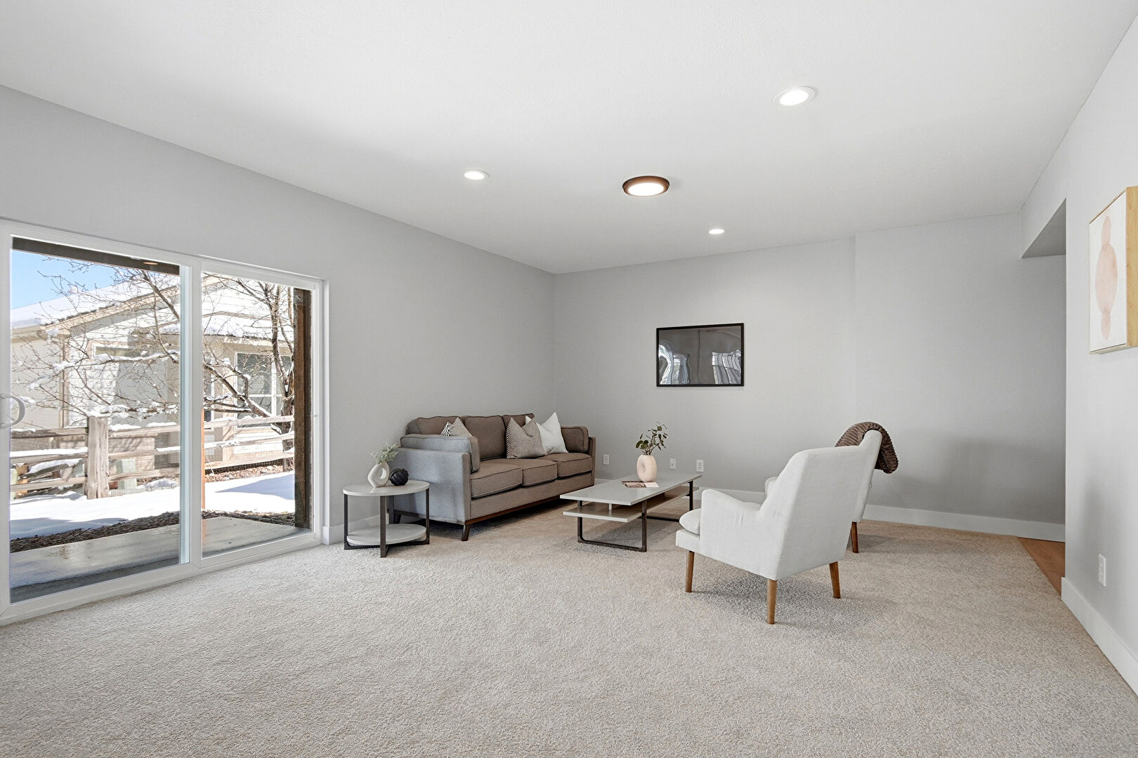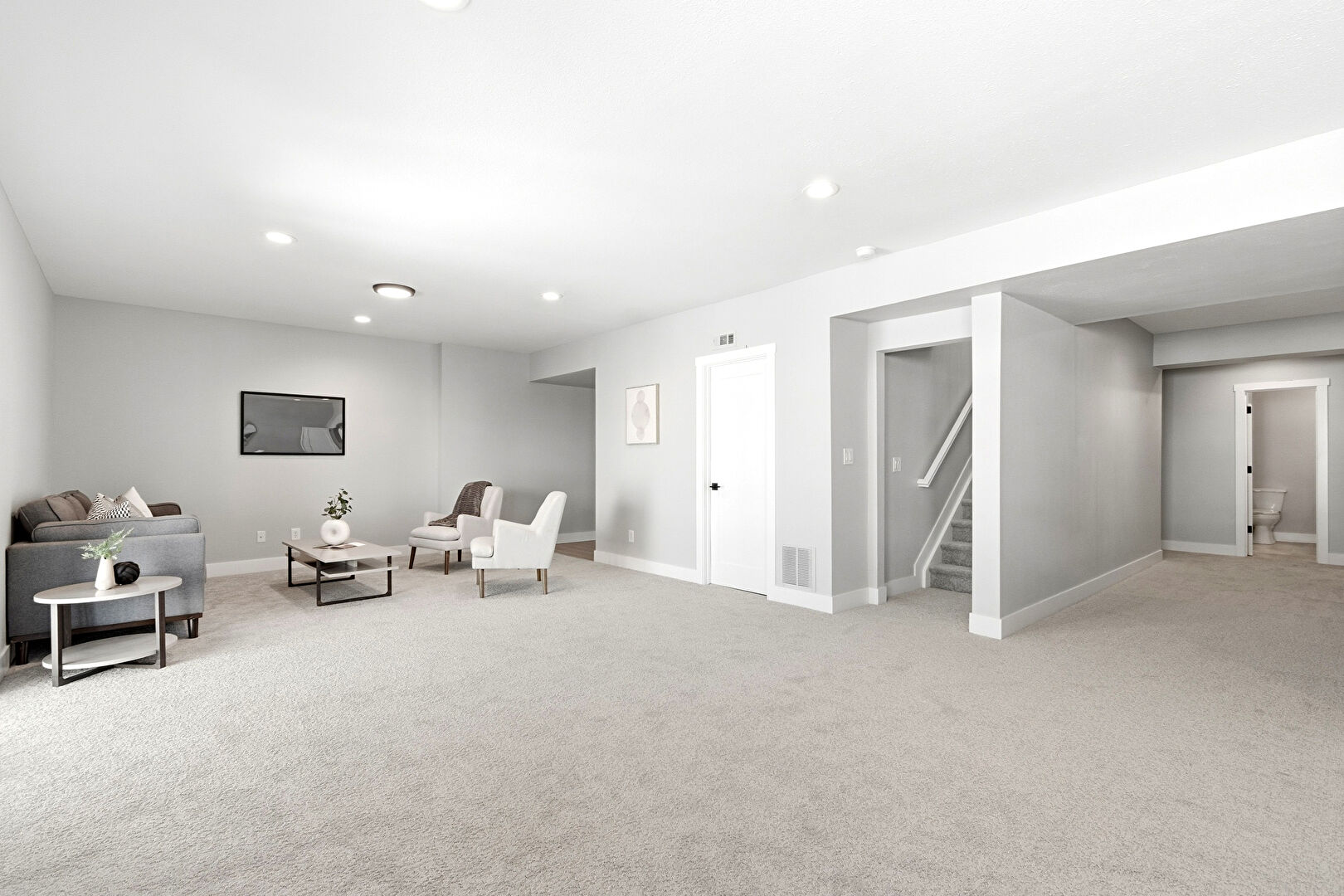 Baseboards Wall, Basement, Carpet, Drywall, Natural Light, Recessed Lighting, Stairs, Vent, Drywall, Wood Finish Floor