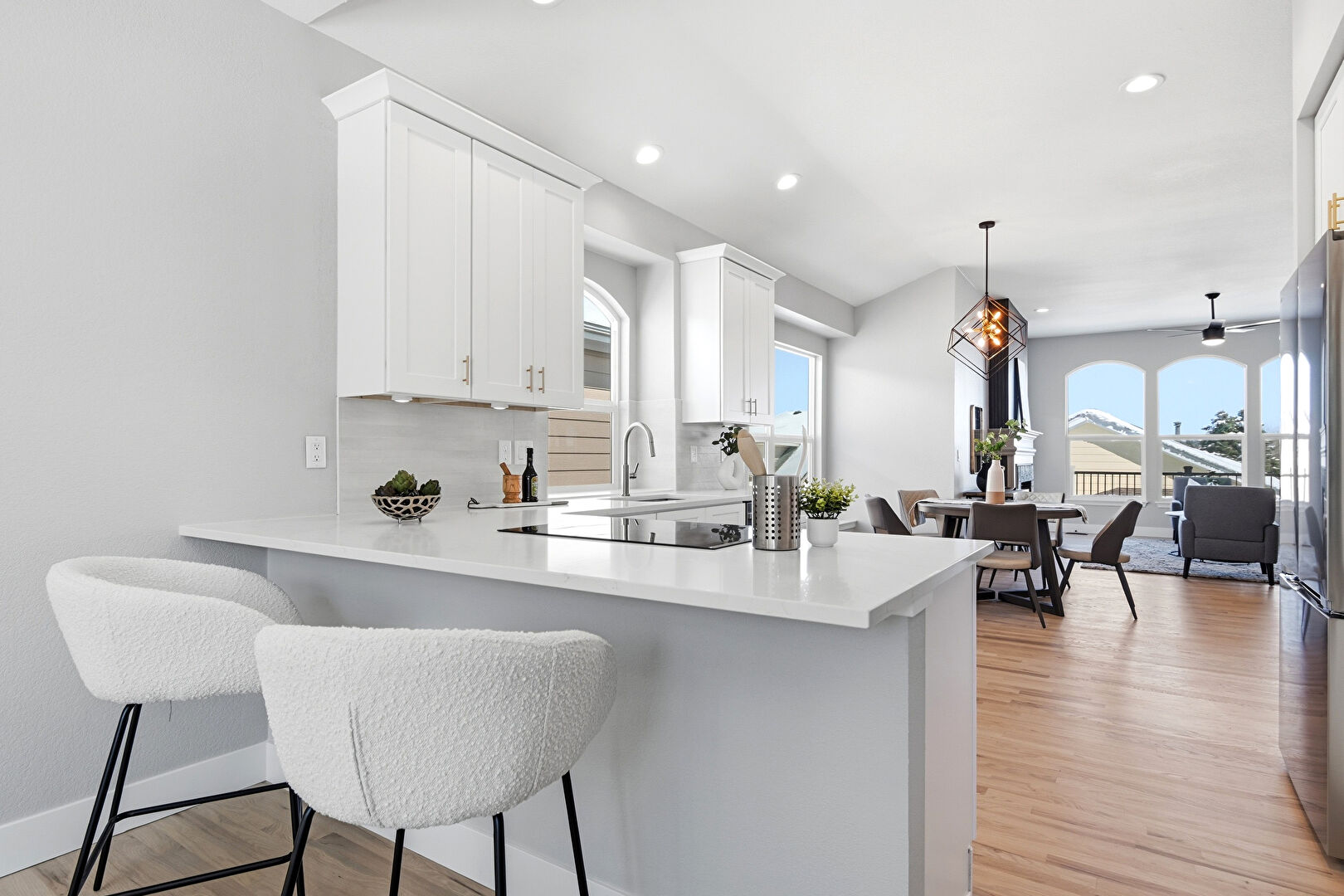 Arched Walkways, Baseboards Wall, Carpet, Ceiling Fan, Drywall, Fireplace, Natural Light, Recessed Lighting, Vent, Wood Finish Floor, Baseboards Wall, Ceiling Fan, Recessed Lighting, Wood Finish Floor