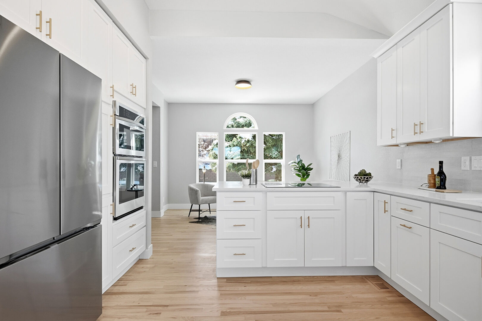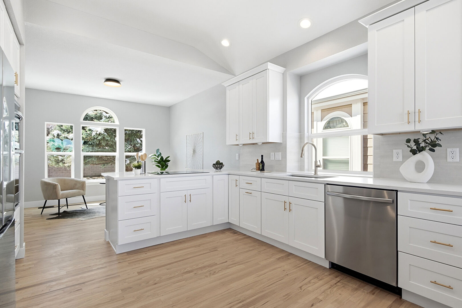Arched Walkways, Baseboards Wall, Crown Molding Cabinets, Double Oven, Drywall, Kitchen Bar, Kitchen Peninsula, Natural Light, Pendant Lighting, Recessed Lighting, Shaker Cabinets, Stone Countertops, U Shaped Kitchen, Vaulted Ceiling, Vent, Wood Finish Floor, Crown Molding Cabinets, Double Oven, Kitchen Peninsula, Stone Countertops