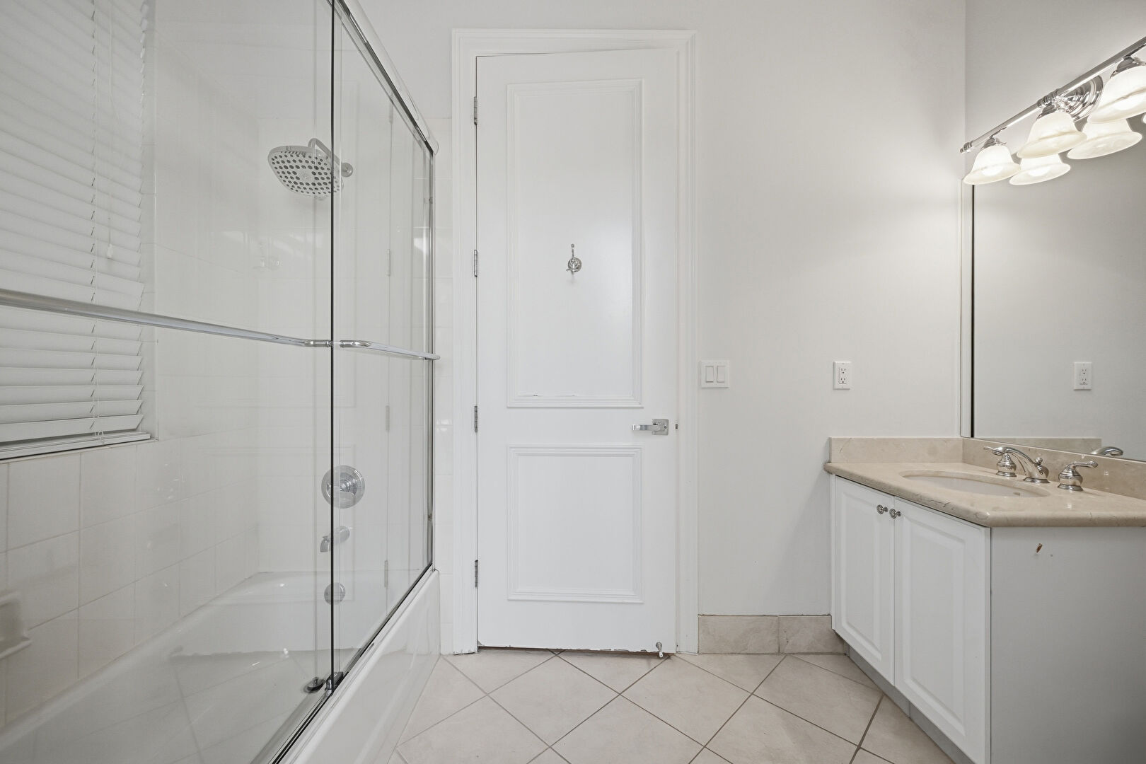 Baseboards Wall, Combined Bath Shower, Drywall, Full Bathroom, Natural Light, Recessed Lighting, Tile Floor, Vanity, Crown Molding
