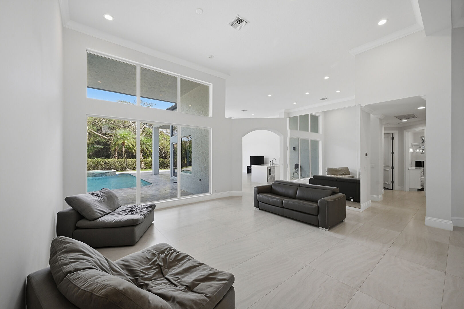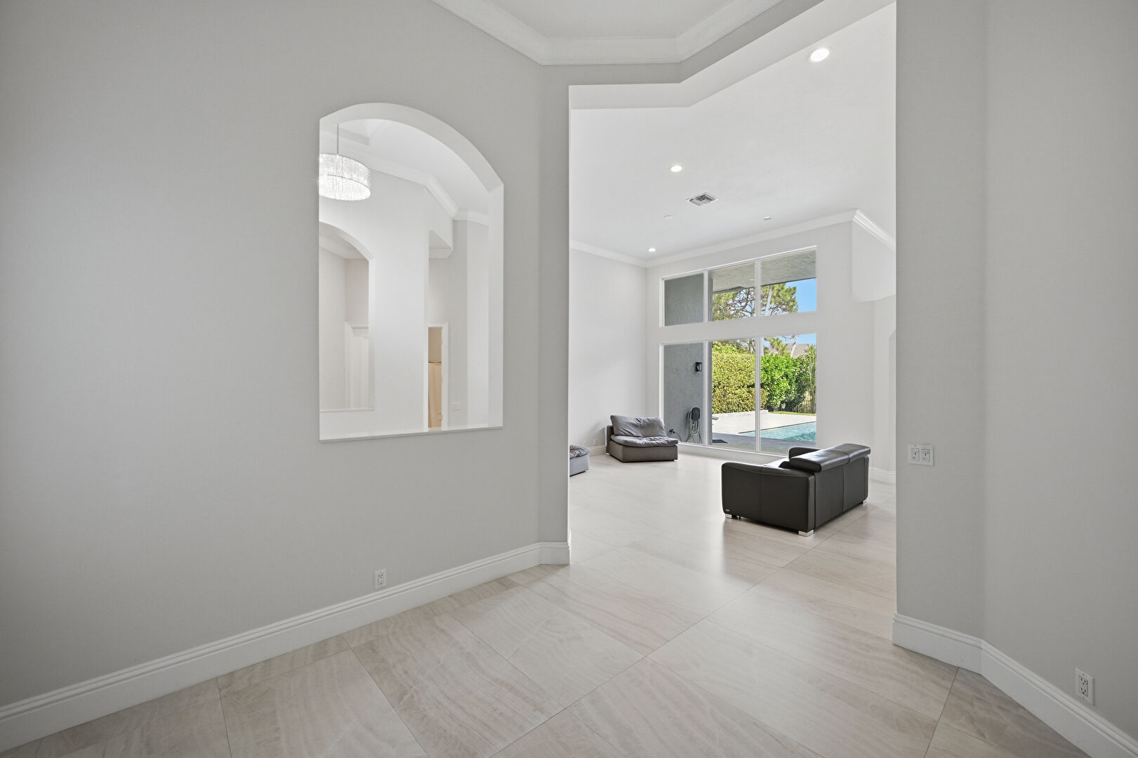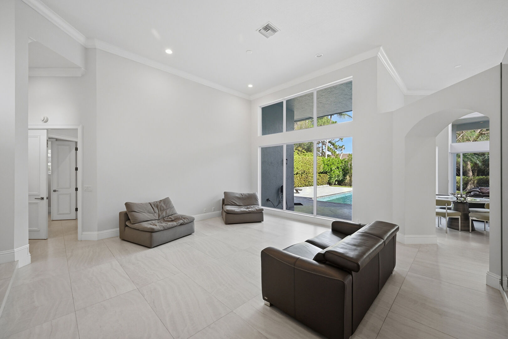 Arched Walkways, Baseboards Wall, Crown Molding, Drywall, High Ceiling, Natural Light, Pool View, Recessed Lighting, Tile Floor, Vent, Arched Walkways, Crown Molding, Drywall