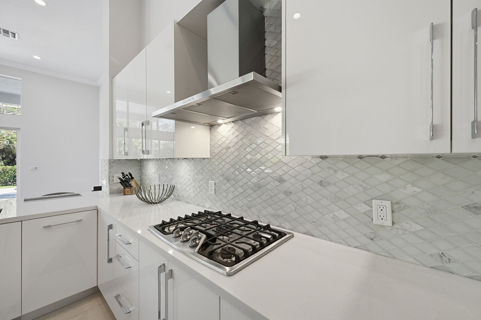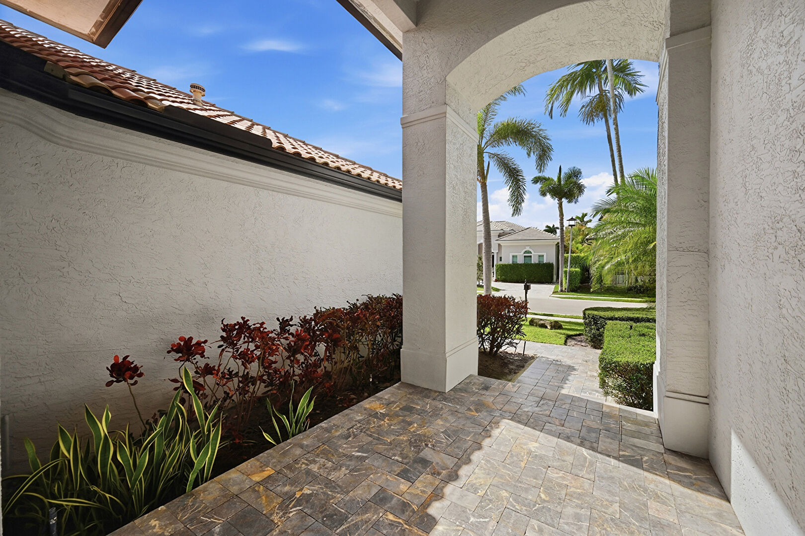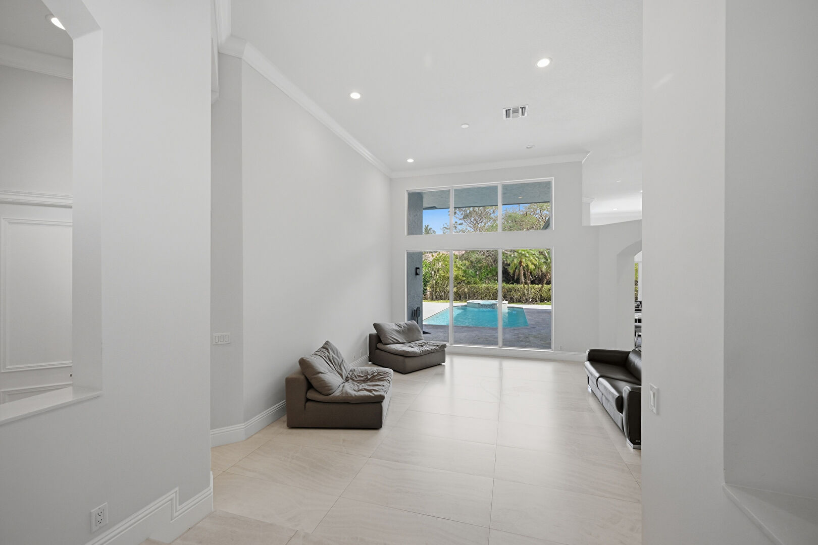 Arched Walkways, Baseboards Wall, Crown Molding, Drywall, High Ceiling, Natural Light, Pool View, Recessed Lighting, Tile Floor, Vent, Arched Walkways, Crown Molding, Drywall