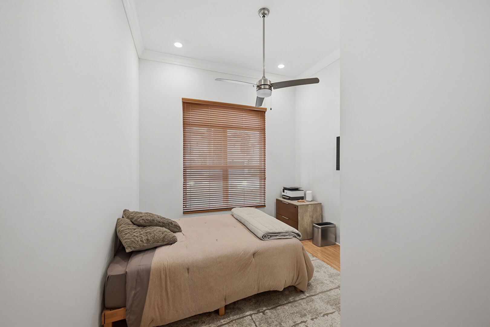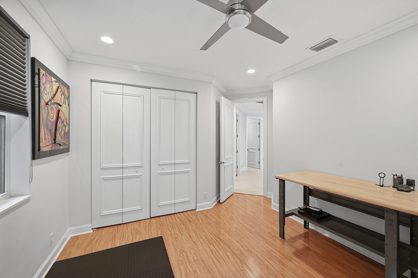 Baseboards Wall, Ceiling Fan, Crown Molding, Drywall, Natural Light, Recessed Lighting, Vent, Wood Finish Floor, Ceiling Fan, Closet