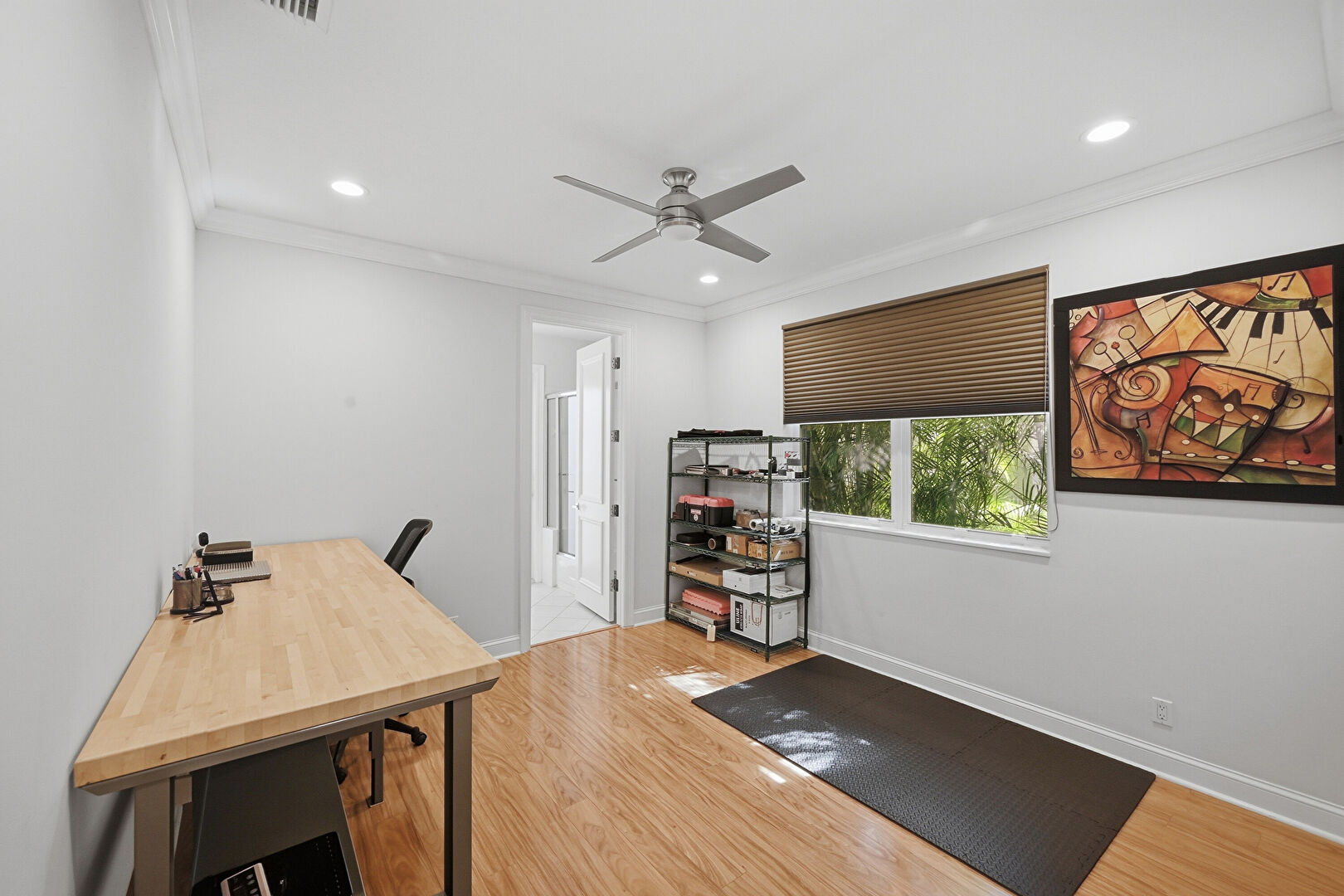 Baseboards Wall, Ceiling Fan, Crown Molding, Drywall, Recessed Lighting, Vent, Wood Finish Floor, Natural Light, Recessed Lighting