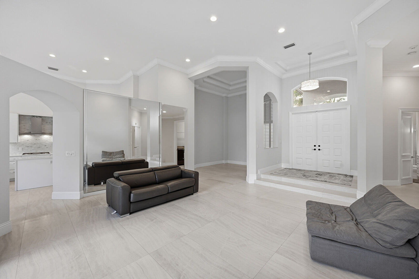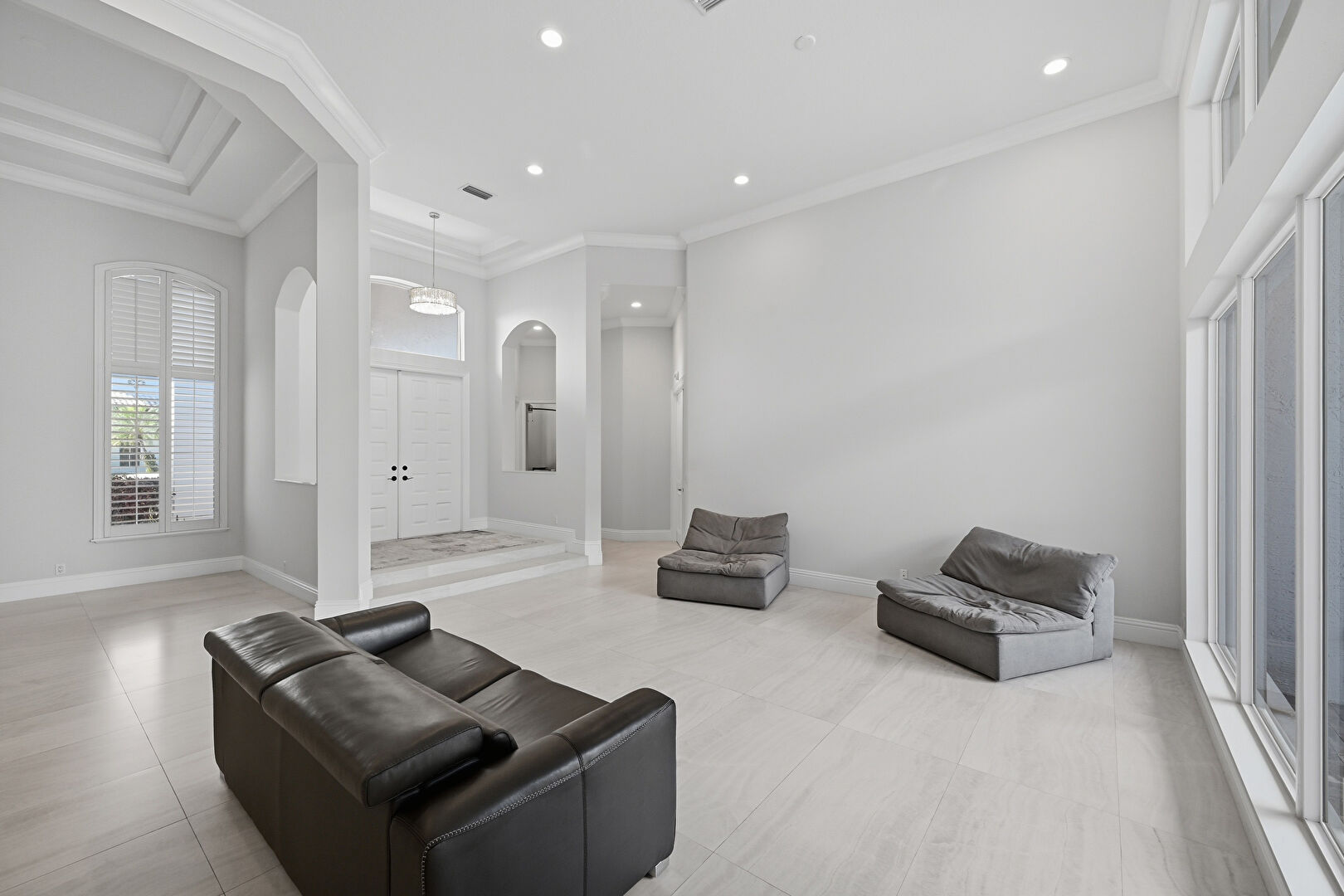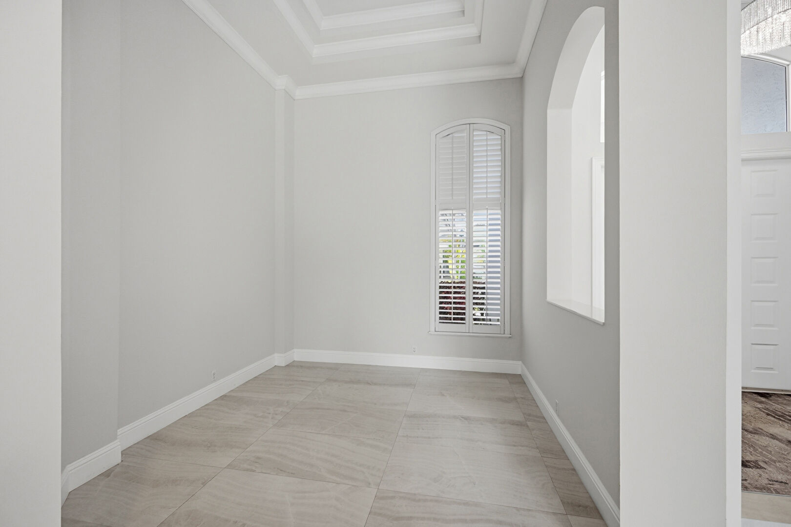 Arched Walkways, Baseboards Wall, Crown Molding, Drywall, High Ceiling, Natural Light, Recessed Lighting, Tile Floor, Tray Ceiling, Baseboards Wall, Natural Light
