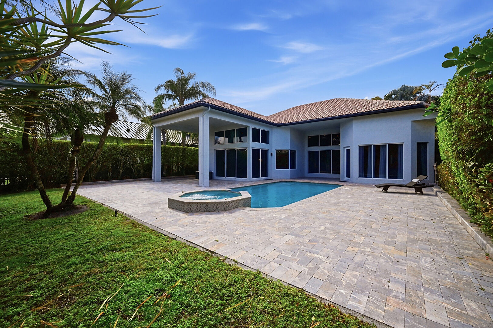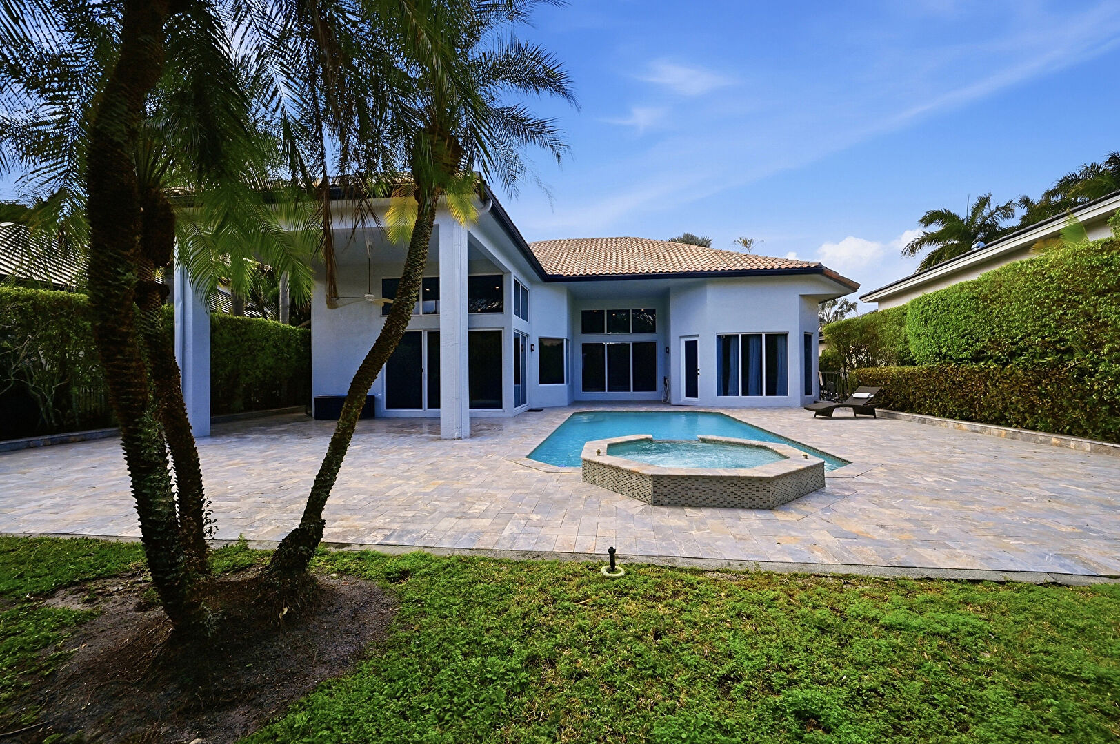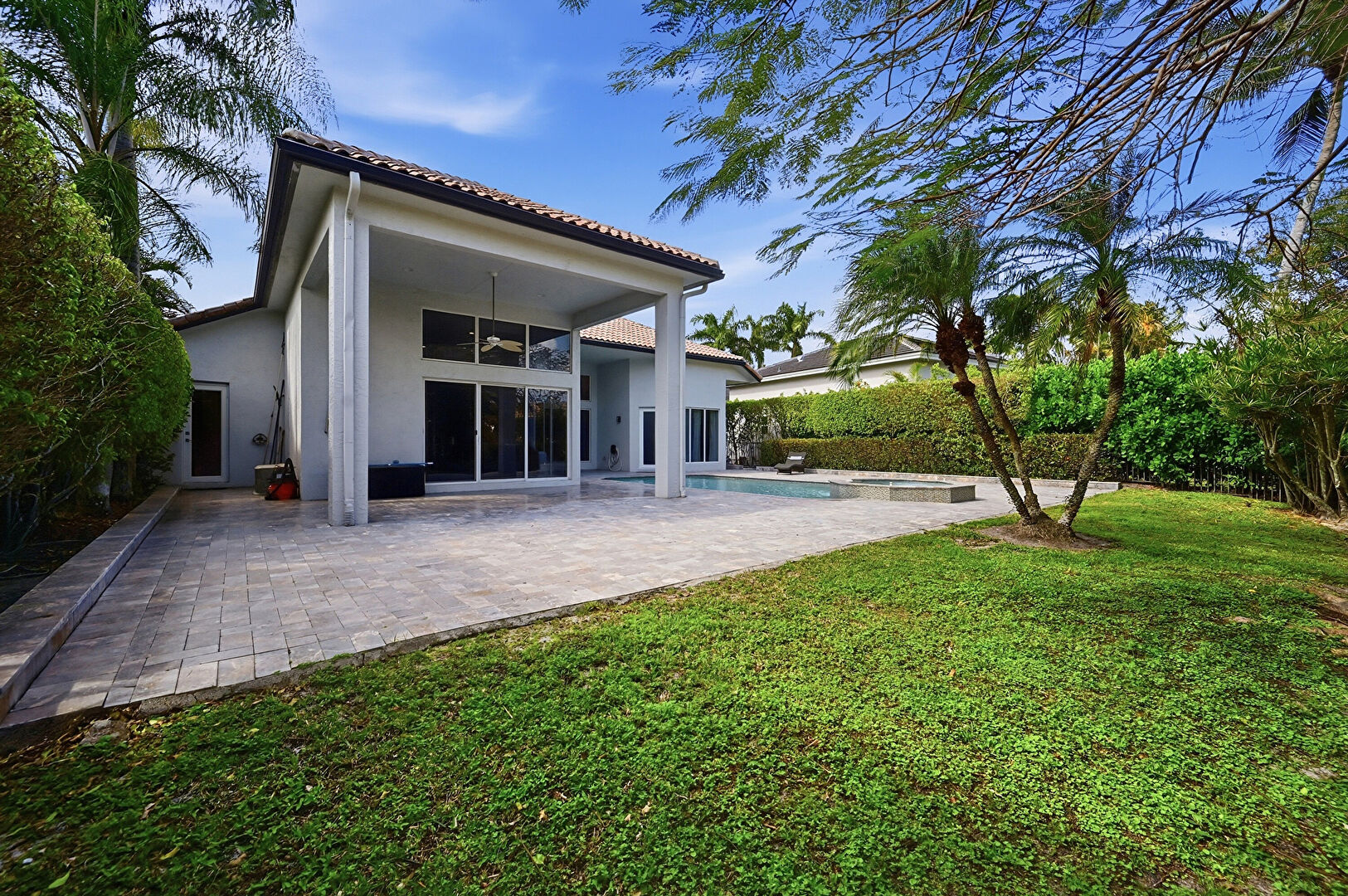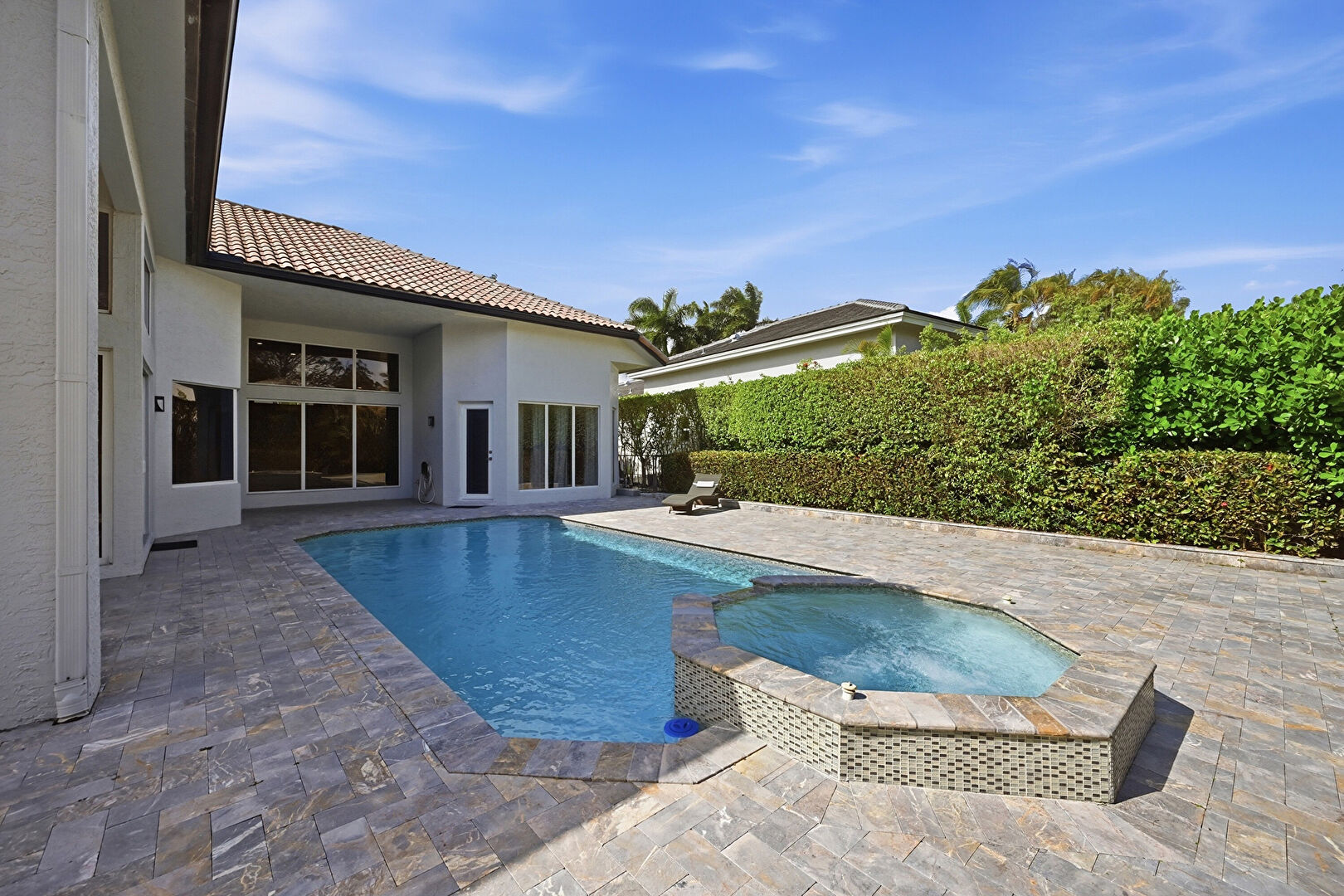 Downspout, Fence, Gutters, Hot Tub, Lawn, Patio, Pool, Pool Hot Tub Combo, Stairs, Stucco Siding, Tile Roof, Hot Tub, Stucco Siding, Tile Roof