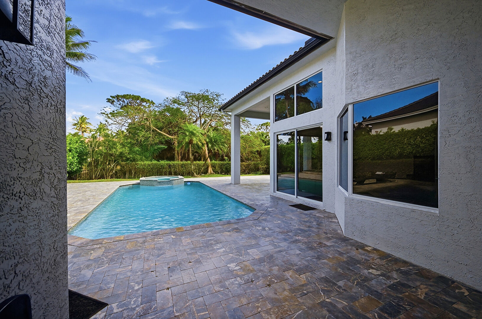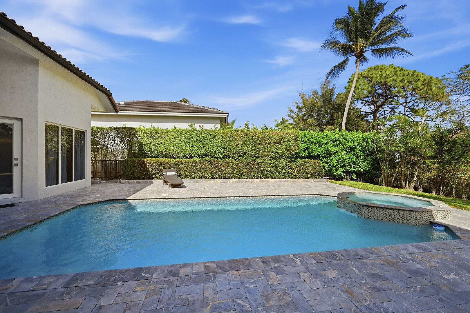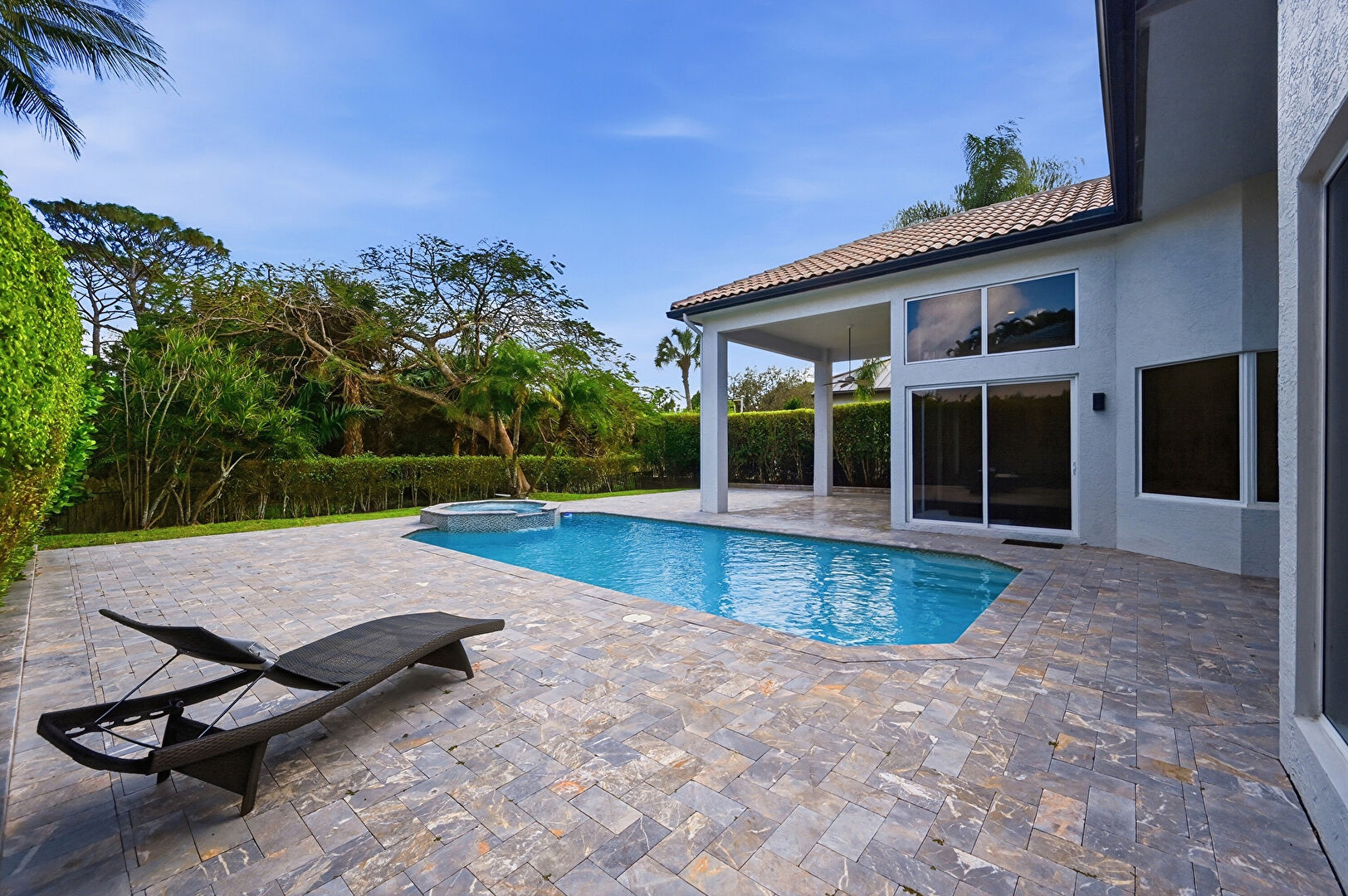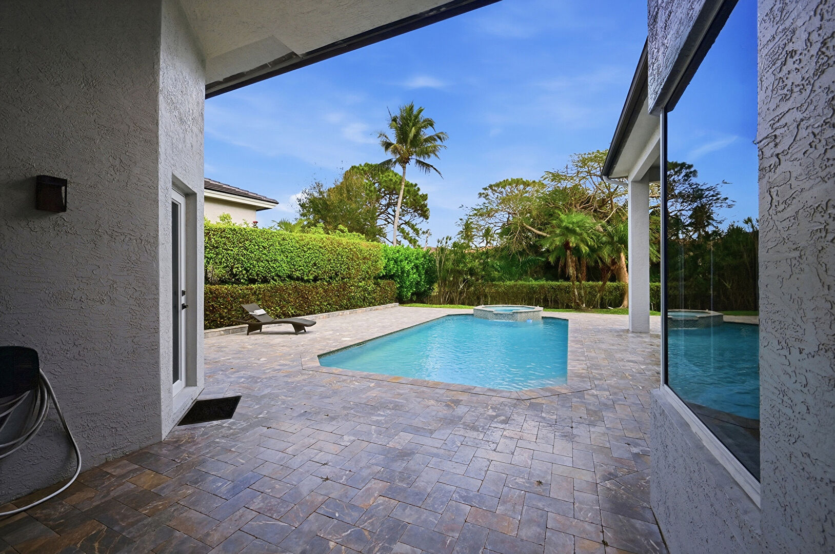 Downspout, Fence, Gutters, Hot Tub, Lawn, Patio, Pool, Pool Hot Tub Combo, Stairs, Stucco Siding, Tile Roof, Hot Tub, Stucco Siding, Tile Roof