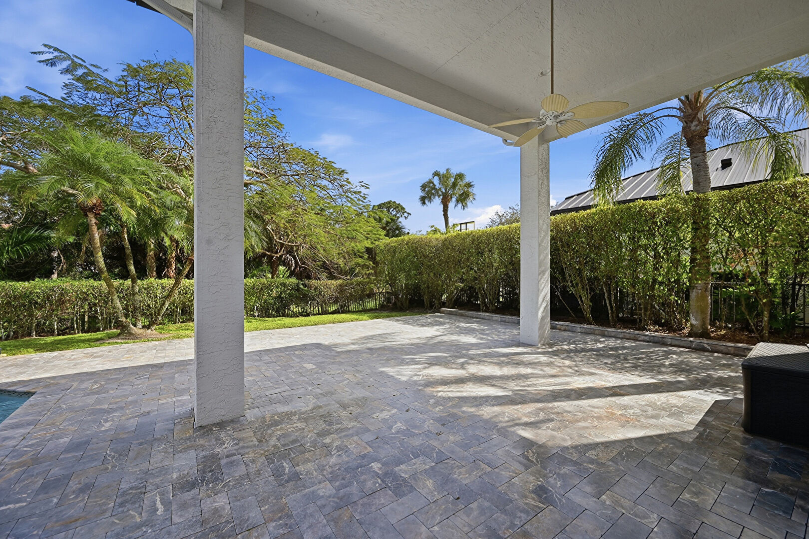 Ceiling Fan, Downspout, Fence, Gutters, Hot Tub, Patio, Pool Hot Tub Combo, Stucco Siding, Tile Roof, Ceiling Fan, Pool