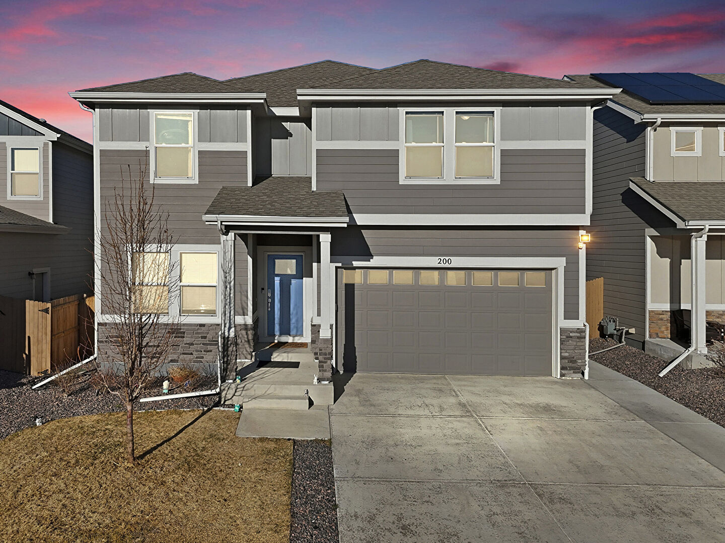 Board Batten Siding, Built In Garage, Concrete Foundation, Downspout, Driveway, Fence, Gutters, Horizontal Siding, Lawn, Residential View, Shingle Roof, Solar Panels, Stone Siding, Stoop, Vertical Siding, Board Batten Siding, Downspout, Gutters, Horizontal Siding, Stoop