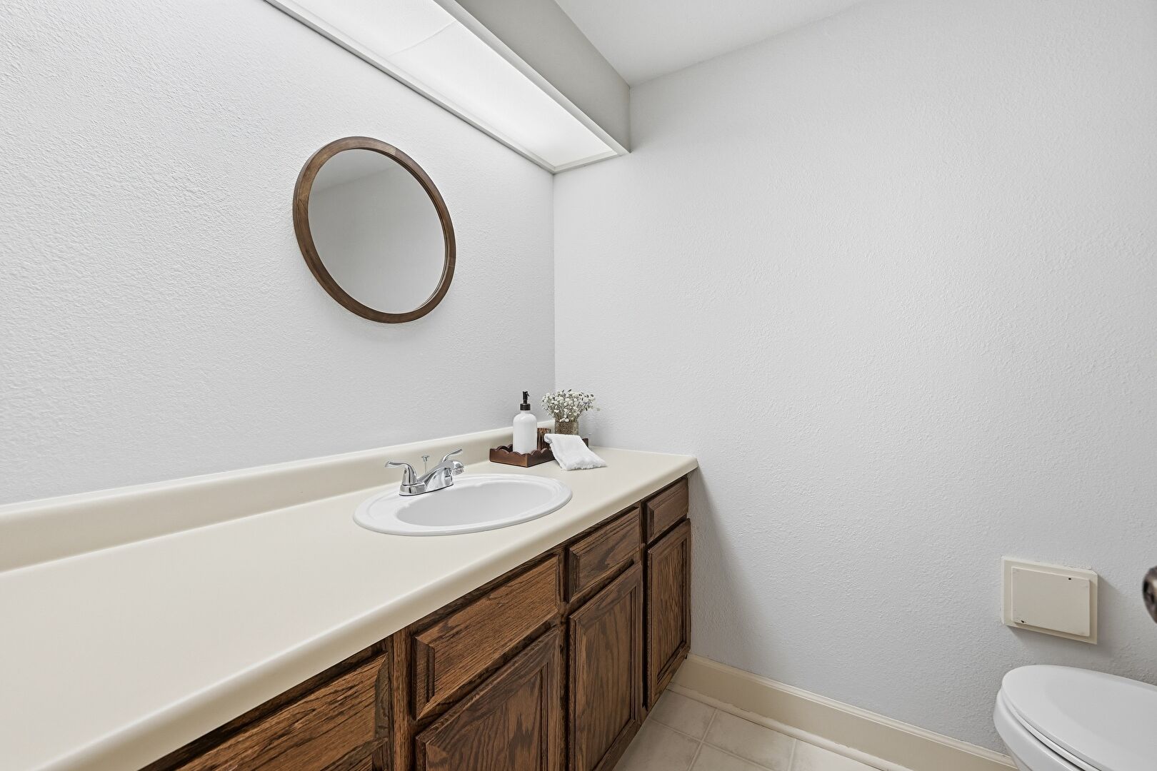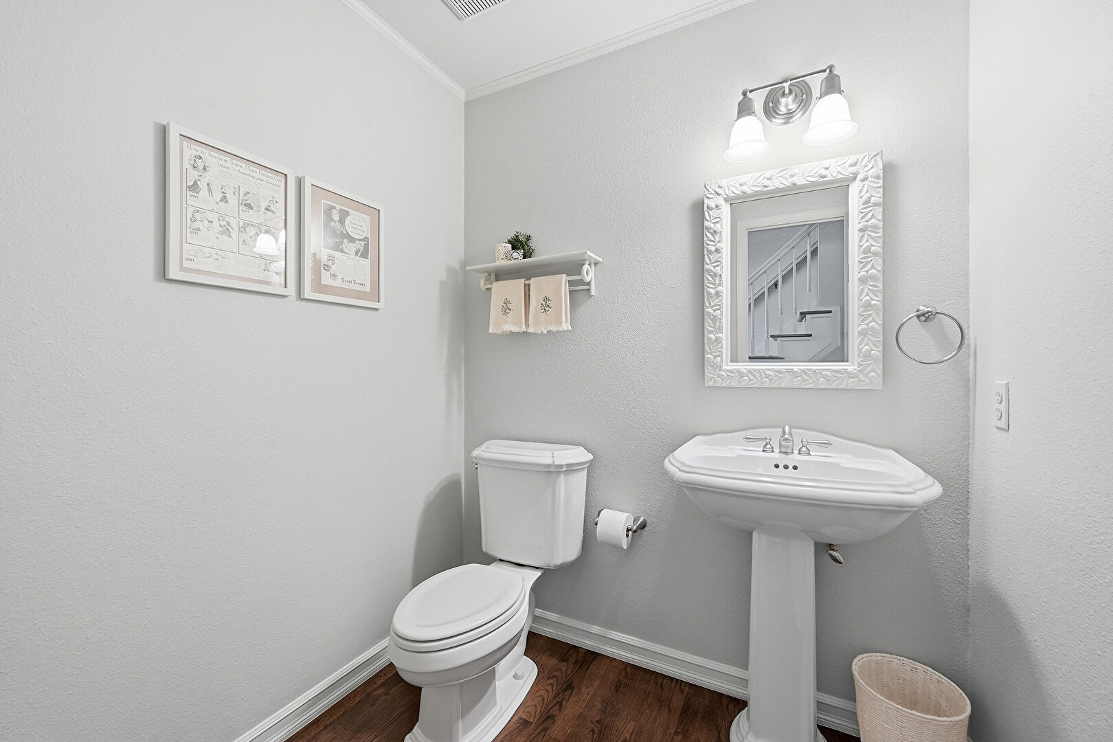 Baseboards Wall, Combined Bath Shower, Crown Molding, Drywall, Full Bathroom, Half Bathroom, Textured Ceiling, Textured Wall, Tile Floor, Vanity, Vent, Wood Finish Floor, Crown Molding, Tile Floor, Vanity