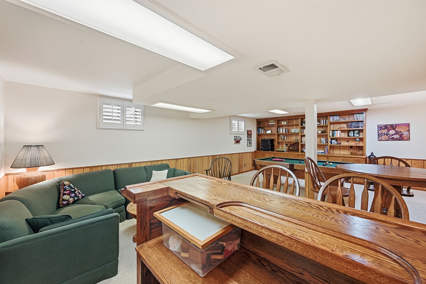 Basement, Billiards, Carpet, Drywall, Indoor Bar, Natural Light, Vent, Wainscot Wall, Wood Wall, Billiards, Carpet, Drywall, Indoor Bar, Wainscot Wall