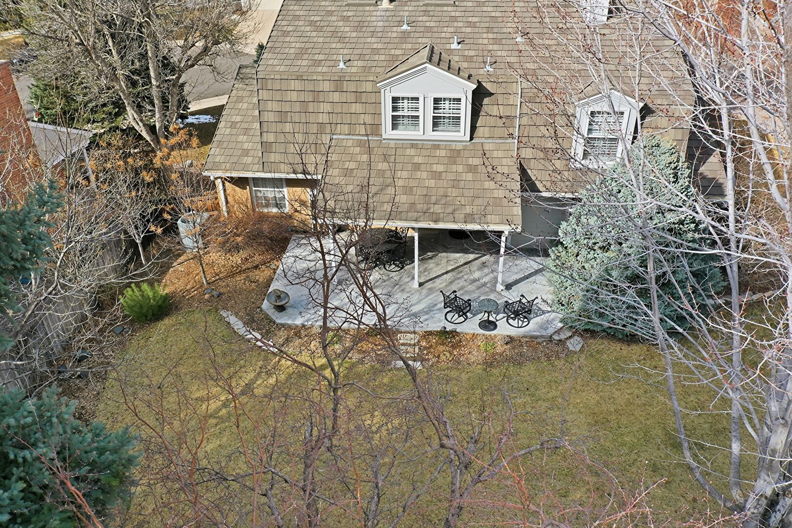 Brick Siding, Dormer Roof, Fence, Gutters, Horizontal Siding, Lawn, Patio, Shingle Roof, Downspout, Patio