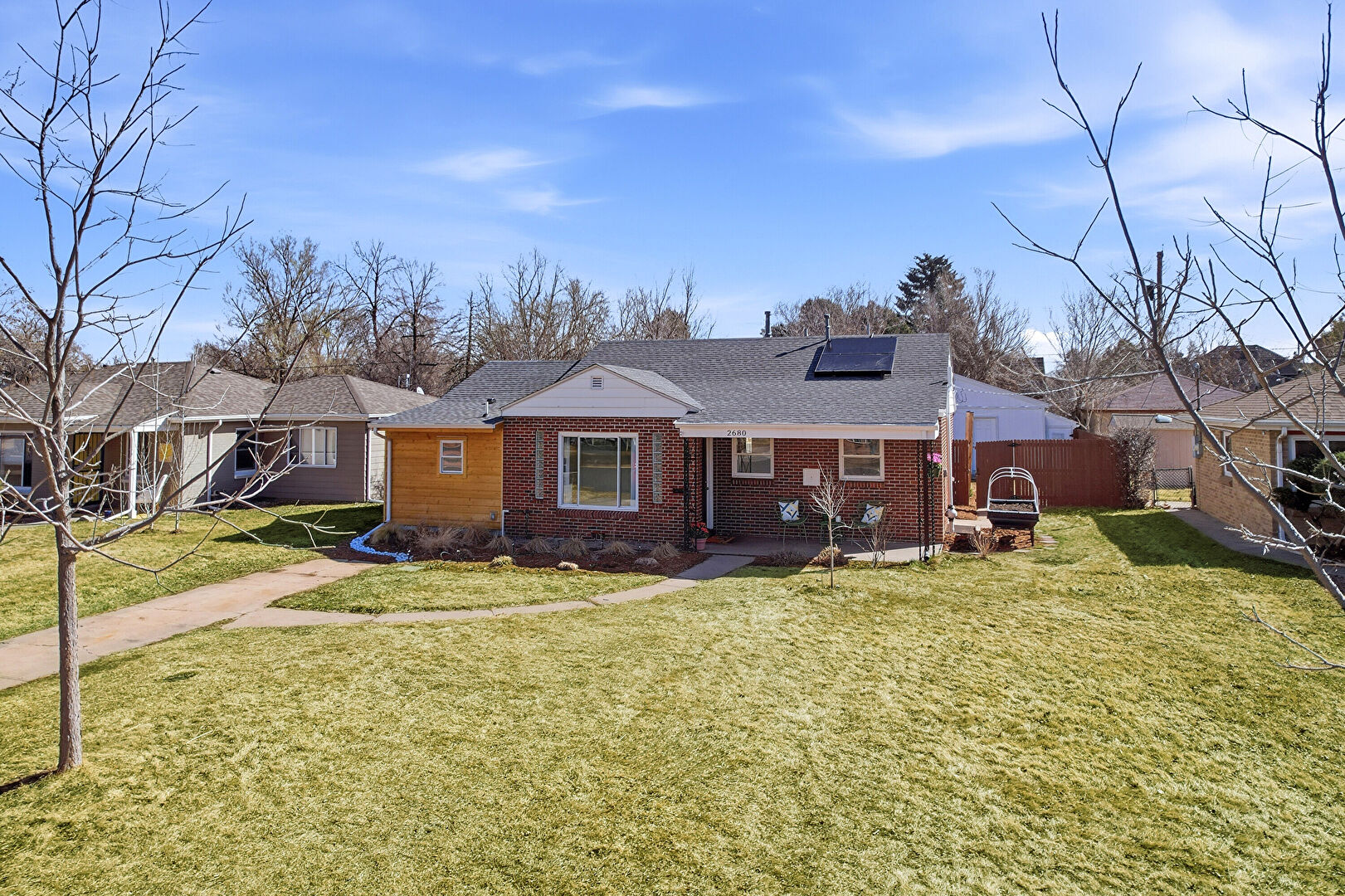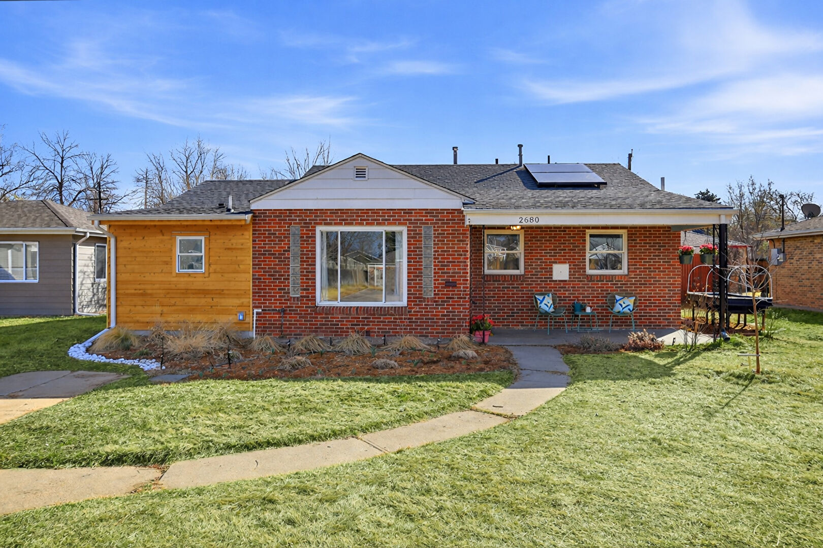 Brick Siding, Concrete Foundation, Downspout, Fence, Gutters, Horizontal Siding, Lawn, Porch, Satellite Dish, Shingle Roof, Solar Panels, Brick Siding, Downspout, Horizontal Siding, Lawn, Satellite Dish