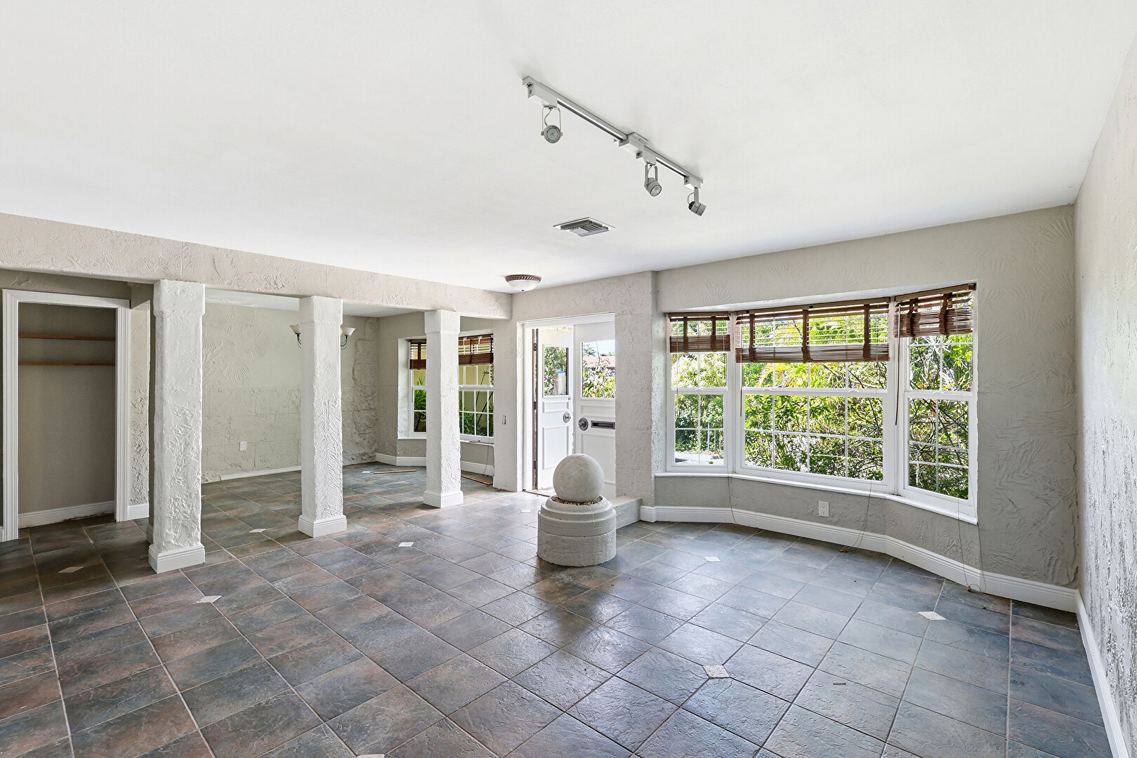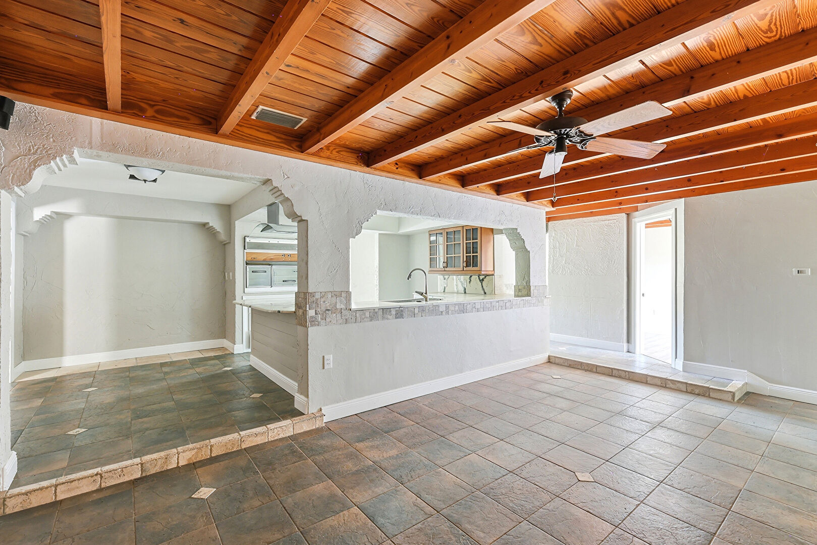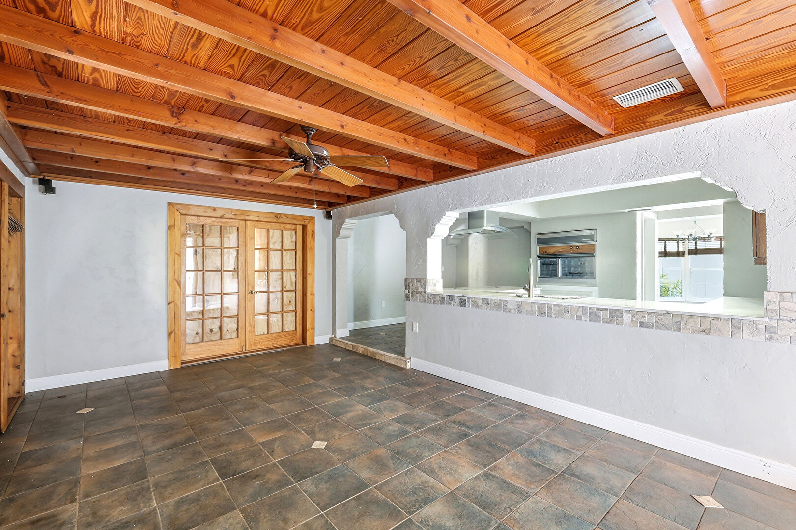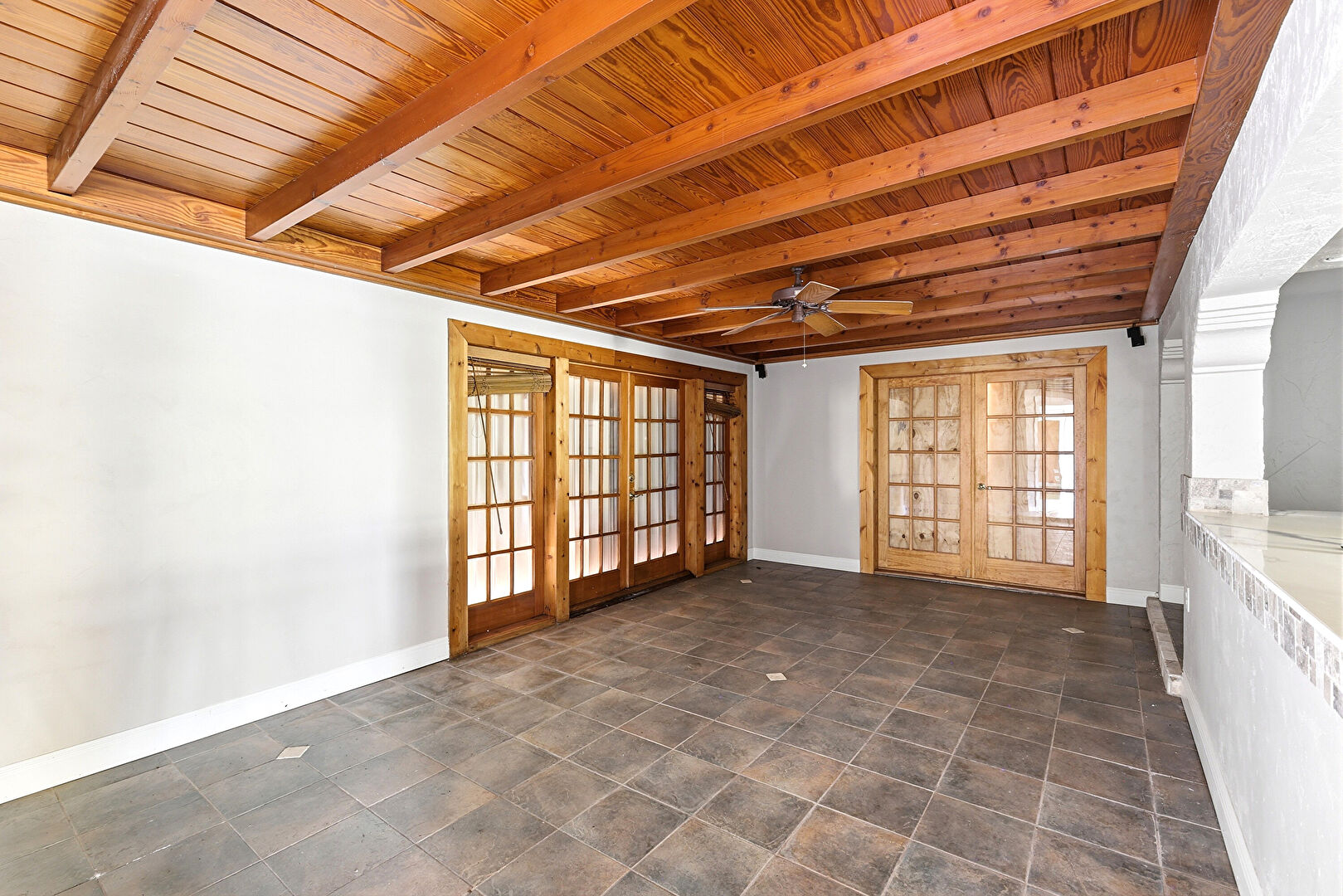 Baseboards Wall, Beamed Ceiling, Ceiling Fan, Drywall, French Doors, Natural Light, Outdoor Bar, Patio, Stone Finish Floor, Vent, Wood Ceiling, Textured Wall, Vent, Wood Ceiling