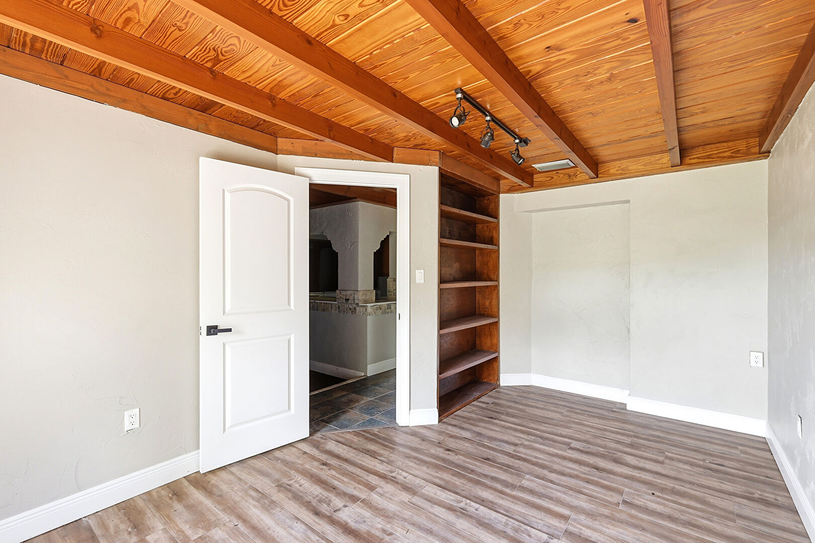 Baseboards Wall, Beamed Ceiling, Built In Shelves, Drywall, Natural Light, Track Lighting, Wood Ceiling, Wood Finish Floor, Built In Shelves, Ceiling Fan