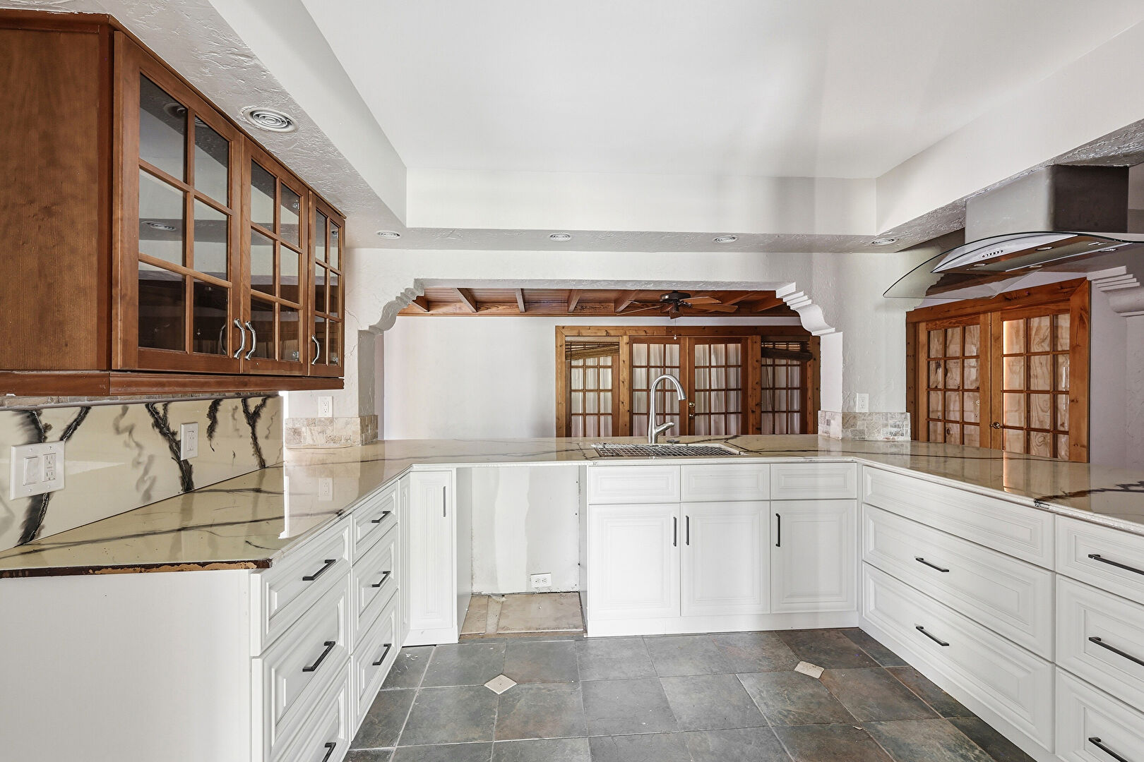 Ceiling Fan, Drywall, French Doors, Glass Insert Cabinets, Kitchen Peninsula, Medium Brown Cabinets, Pass Through Window, Raised Cabinets, Recessed Lighting, Shaker Cabinets, Stone Countertops, Stone Finish Floor, Vent, Baseboards Wall, Drywall, Raised Cabinets