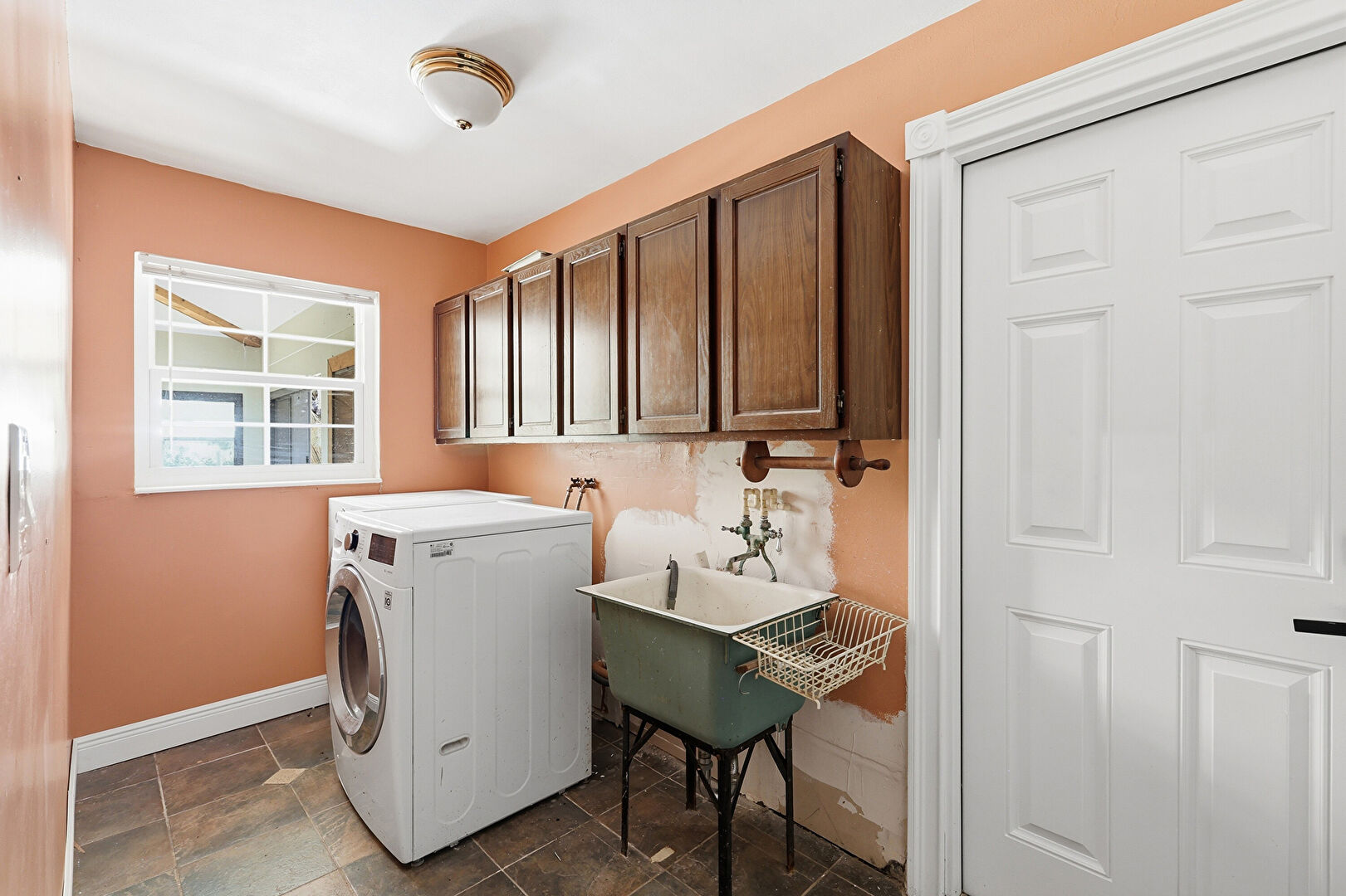 Baseboards Wall, Drywall, Laundry, Natural Light, Stone Finish Floor, Washer Dryer, Washer Hookup