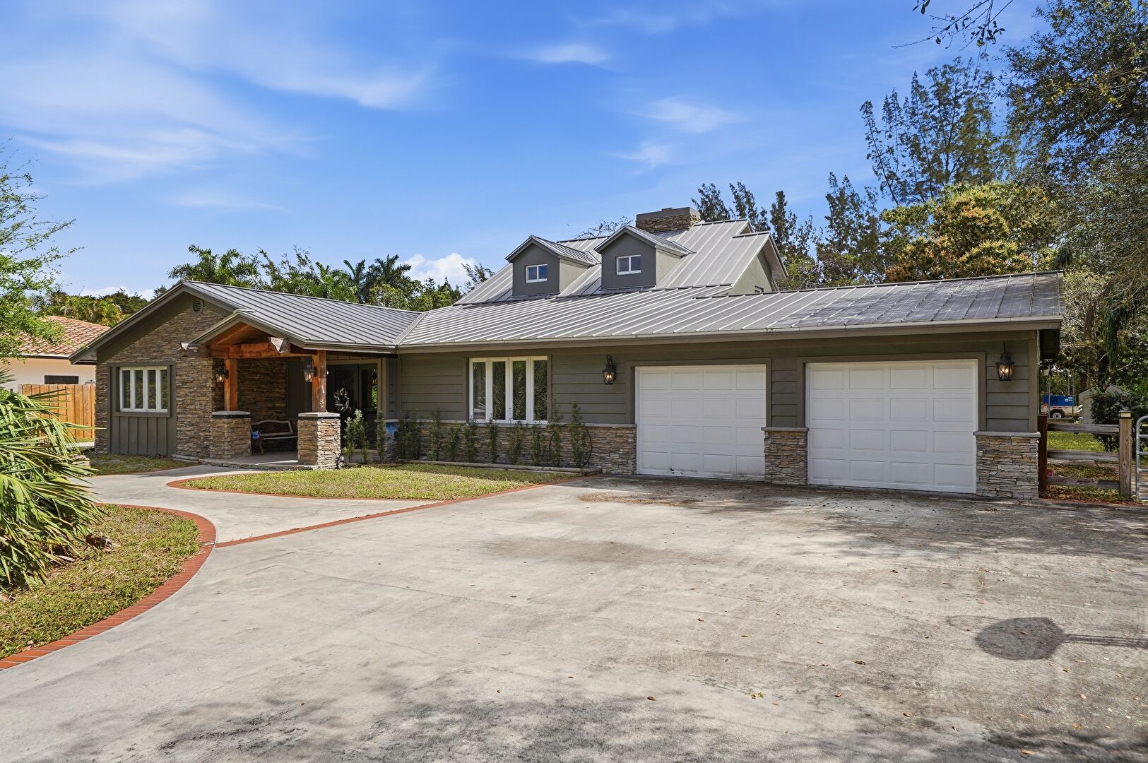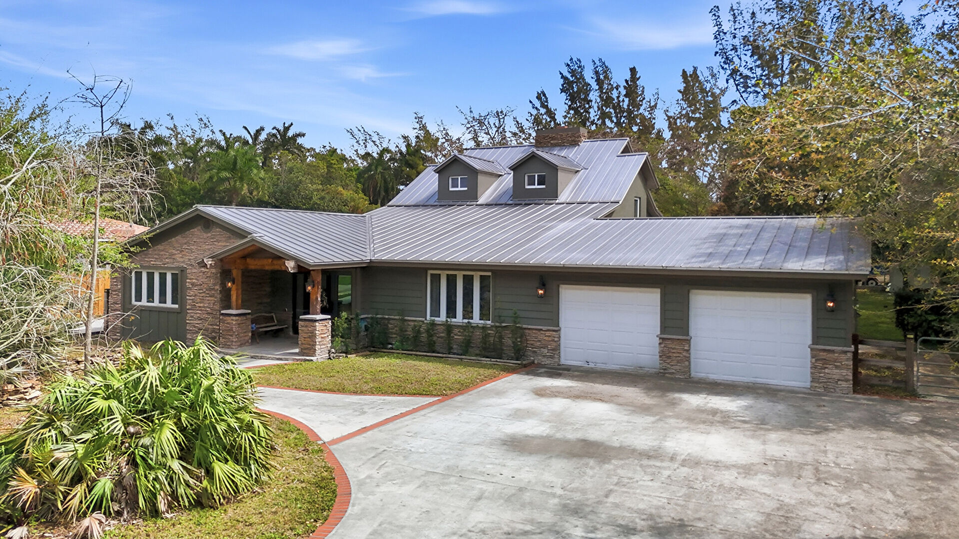 Board Batten Siding, Dormer Roof, Driveway, Fence, Horizontal Siding, Lawn, Metal Roof, Porch, Standing Seam Roof, Stone Siding, Stucco Siding, Vertical Siding, Woods View, Chimney, Dormer Roof, Driveway, Parking Pad, Standing Seam Roof, Stone Siding