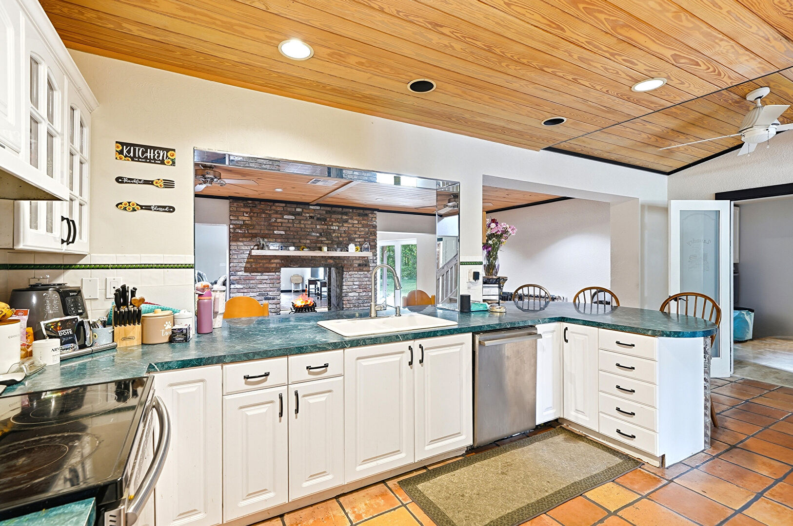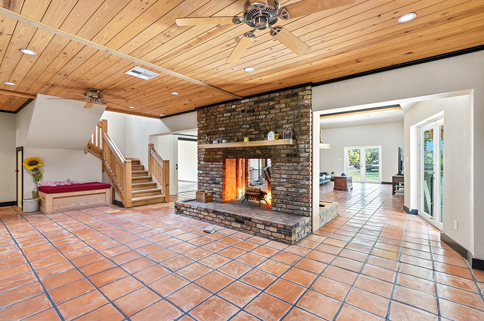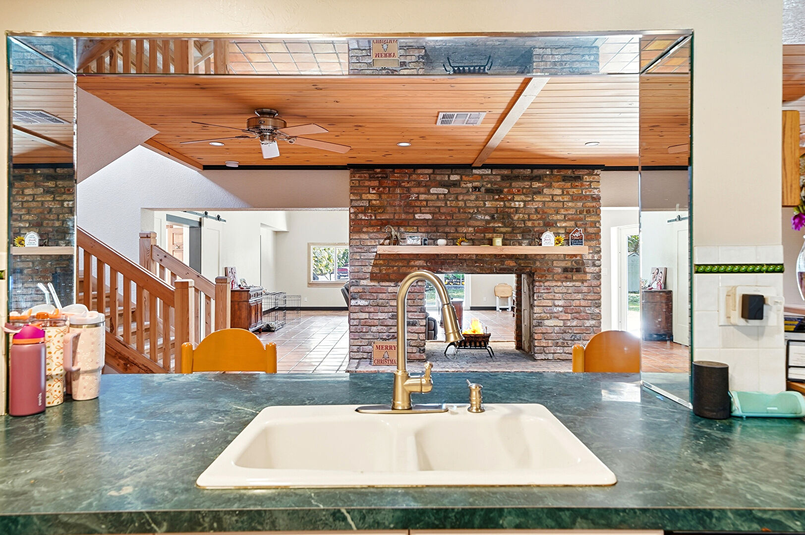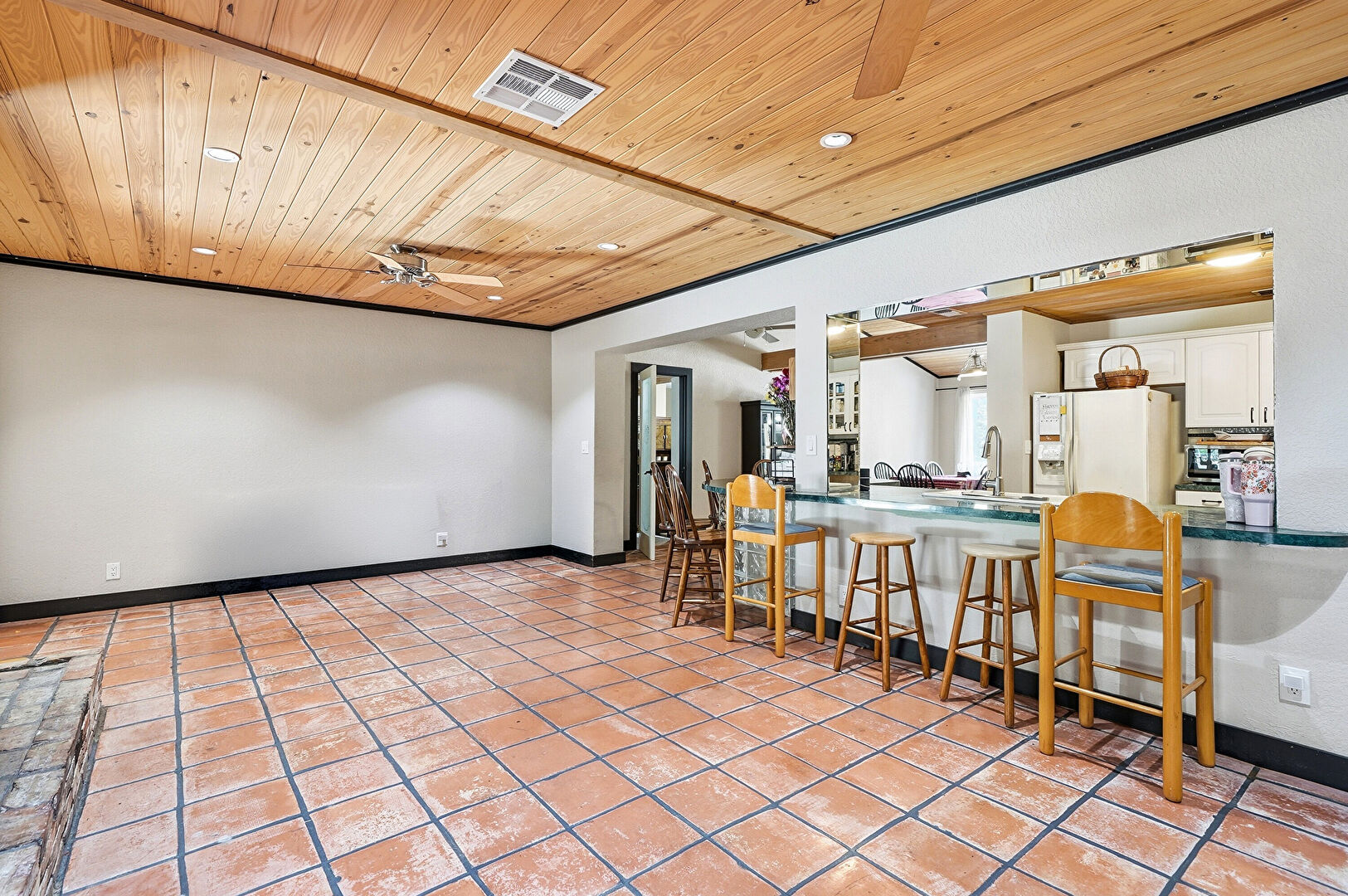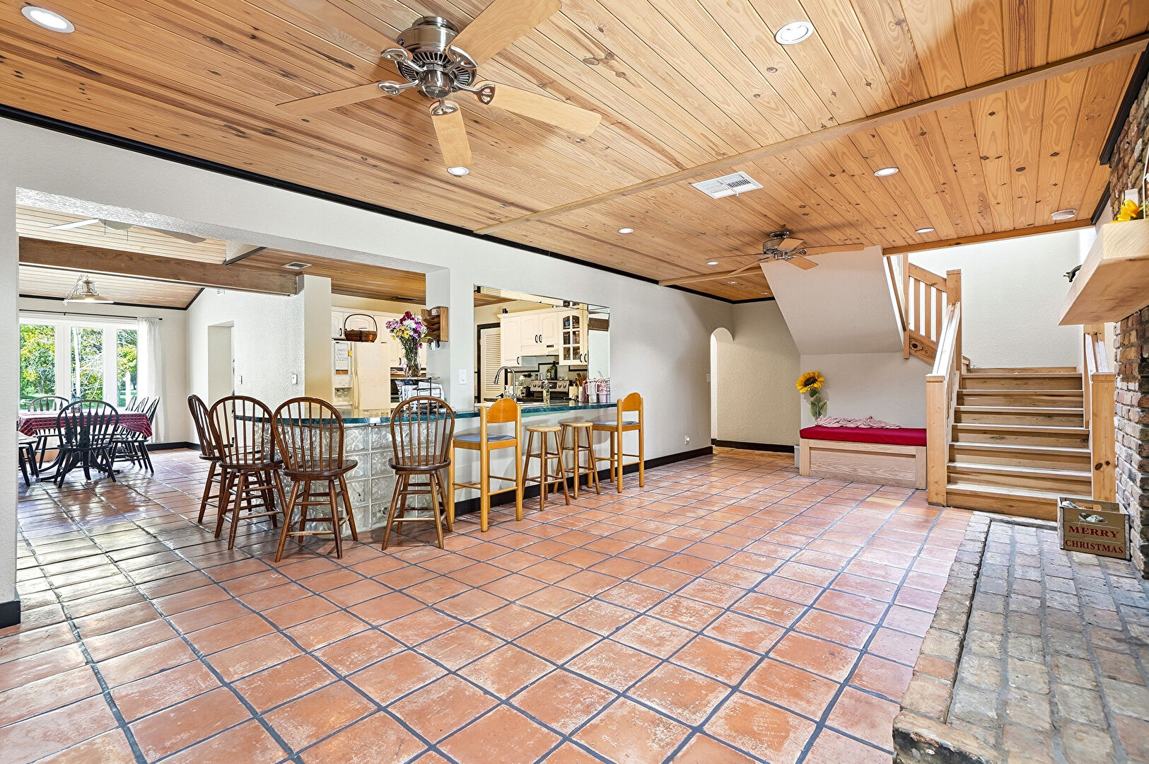 Arched Cabinets, Barn Door, Baseboards Wall, Beamed Ceiling, Ceiling Fan, Drywall, Fireplace, High Ceiling, Kitchen Bar, Kitchen Peninsula, Natural Light, Pass Through Window, Raised Cabinets, Recessed Lighting, Skylight, Stairs, Tile Floor, Vaulted Ceiling, Vent, Wood Ceiling, Beamed Ceiling, Ceiling Fan, Drywall, Fireplace, Tile Floor