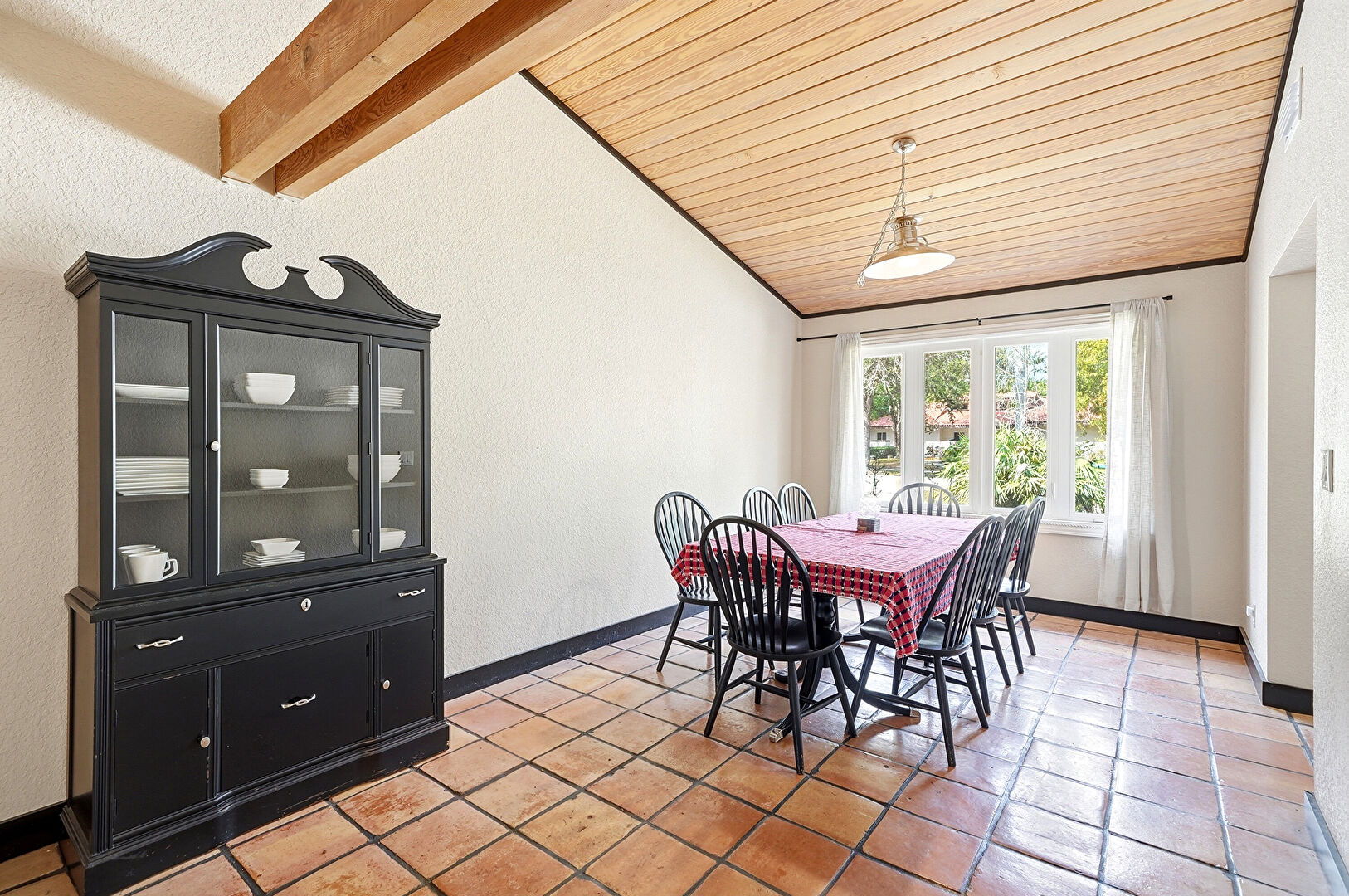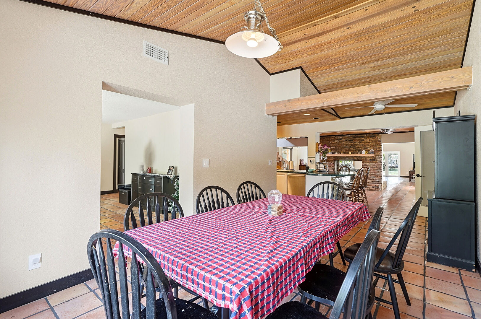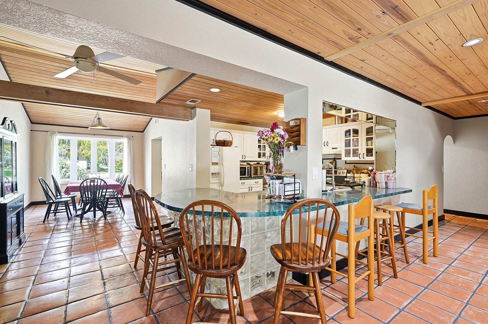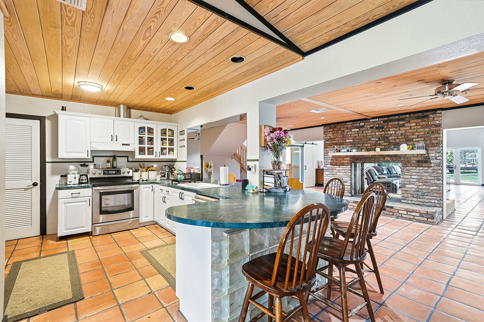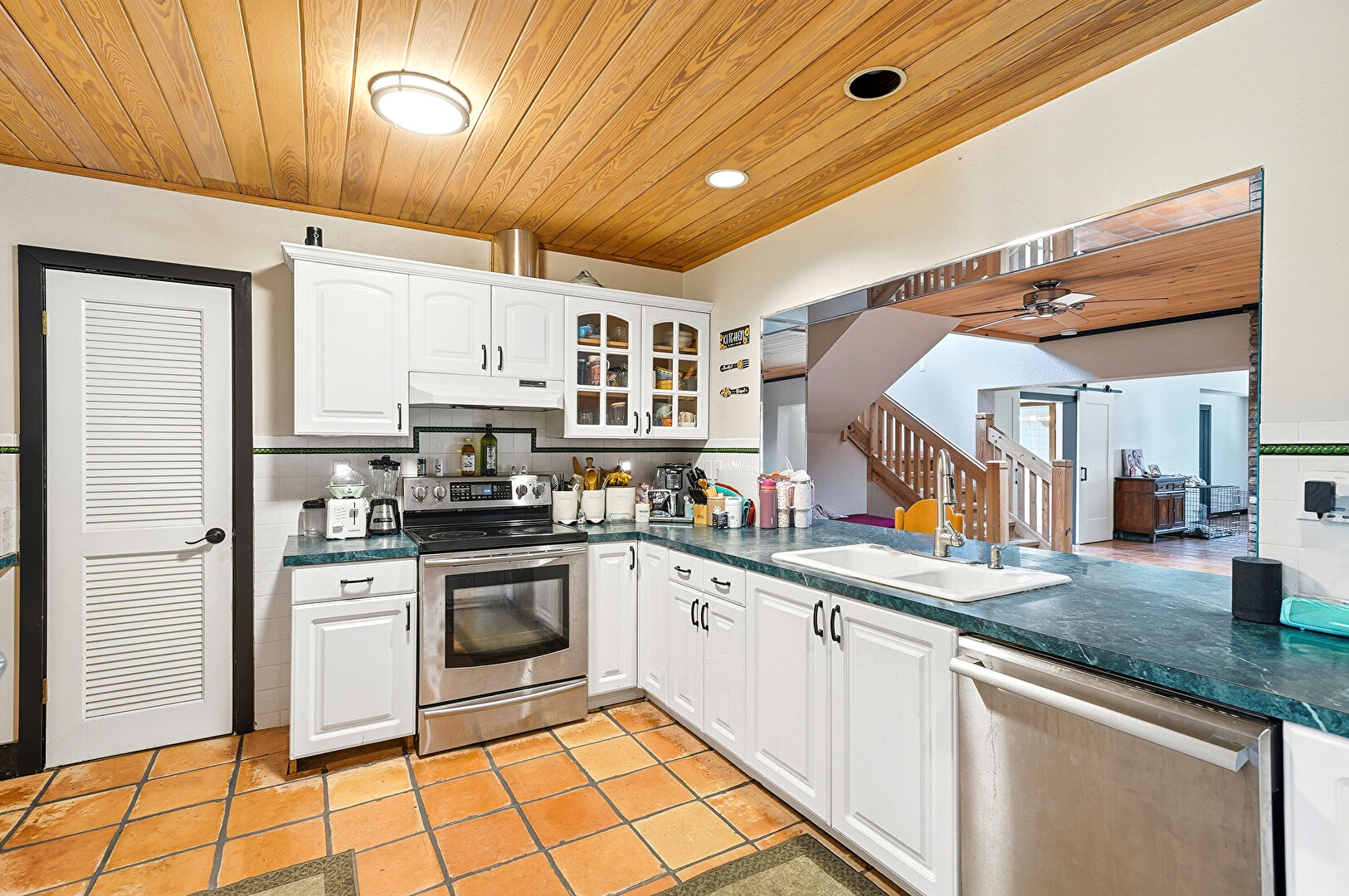 Arched Cabinets, Barn Door, Baseboards Wall, Beamed Ceiling, Ceiling Fan, Drywall, Fireplace, High Ceiling, Kitchen Bar, Kitchen Peninsula, Natural Light, Pass Through Window, Raised Cabinets, Recessed Lighting, Skylight, Stairs, Tile Floor, Vaulted Ceiling, Vent, Wood Ceiling, Beamed Ceiling, Ceiling Fan, Drywall, Fireplace, Tile Floor