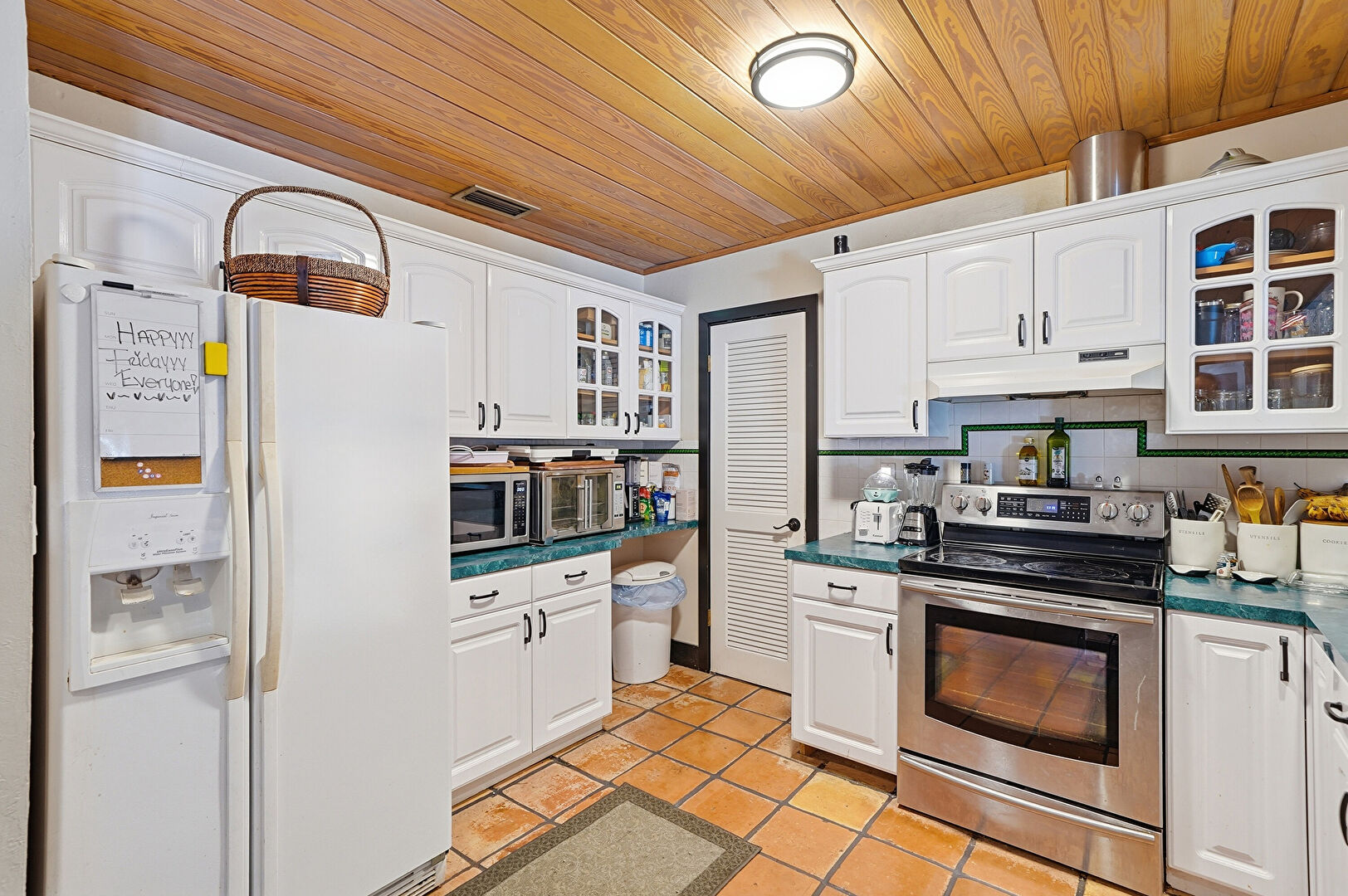 Arched Cabinets, Arched Walkways, Baseboards Wall, Beamed Ceiling, Ceiling Fan, Crown Molding Cabinets, Drywall, Fireplace, Glass Insert Cabinets, Kitchen Bar, Kitchen Peninsula, Natural Light, Opens To Living Area, Pass Through Window, Raised Cabinets, Recessed Lighting, Tile Floor, Toaster, Vaulted Ceiling, Vent, Wood Ceiling, Drywall, Pass Through Window, Raised Cabinets, Wood Ceiling