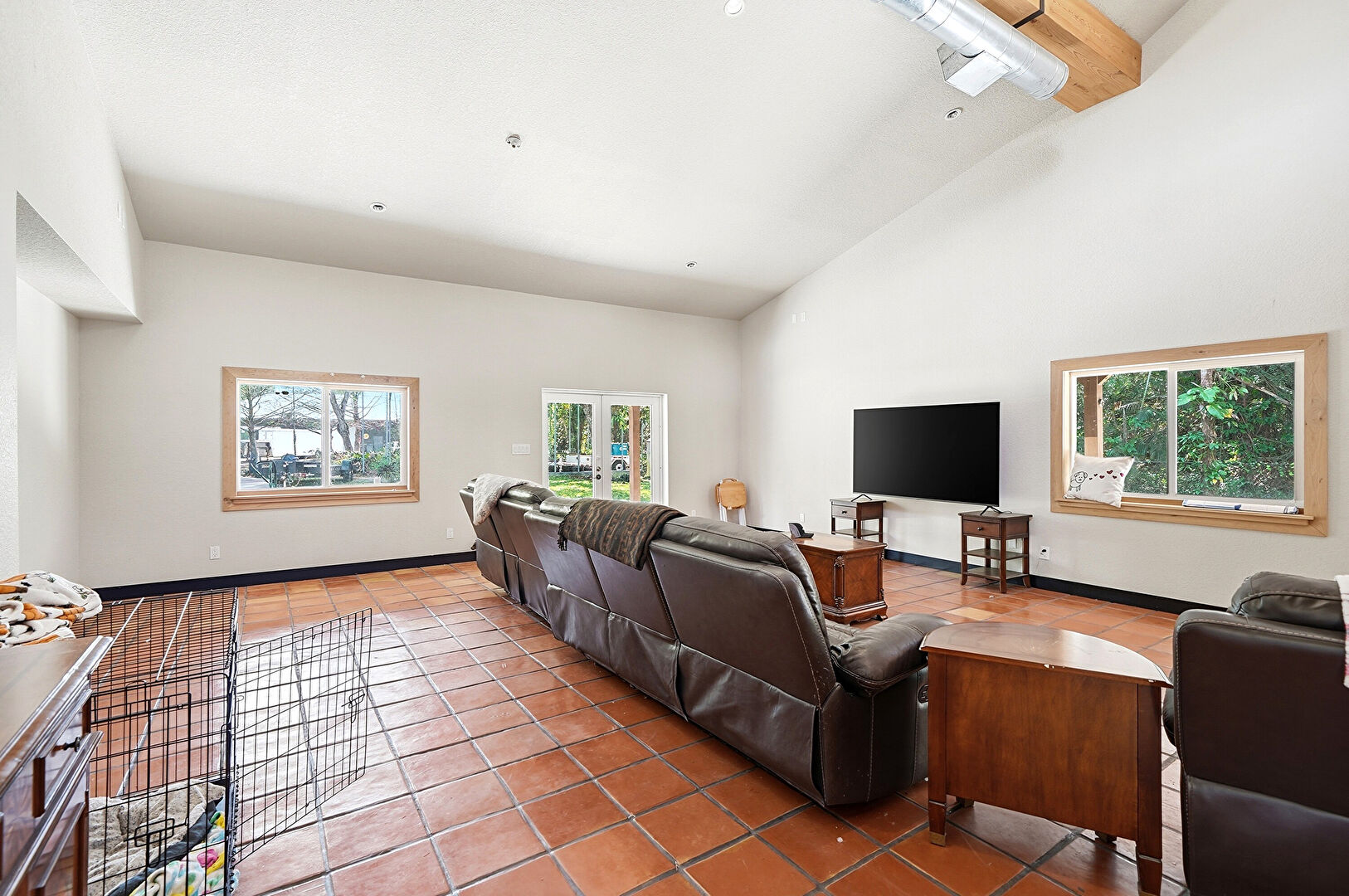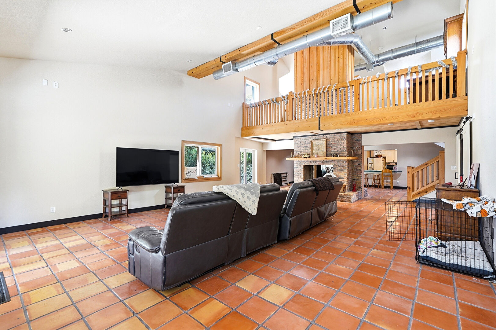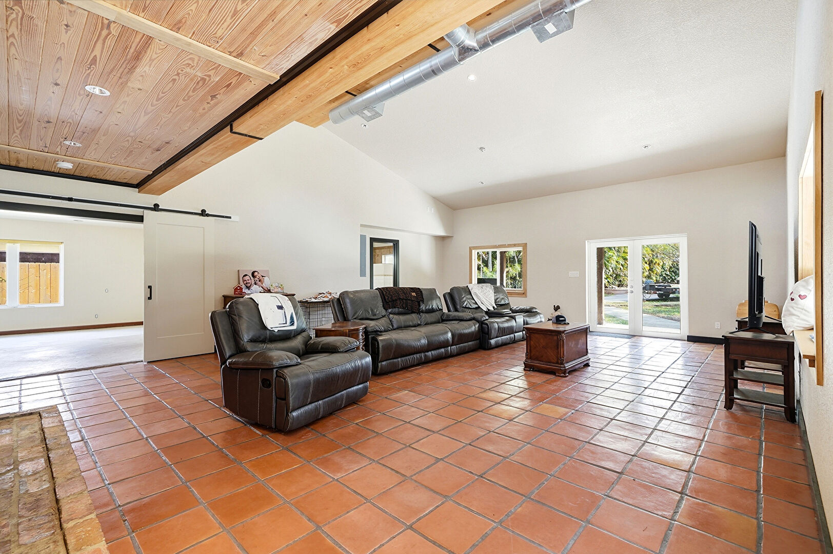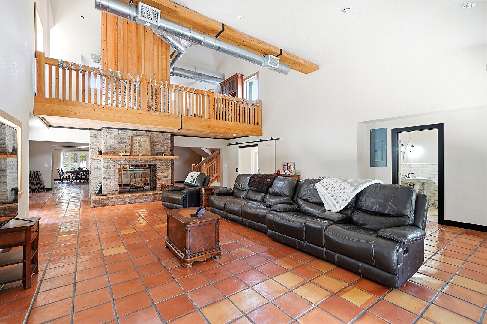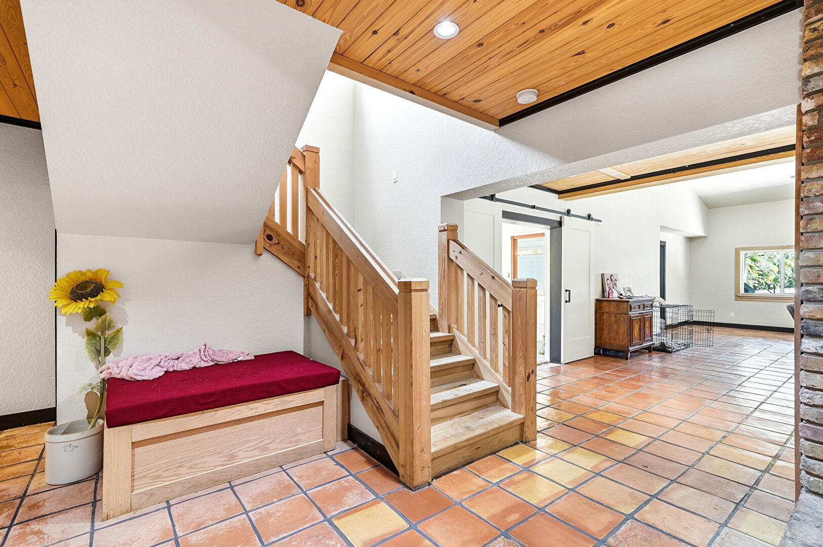 Barn Door, Baseboards Wall, High Ceiling, Natural Light, Recessed Lighting, Stairs, Tile Floor, Wood Ceiling, Smoke Carbon Monoxide Detector