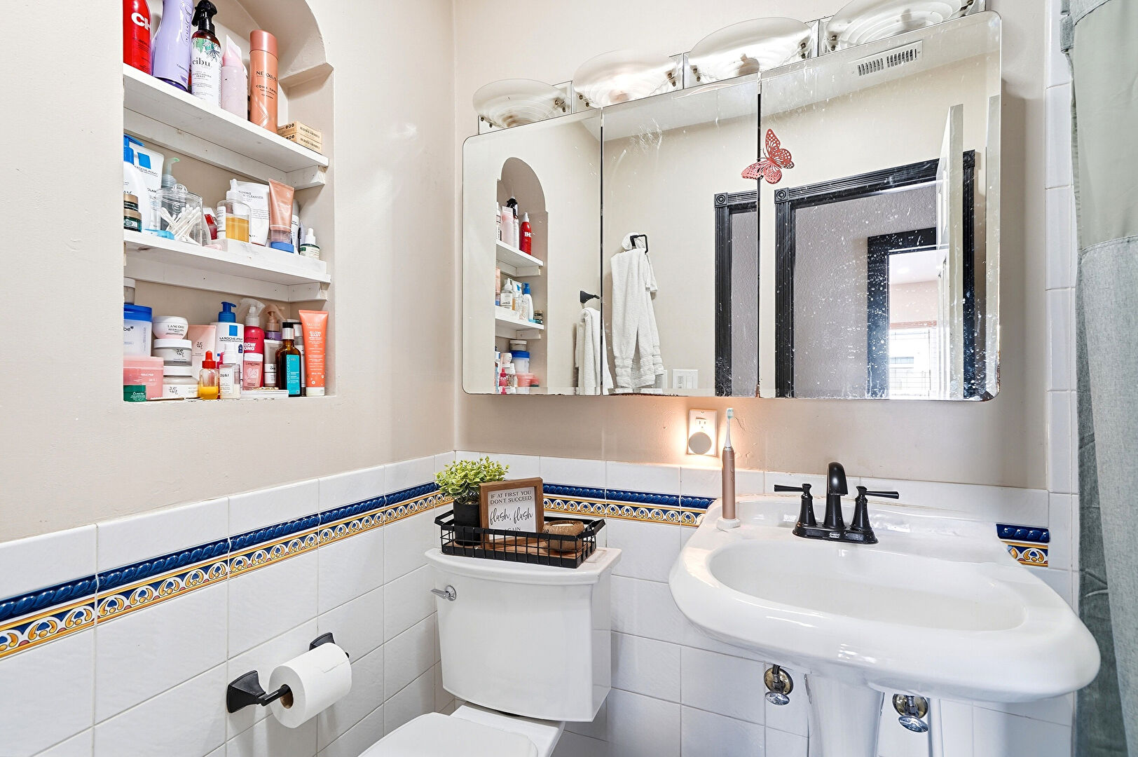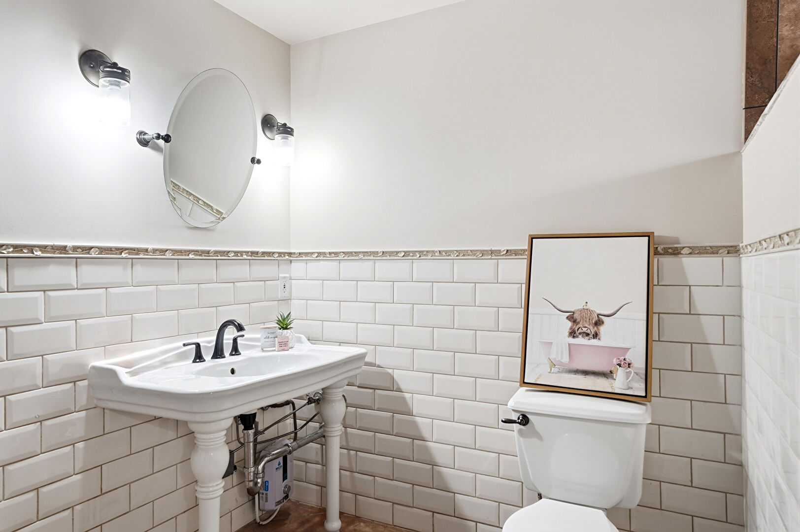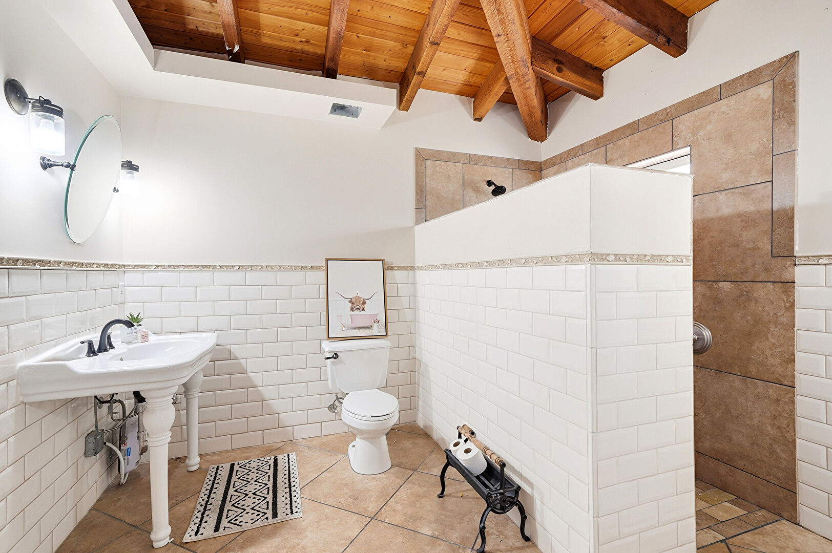 Beamed Ceiling, Drywall, Full Bathroom, Half Bathroom, Tile Floor, Tile Wall, Vent, Wainscot Wall, Wood Ceiling, Full Bathroom, Tile Wall, Vent