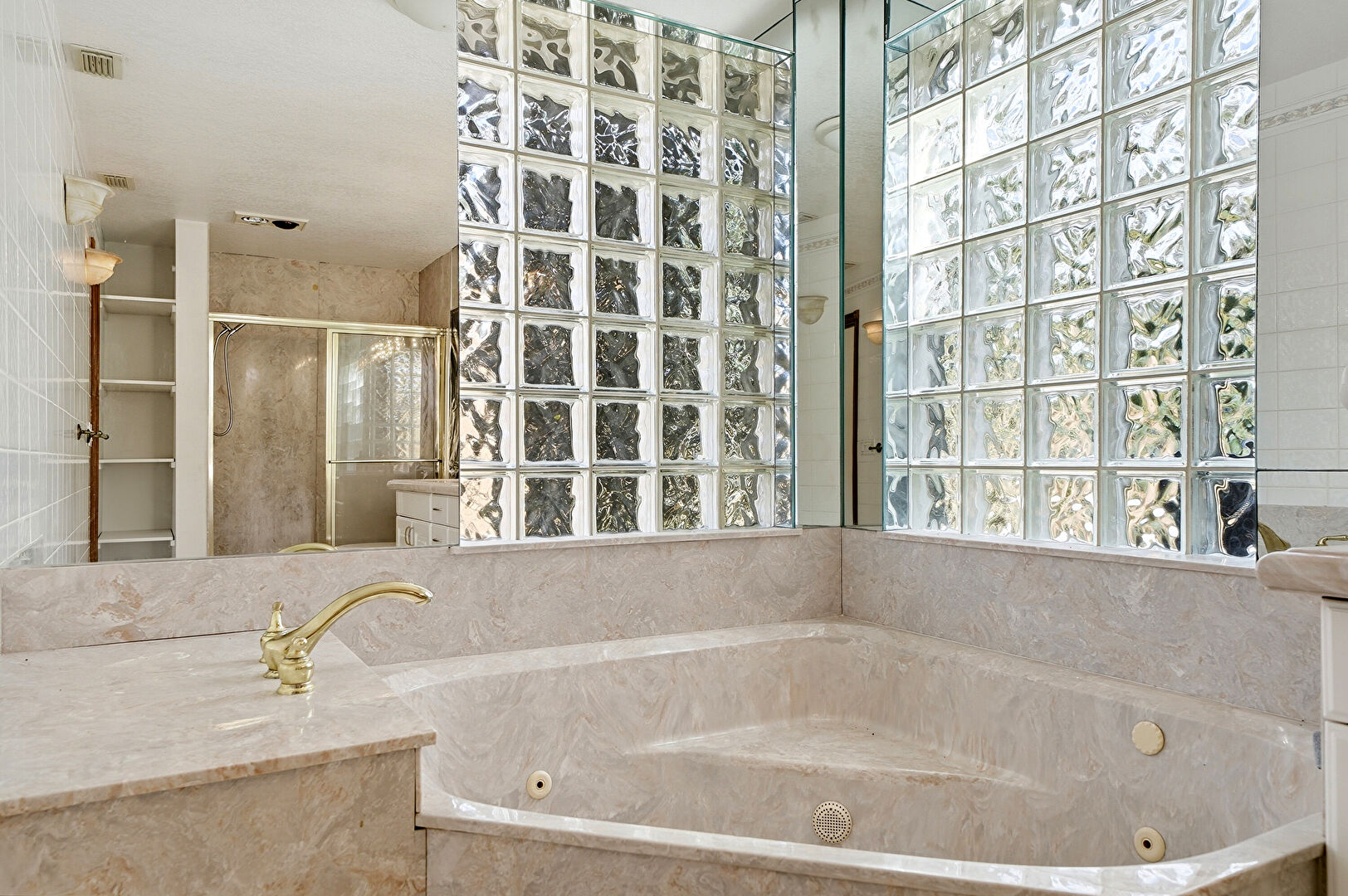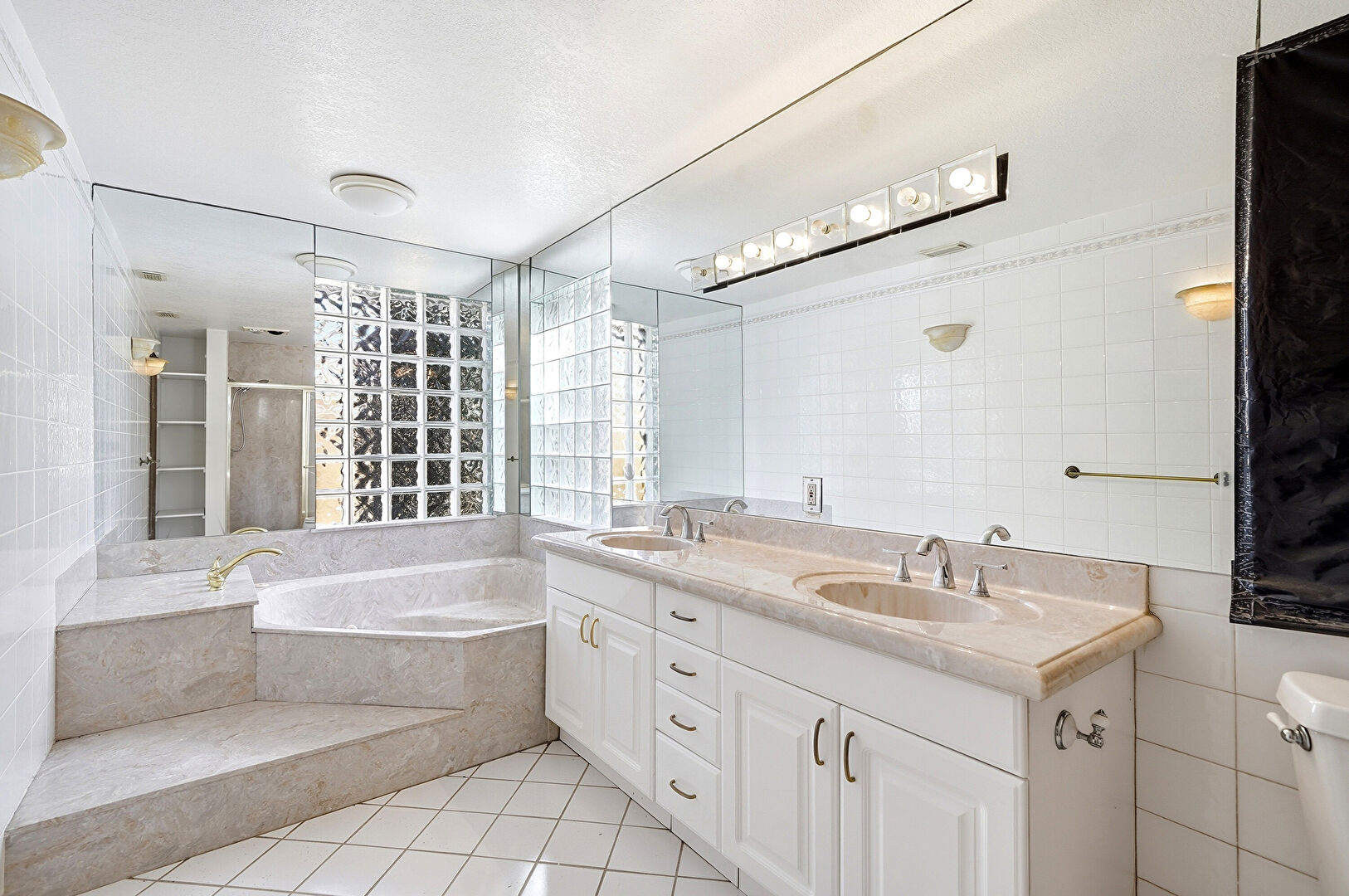 Full Bathroom, Natural Light, Textured Ceiling, Tile Floor, Tile Wall, Vanity, Vent, Walk In Closet, Double Vanity, Natural Light