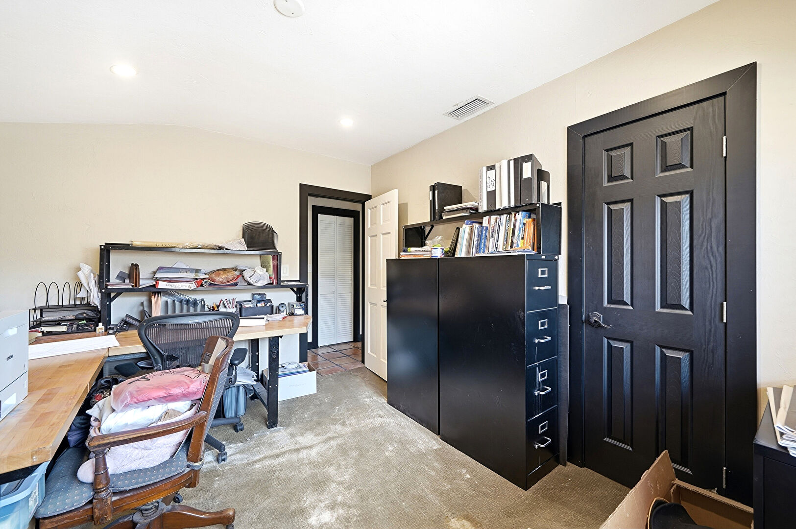 Baseboards Wall, Carpet, Drywall, Natural Light, Office Area, Recessed Lighting, Vaulted Ceiling, Vent, Drywall, Recessed Lighting, Vaulted Ceiling