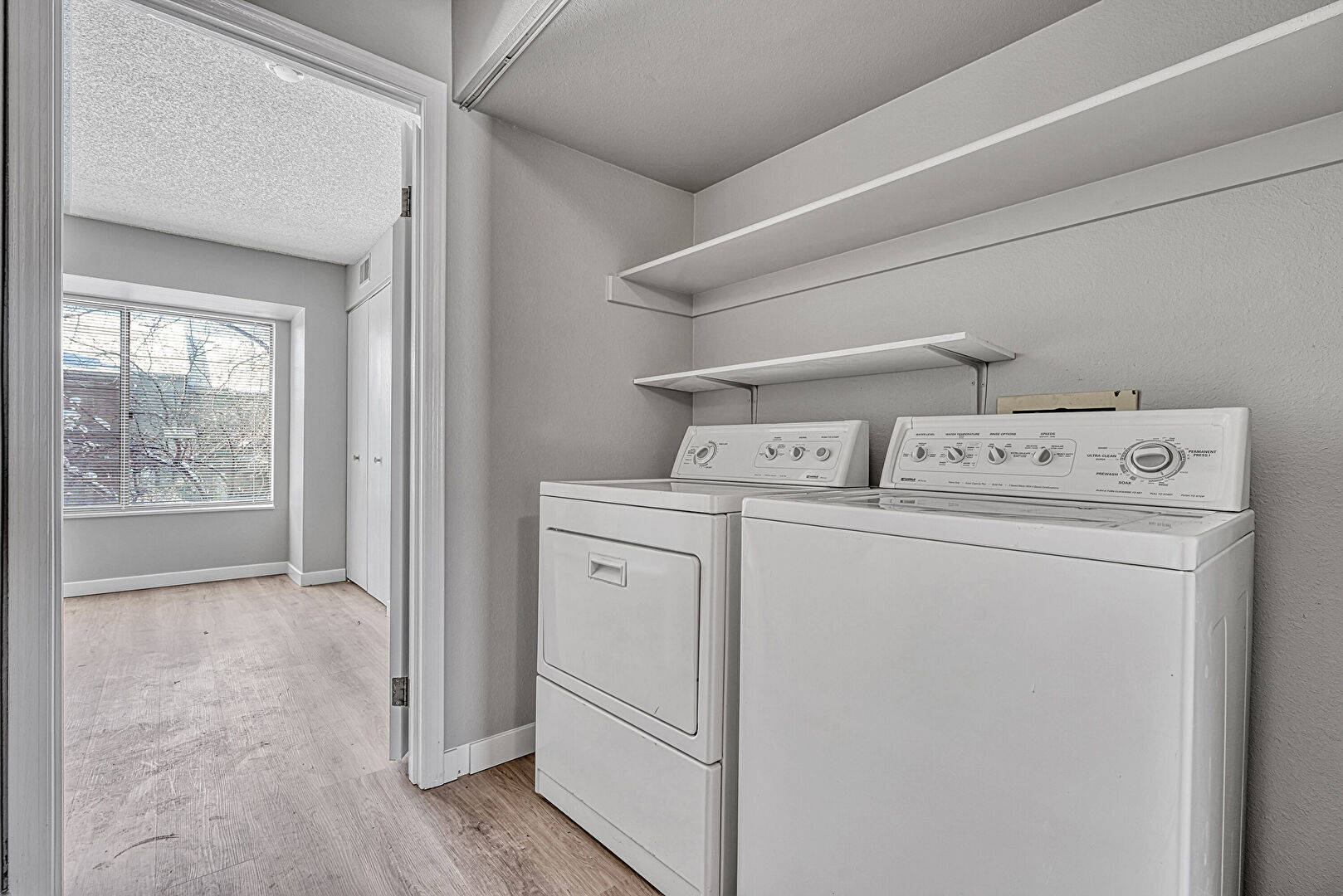 Baseboards Wall, Laundry, Natural Light, Textured Ceiling, Wood Finish Floor, Drywall