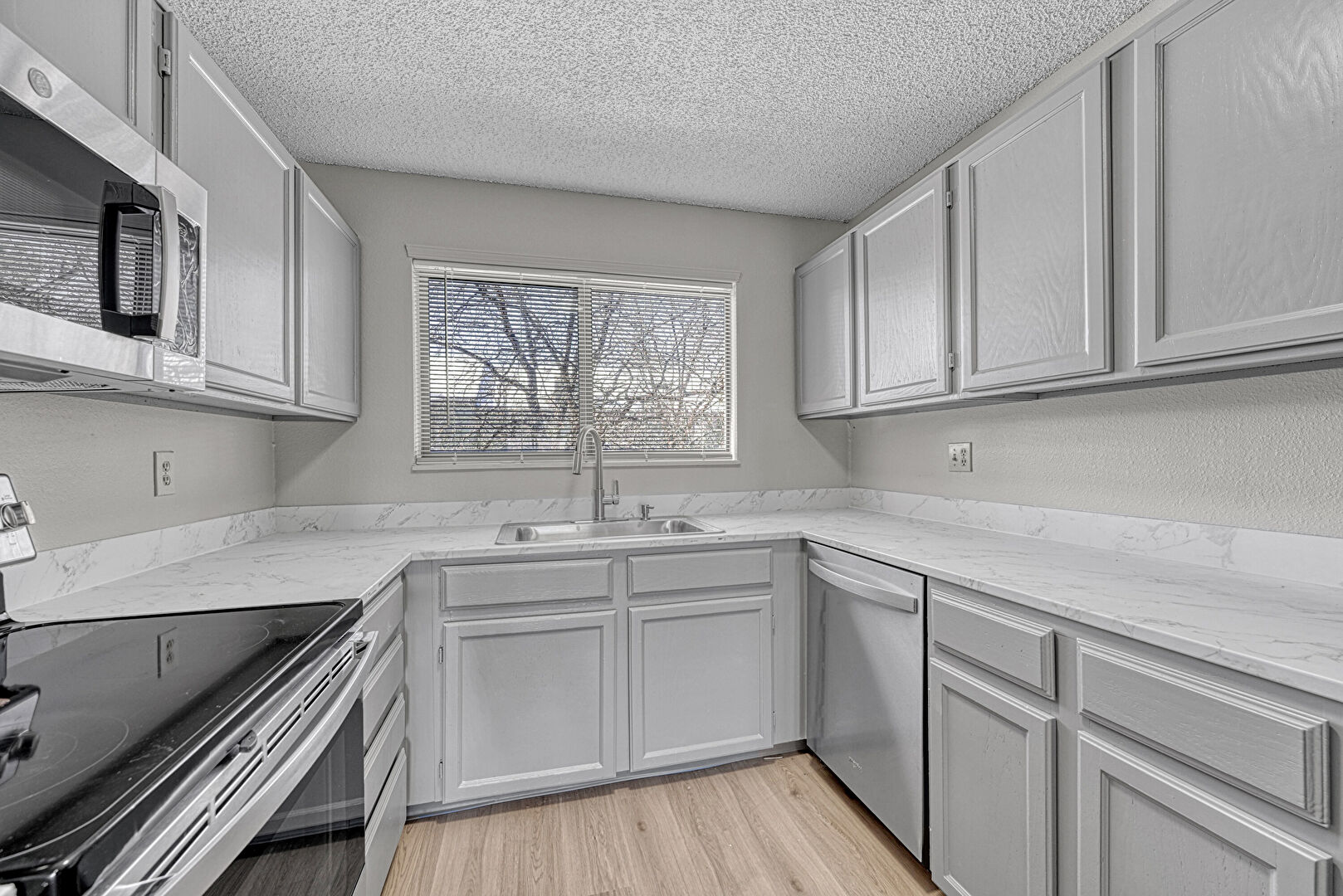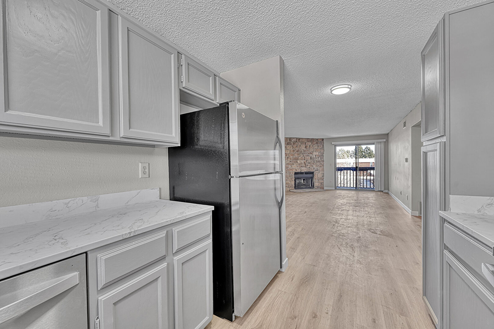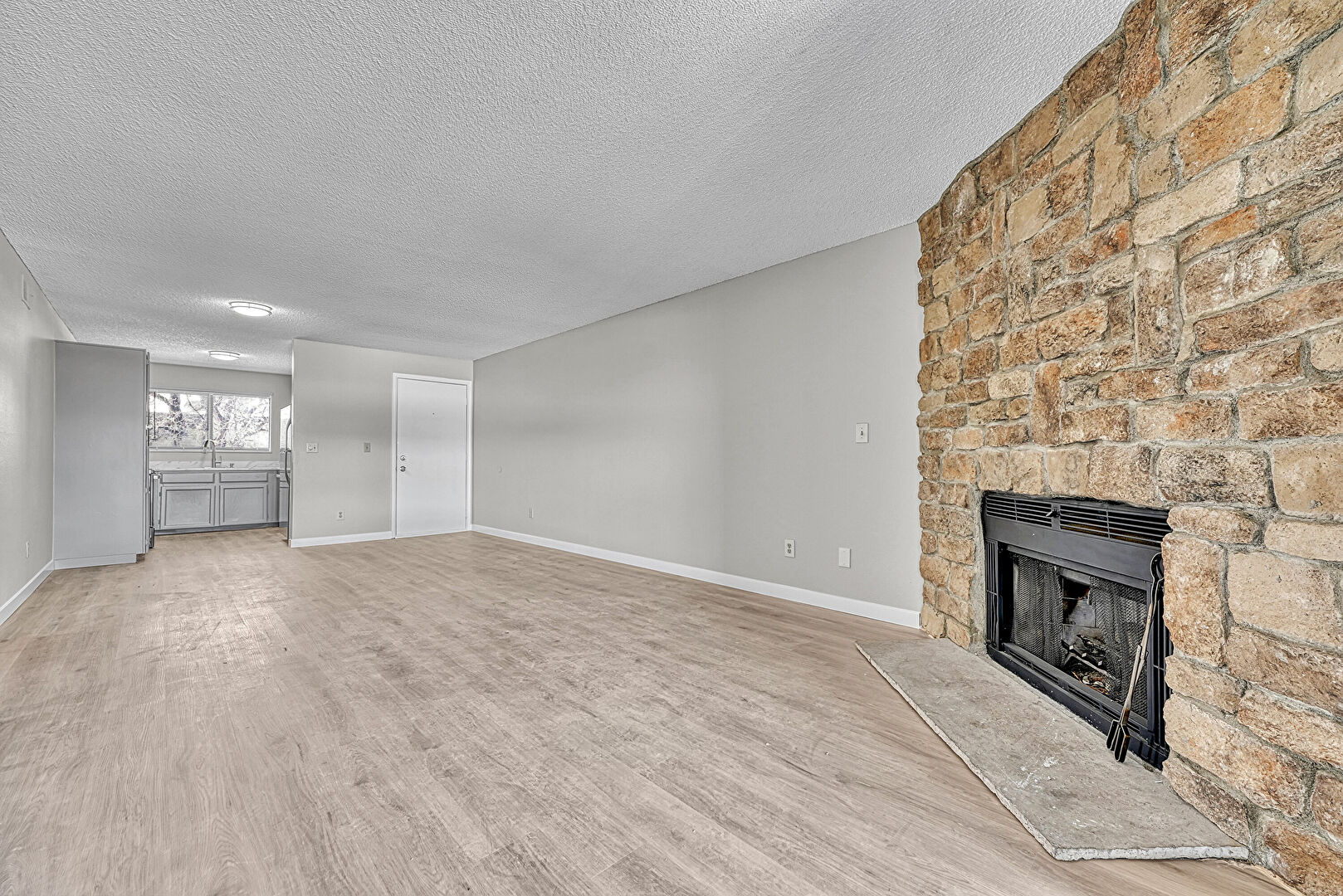 Baseboards Wall, Drywall, Fireplace, Gray Cabinets, Natural Light, Opens To Living Area, Shaker Cabinets, Stone Countertops, Textured Ceiling, Textured Wall, Visible Hinge Cabinets, Wood Finish Floor, Drywall, Gray Cabinets, Wood Finish Floor