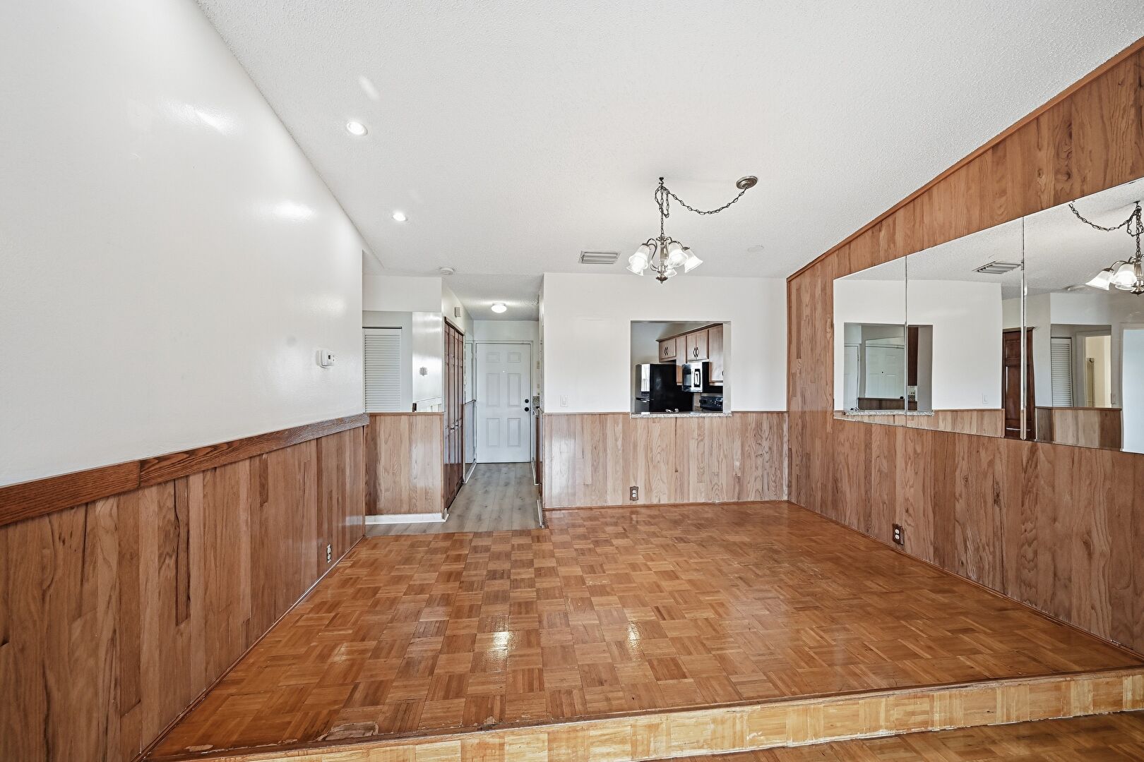 Notable Chandelier, Recessed Lighting, Vent, Wainscot Wall, Wood Finish Floor, Wood Wall, Drywall