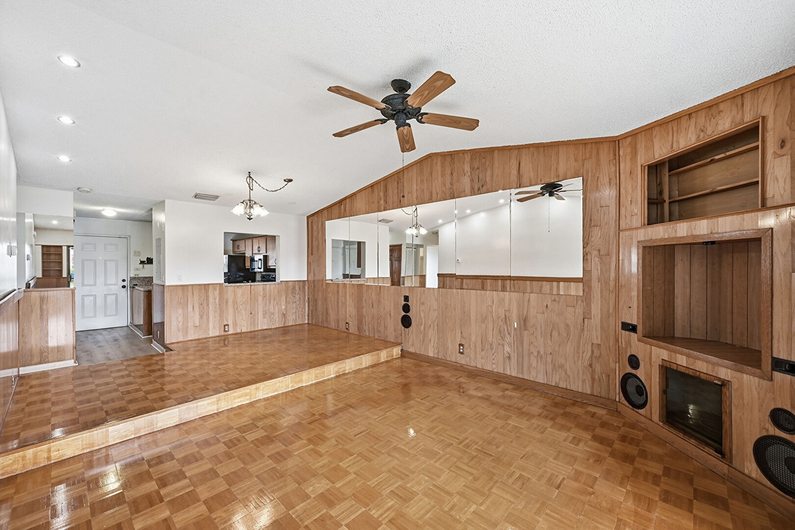 Baseboards Wall, Cathedral Ceiling, Ceiling Fan, Natural Light, Notable Chandelier, Recessed Lighting, Textured Ceiling, Vaulted Ceiling, Vent, Wainscot Wall, Wood Finish Floor, Wood Wall, Cathedral Ceiling, Drywall