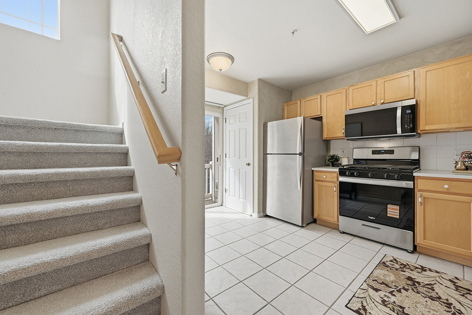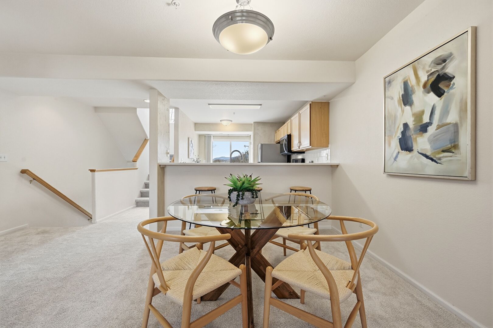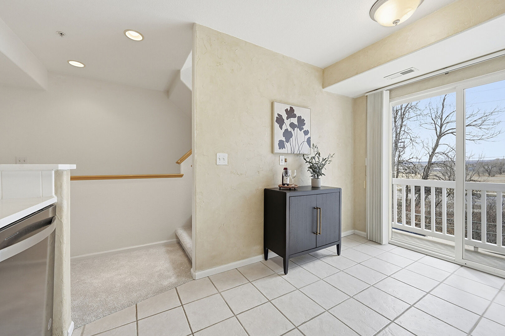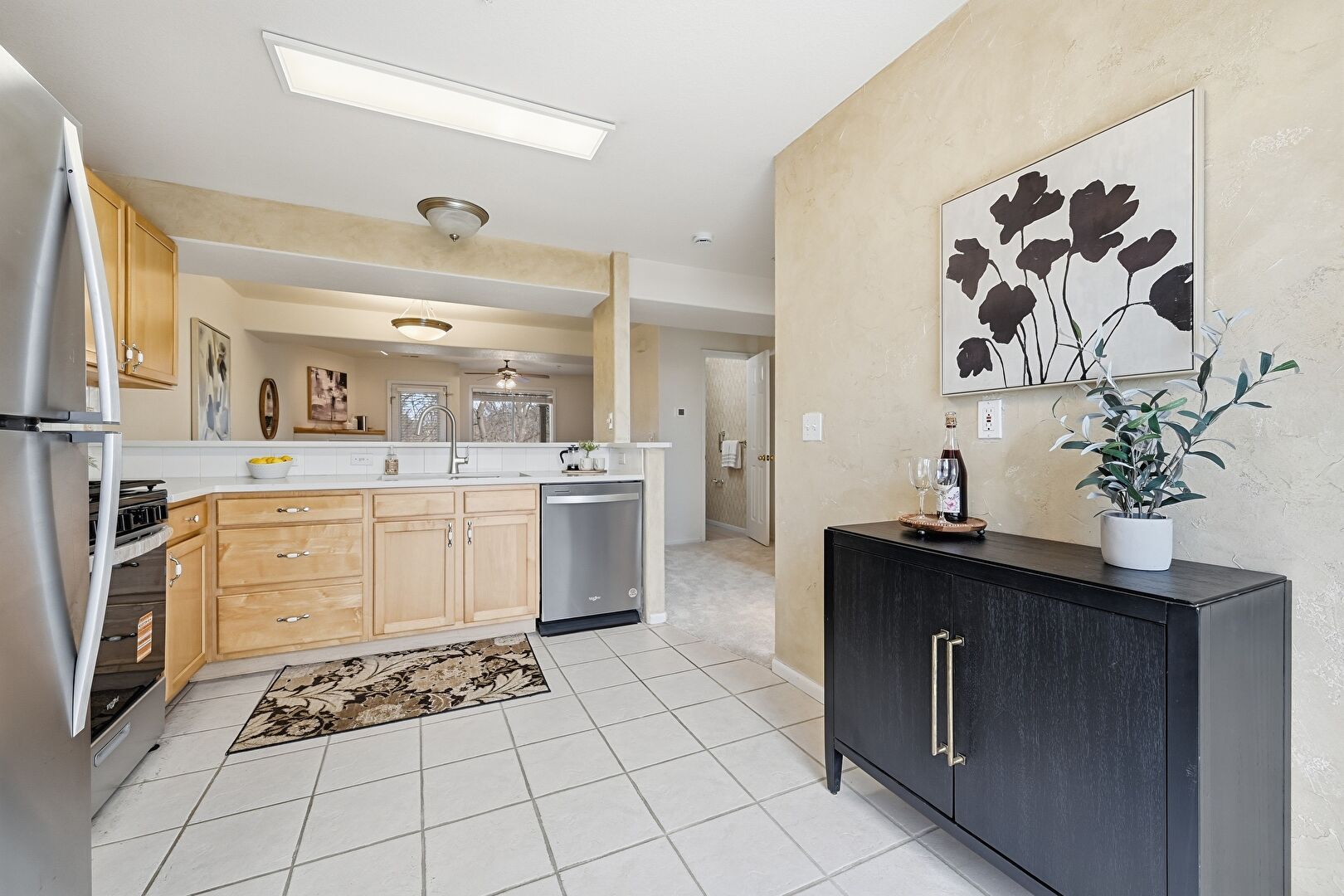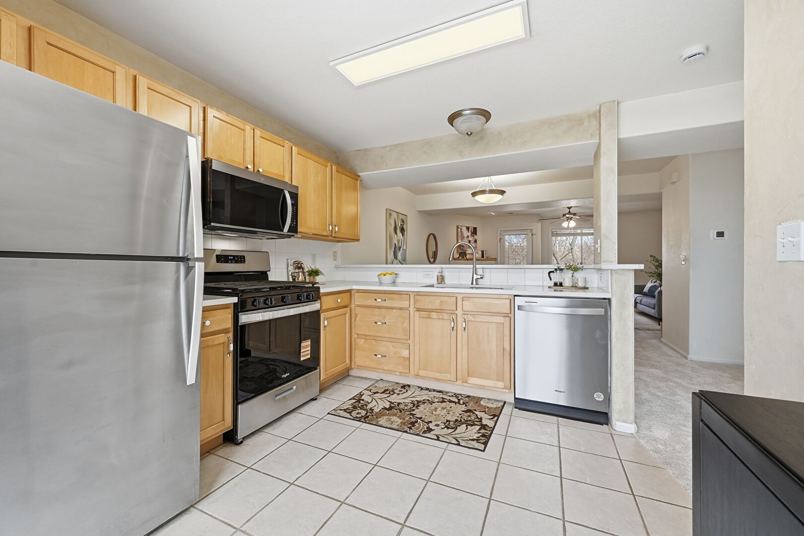 Baseboards Wall, Carpet, Ceiling Fan, Drywall, Full Bathroom, Kitchen Peninsula, Natural Light, Opens To Living Area, Pass Through Window, Recessed Lighting, Shaker Cabinets, Smoke Carbon Monoxide Detector, Textured Wall, Tile Floor, Vanity, Vent, Carpet, Ceiling Fan, Opens To Living Area, Shaker Cabinets, Tile Floor