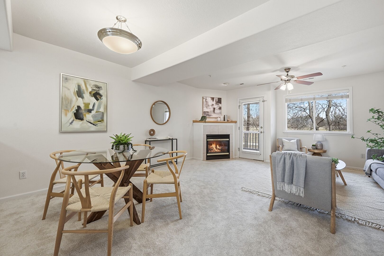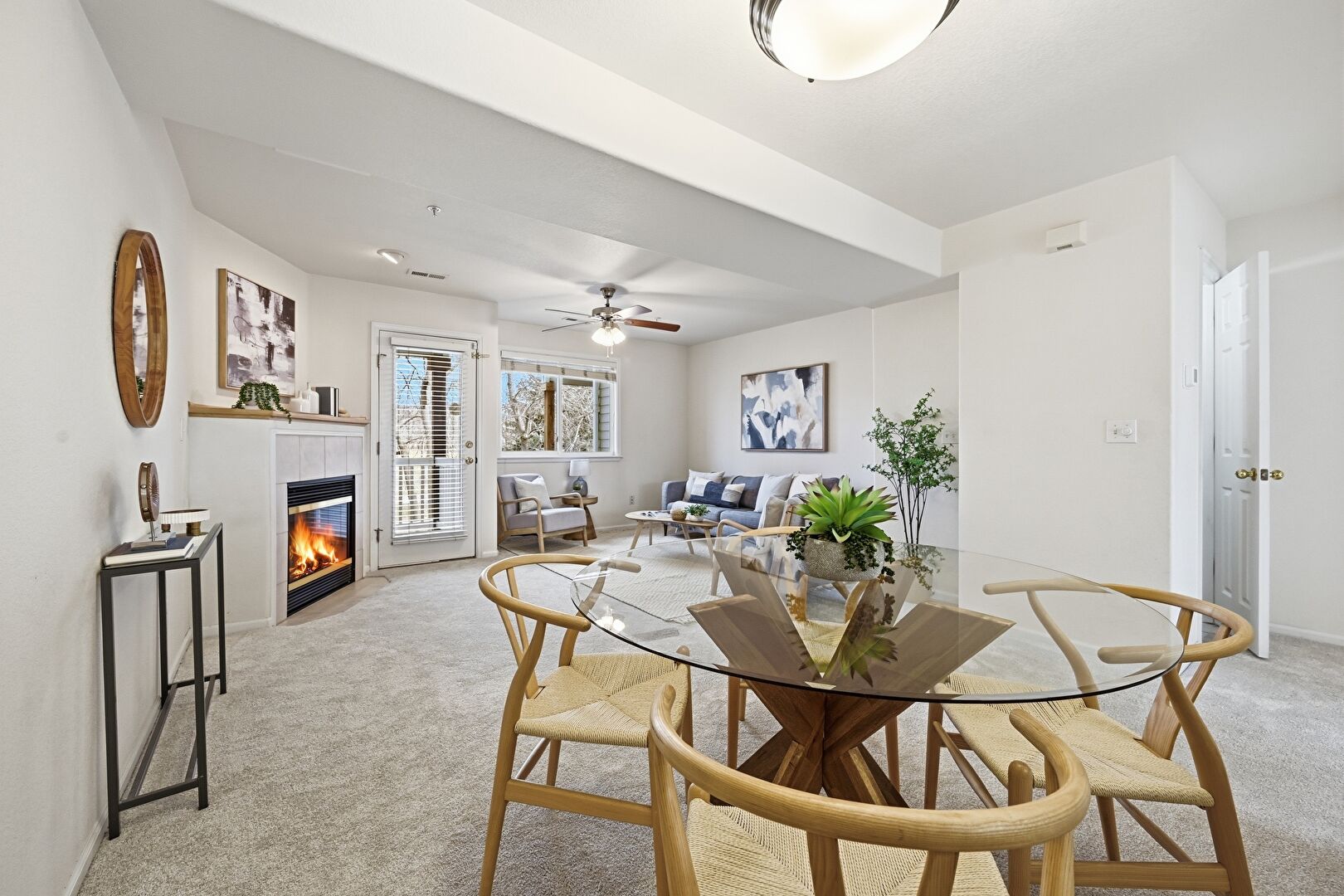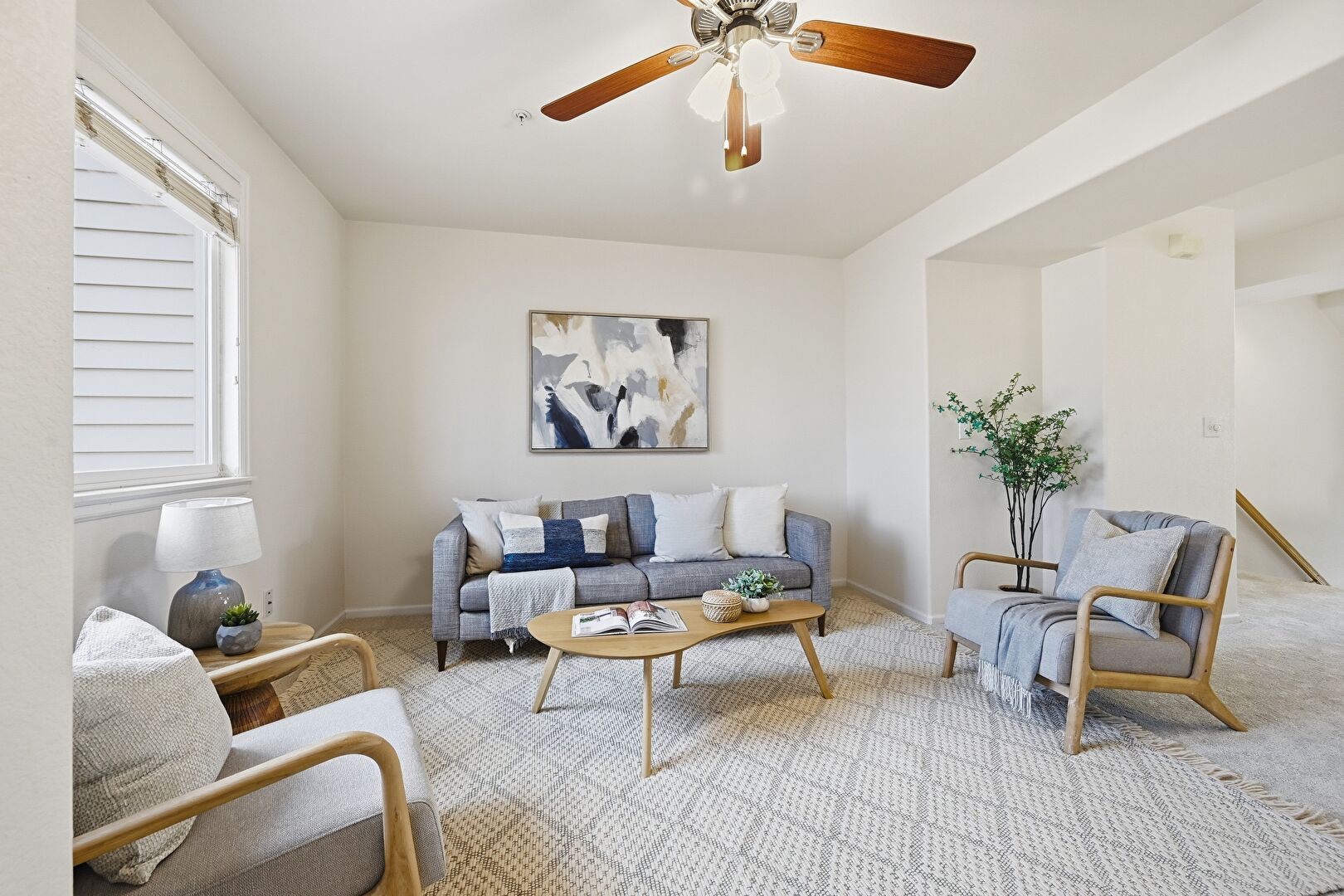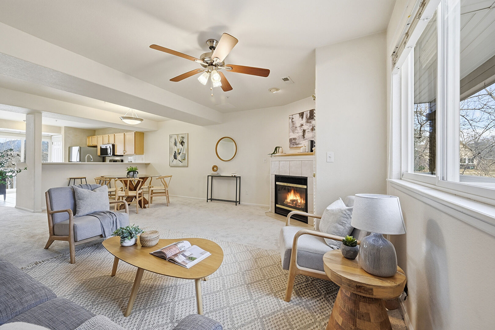 Baseboards Wall, Carpet, Ceiling Fan, Drywall, Fireplace, Natural Light, Stairs, U Shaped Kitchen, Baseboards Wall, Carpet, Ceiling Fan