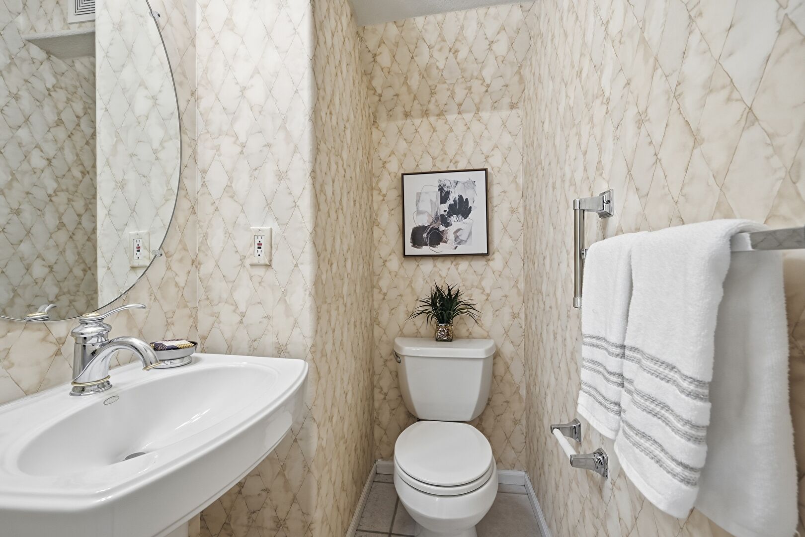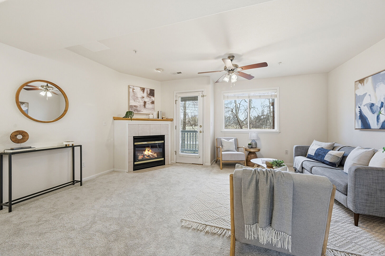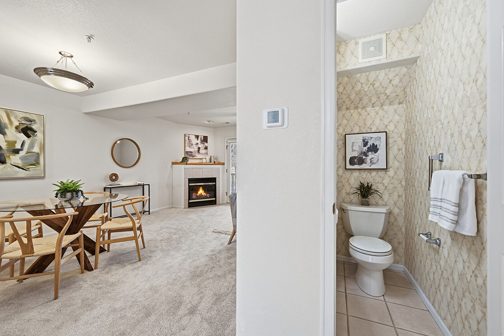 Accent Wall, Baseboards Wall, Carpet, Ceiling Fan, Drywall, Fireplace, Half Bathroom, Natural Light, Stairs, Tile Floor, Vent, Wallpaper Wall, Carpet, Ceiling Fan, Fireplace, Natural Light
